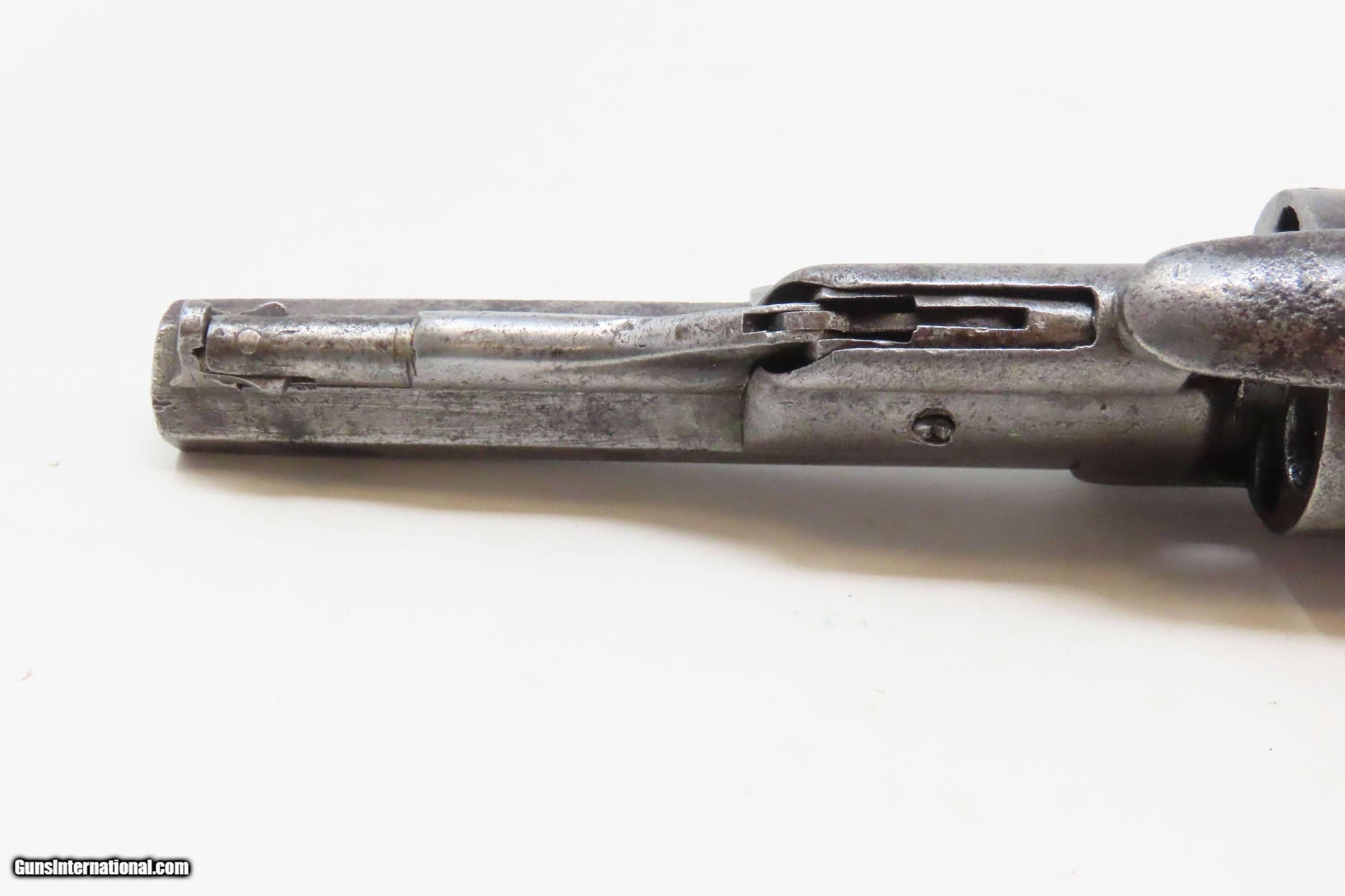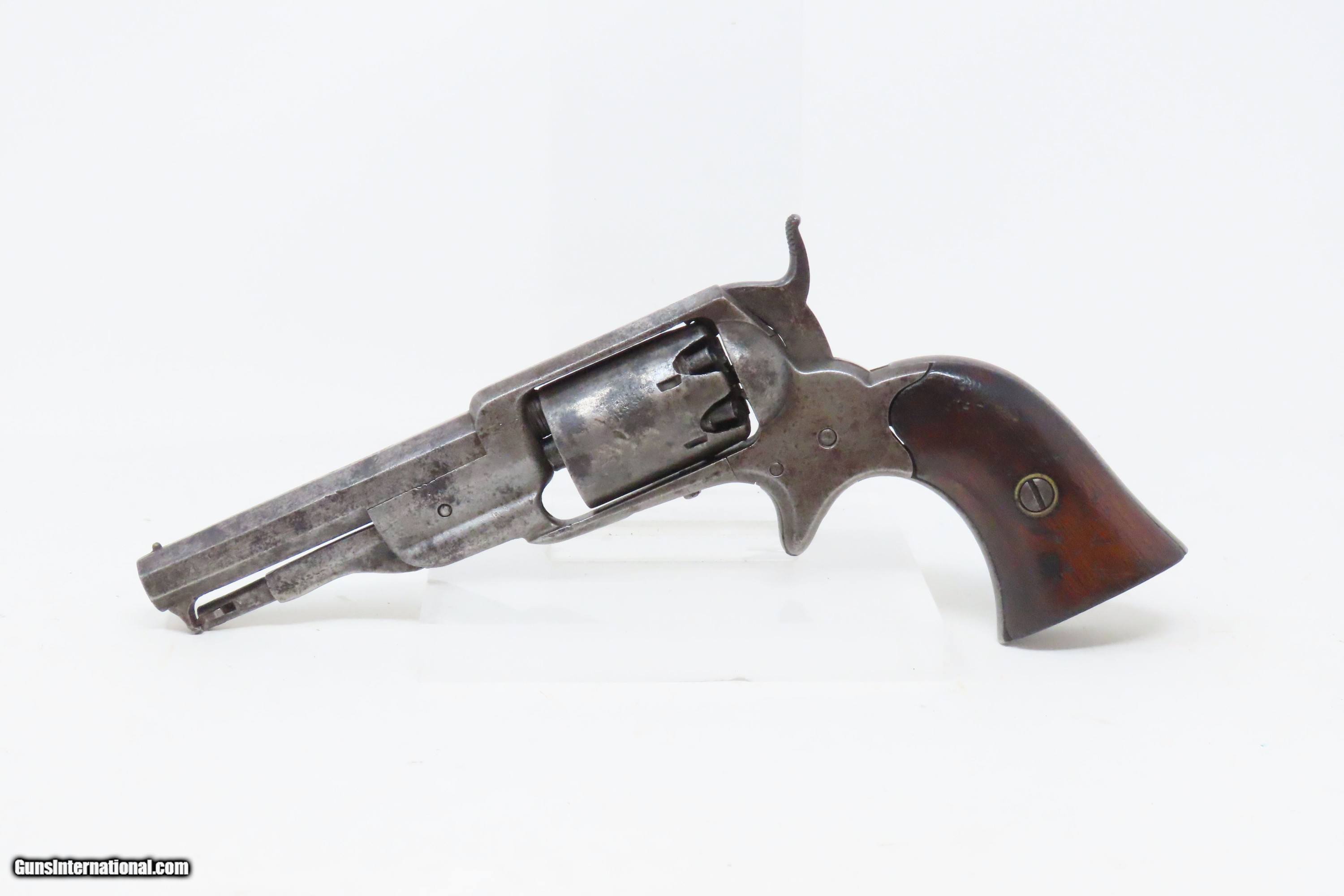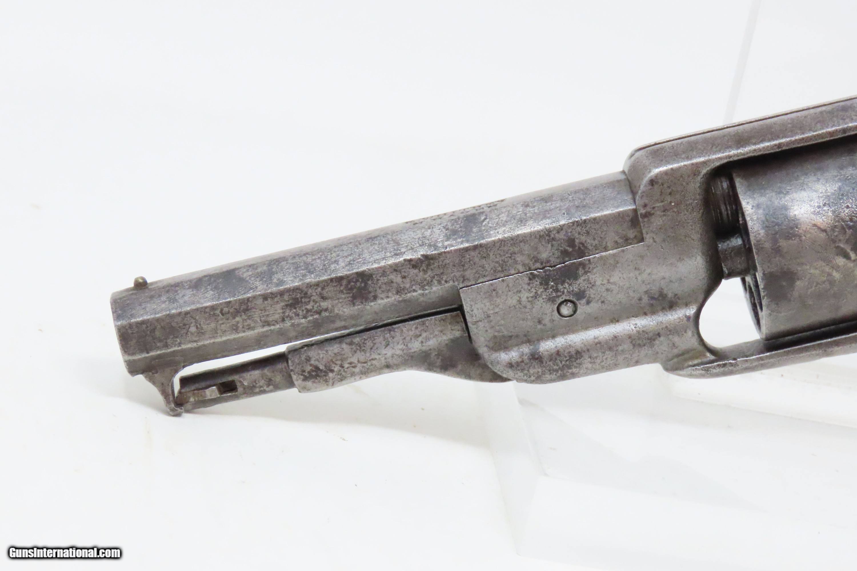 Description: CIVIL WAR Rare WHITNEY “New Model” POCKET Percussion Revolver 1 of < 2000 Spur Trigger Manufactured at the Whitneyville Armory Here we present an antique Whitney New Model Percussion Pocket Revolver, made circa 1860s in New Haven, Connecticut. Less than 2,000 of these revolvers are estimated to have been manufactured between 1860 and 1867. They are known to have been advertised at least as early as 1860 and likely designed specifically to compete with Colt's Model 1855 "Root" revolvers given it has many similarities. Given that, this is sometimes also known as the "Root Type Pocket Model." It has a small brass cone front sight and "E. WHITNEY/N. HAVEN" on top of the barrel and has, though very worn, a scroll engraved cylinder. Eli Whitney Jr., began running the family business in 1841. Whitney Jr. seized the opportunity in 1847 to manufacture 1,000 of Samuel Colt’s latest revolver the Colt Walker revolver. Production of this revolver helped both parties immensely as it kept Colt in business, and it allowed Whitney Jr. to tool up and gain experience making revolvers. With the expiration of Colt’s patents in 1857, Whitney began production of percussion revolvers based on Colt’s patents, some of them very closely copied. The overall condition is good. A gray patina has settled on the metal. Good bore. The action functions, but the cylinder does not properly lock up. Some remnants of the cylinder scene are present. Numbers match. Markings are legible. The right grip has a small toe repair. Here is a very desirable, Whitney New Model Pocket for your Civil War collection! Own the original! This is a legitimate antique and not a reproduction. Barrel is 3-1/2 inches. Caliber: .28 Percussion Overall condition as seen in photos. Very Fast. Very Safe. FREE SHIPPING WORLDWIDE. Delivered directly to your door by express mail! Guaranteed AUTHENTIC & Includes CERTIFICATE OF AUTHENTICITY. ancestryguns $1500 #240024 SOLD Antique: Yes |