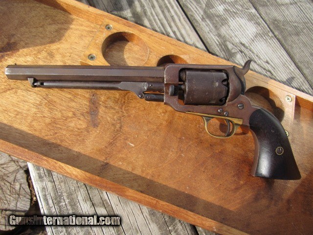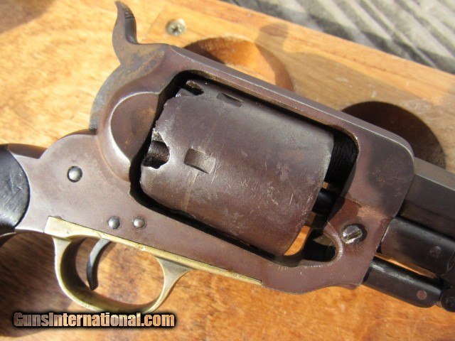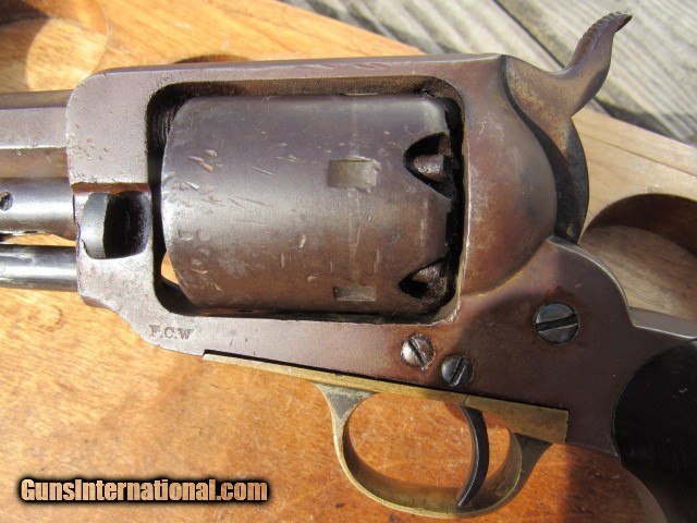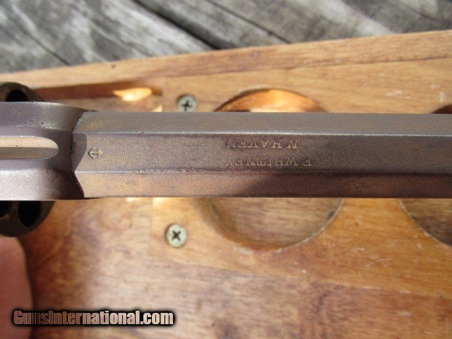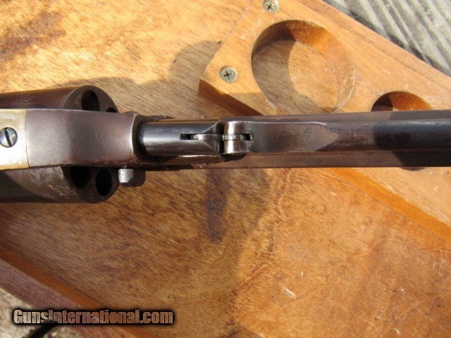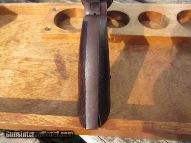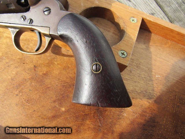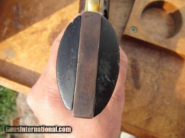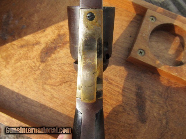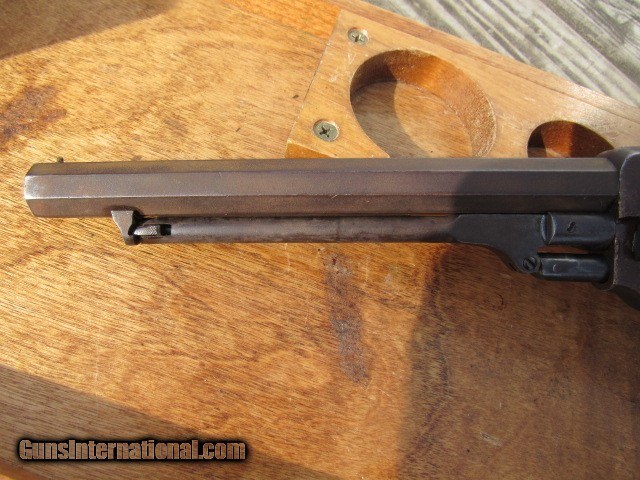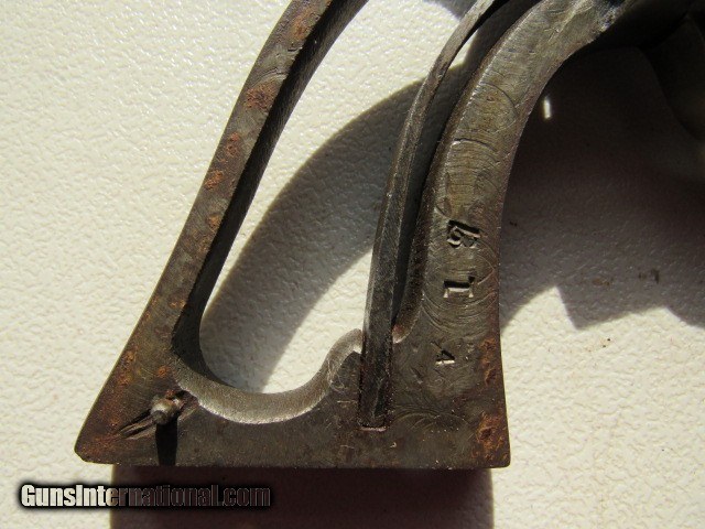 Description: Whitney Navy revolver, 2nd Model, 4th type, 36 caliber percussion, 6-shot cylinder, 7.75" octagon barrel, walnut grips, single action, serial number 23273, made early 1864 by the Whitney Arms Company in New Haven, CT. This is an extremely scarce Navy inspected and issued version - small anchor on top of barrel by breech, initials "FCW" on left side of frame for Frank C. Warner, who was a civilian employed by the Washington Navy Yard to inspect the government-purchased Whitneys, capital "E" on the inside of the right grip, matching rack number "17" appearing on the face of the cylinder/right side of the loading lever/right side of the grip/and underside of the barrel. Serial number 23273 appears on the bottom of the barrel, both sections of the loading rod, the rear of the cylinder, inside both grips, right side of frame under brass trigger guard and on the underside of the trigger guard. Also, the letters "O" and "E" appear on the left side of the frame under trigger guard and on the underside of the trigger guard. Right side of grip has the number "4" and back portion of the loading rod has an "O". 100% matching and original. Of all the Whitney Navys, only 900 of them were sent to Frank Warner for inspection. With the estimated survival rate of firearms of this vintage at 5 to 10%, about 45 to 90 of these would be existing today. CONDITION: All metal surfaces have turned a mix of light and dark brown. Brass trigger guard is uncleaned and retains a darker mustard color with traces of the tarnished silver plate intact. No cylinder scene remains but all 6 original nipples are present and completely intact. Walnut grips show nicks and dings with a small sliver missing back right at bottom, otherwise very sound with no refinishing seen. Very strong hammer spring and positive clicks to action. Bore is good with distinct, consistent rifling and of course the typical scattered black powder oxidation but no rings or bulges. Grades NRA Antique Very Good and a must have in your Civil War firearms collection. TERMS: No international sales. Antique so it can ship directly to your delivery address of choice. Free shipping by USPS Priority Mail with tracking. Payment by bank check, money order or personal check. All major credit cards accepted with 4% convenience fee added. Sold as a collectible only; a competent gunsmith should check it over before firing it. Always interested in Civil War, Old West and other firearms so please contact me if you have something for trade or sale. Thanks for looking and please check my other listings. 315.251.4799 with questions or concerns. SOLD Antique: Yes Handgun Caliber: .36 Manufacturer: Whitney Model: Navy Serial Number: 23273 Barrel Length: 7.5" Octagon Condition: Very good Metal Condition: Very good Wood Condition: Very good Bore Condition: Good Action: Single Action Revolver Stock: Walnut Manufacture Date: 1864 Item Location: New York |
