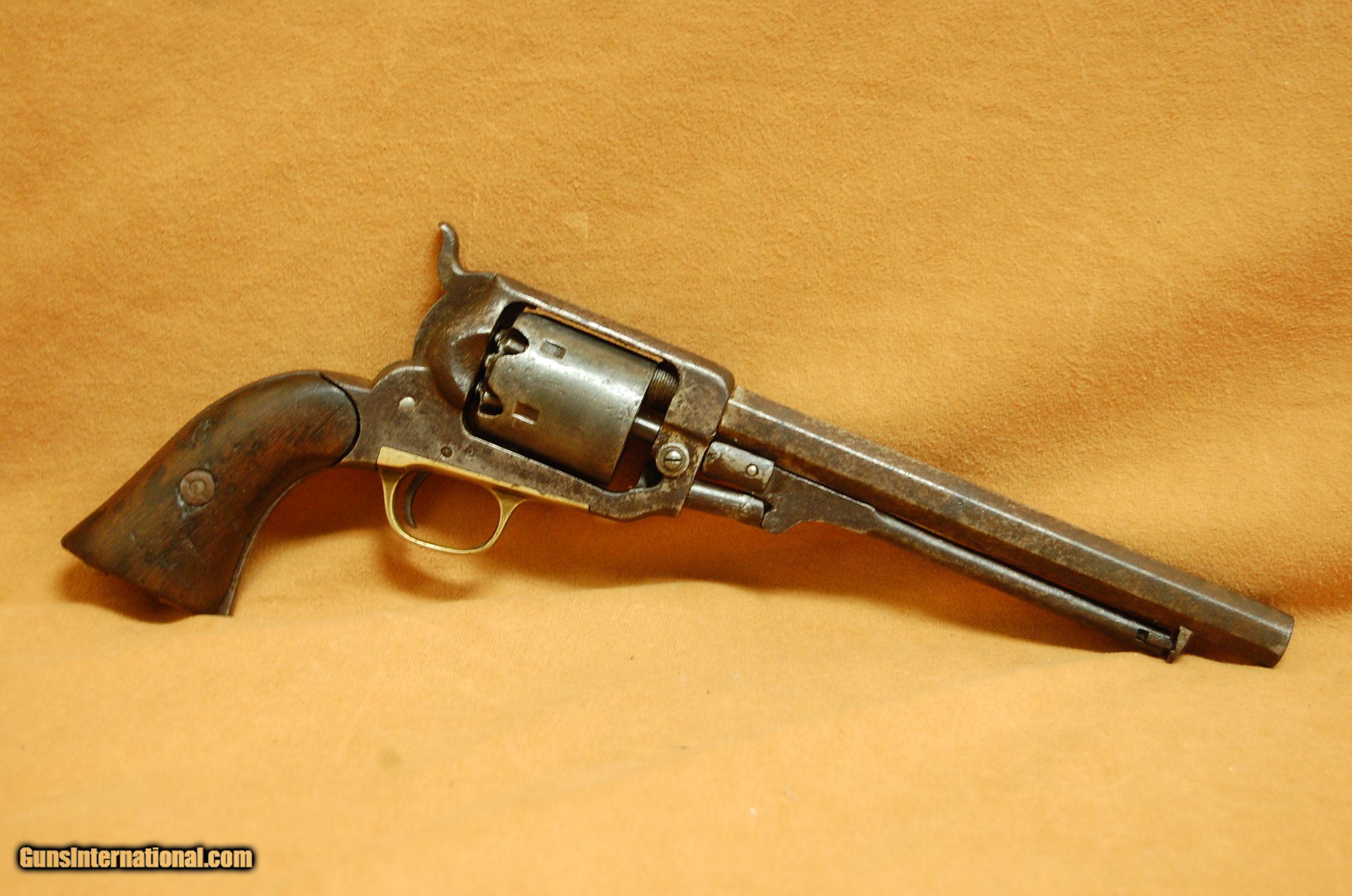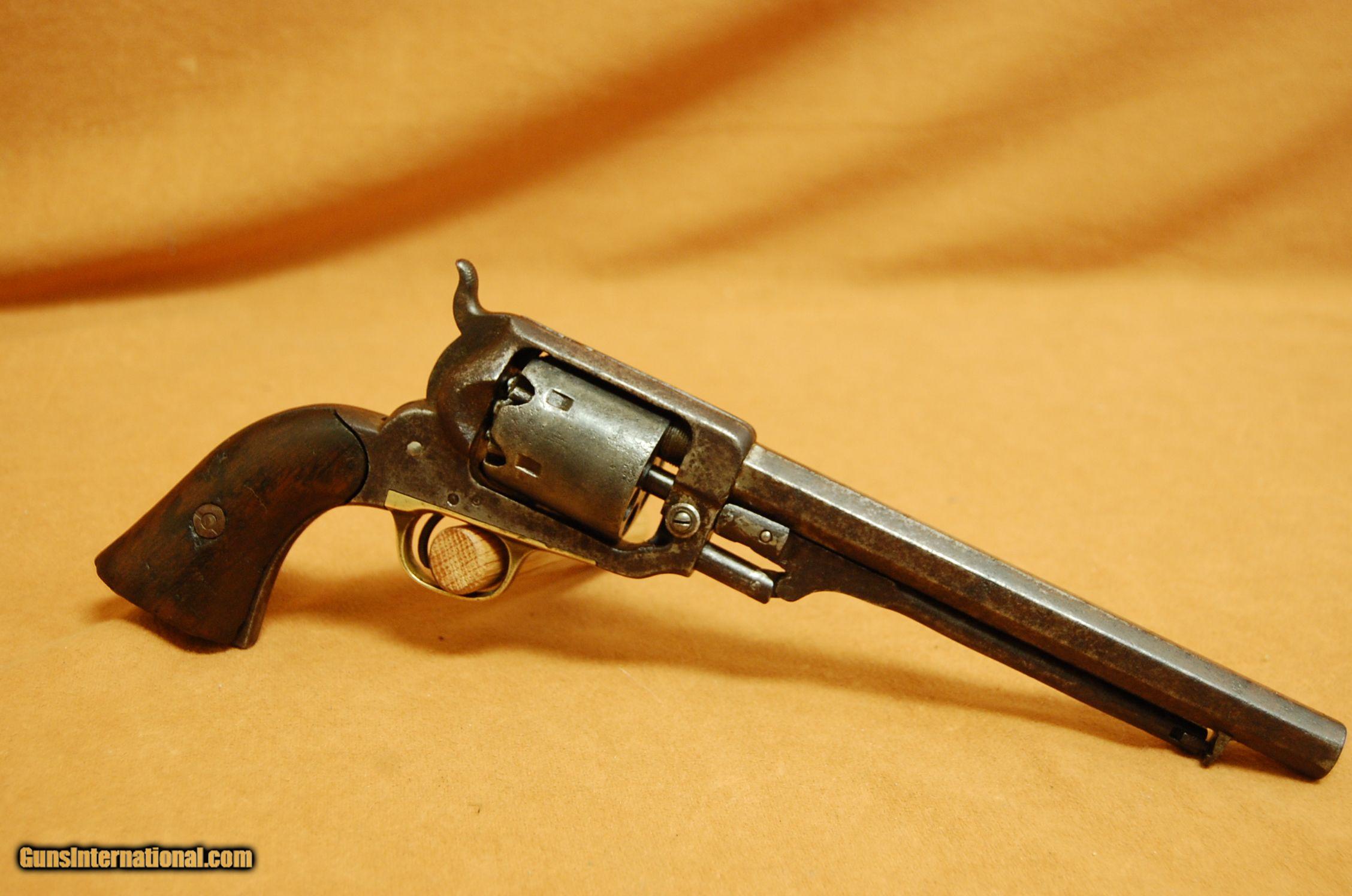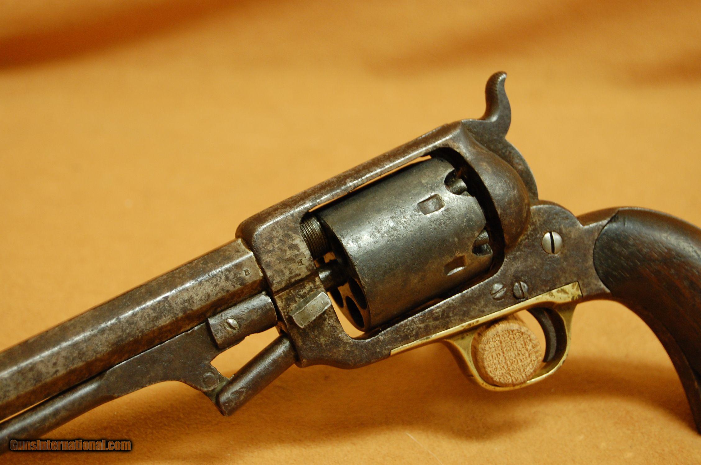 Description: The most famous and easily recognized revolver manufactured by Eli Whitney, Jr. was his "Navy" model revolver. The name "Navy" referred to the caliber and size of the revolver, which is .36 caliber and has a 7-5/8" barrel. These revolvers showed up just prior to the Civil War and were purchased by the US Army and Navy. Approximately 35,000 were manufactured. Our example has a faint inspector's cartouche on the left grip panel. The cylinder scene and barrel address are not visible. The serial number is present on the barrel, loading lever, and frame. The gun is mechanically working and the cylinder rotates and locks appropriately. The inspector initial on the frame, barrel, and trigger guard are visible. Overall, the finish is a mottled patina, with little of the original finish present. All items are also available for sale in our brick & mortar store and are subject to prior sale. Think long, think wrong. We are always buying unique and collectible single firearms and collections. Please give us a call at 859-278-8370 to discuss what you have available. We also offer free appraisals and guarantee TOP DOLLAR PAID for your unique and collectible firearms. Payment On firearms, we typically only accept credit cards or money orders/cashier's checks.