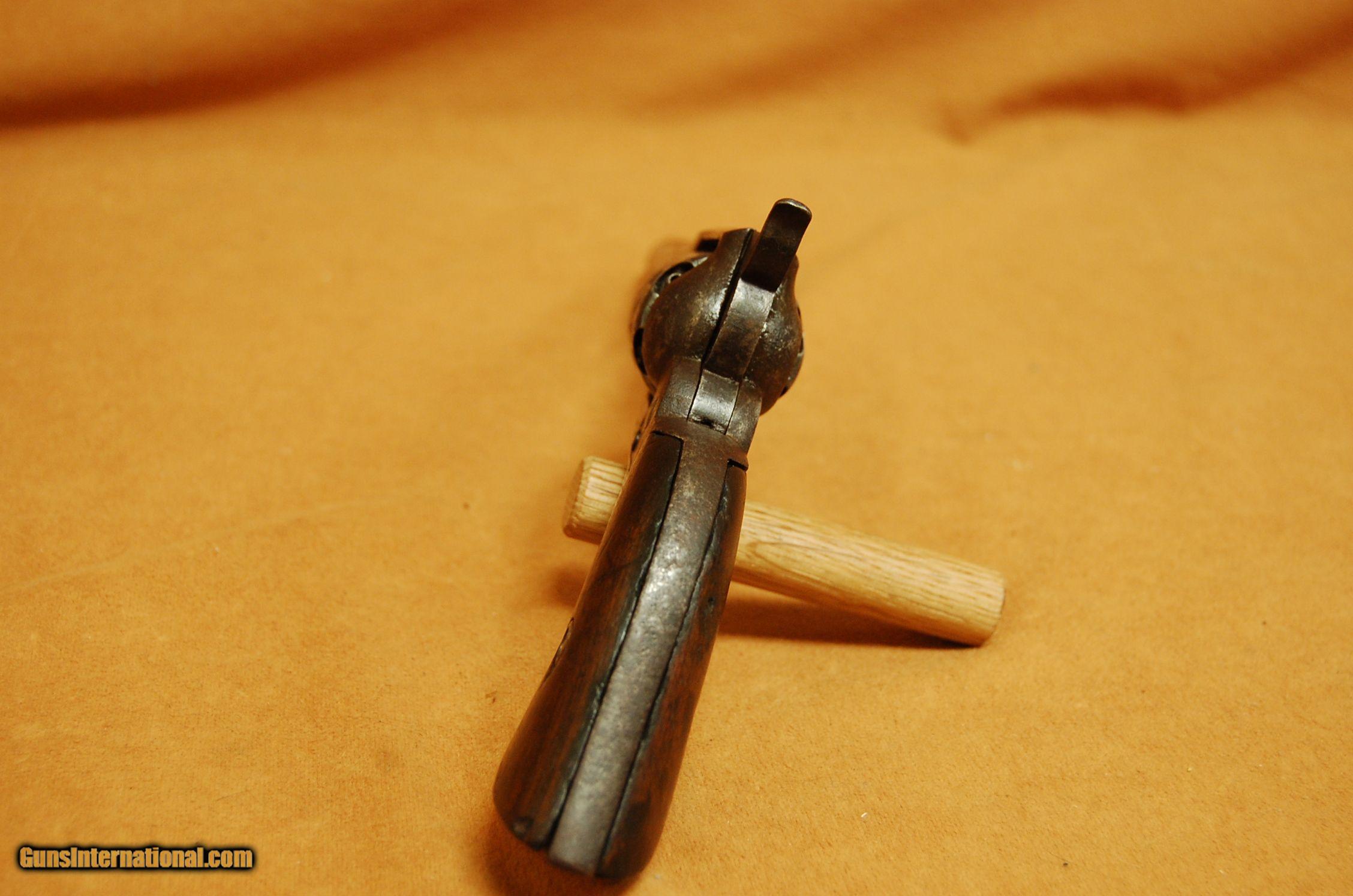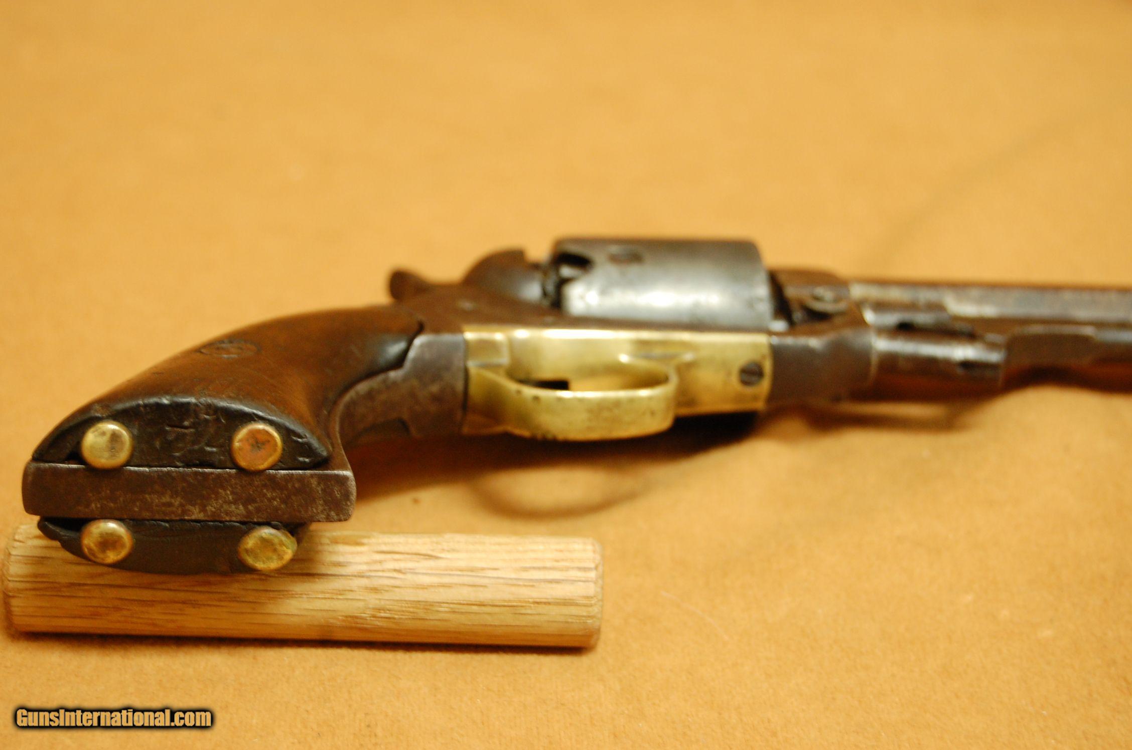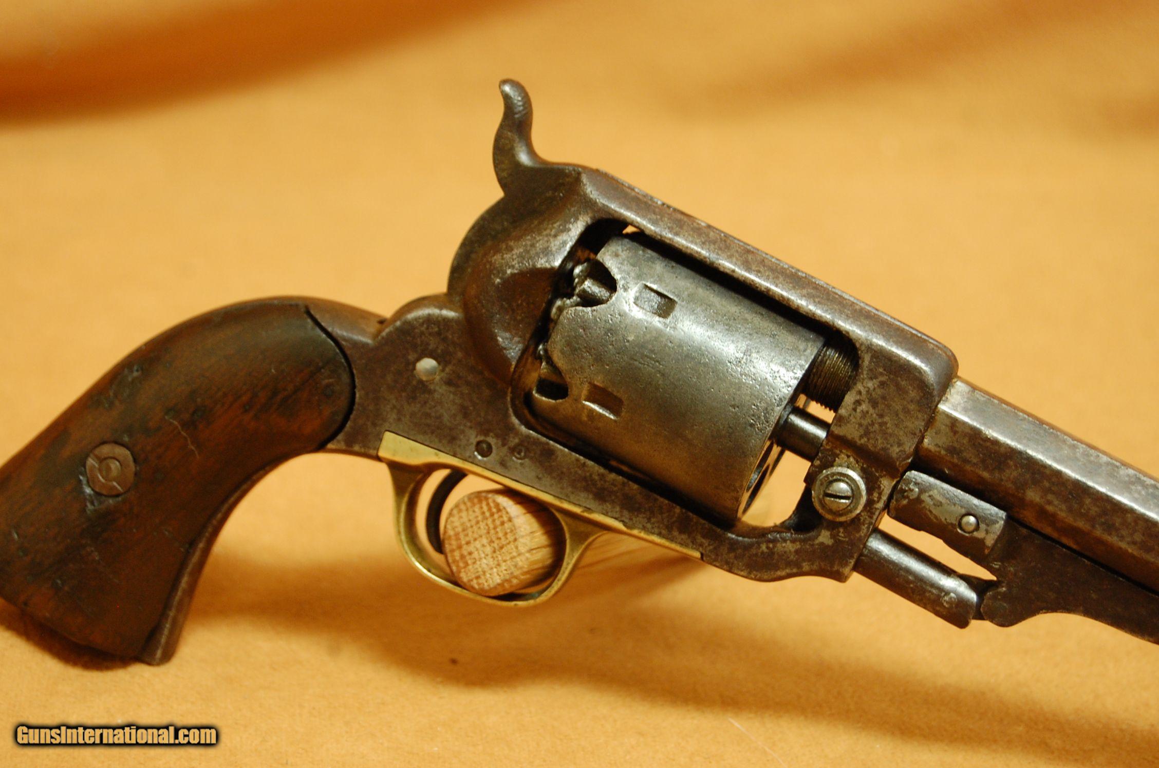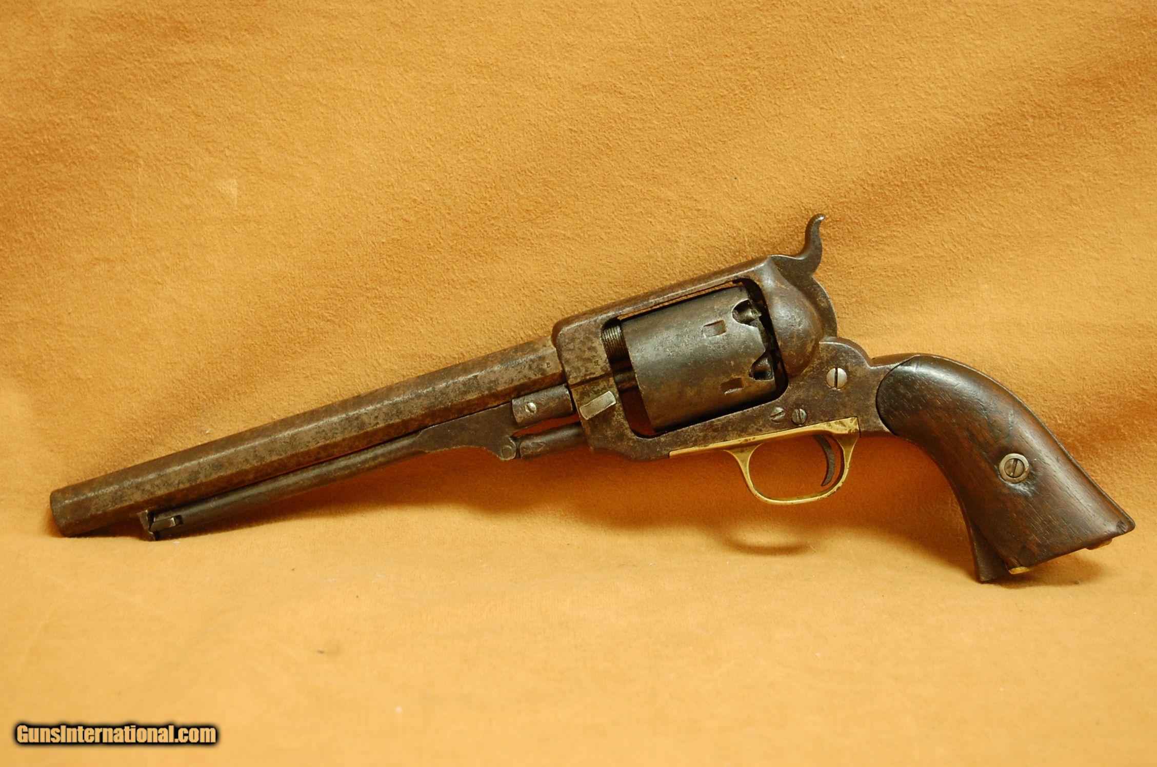 Description: The most famous and easily recognized revolver manufactured by Eli Whitney, Jr. was his "Navy" model revolver. The name "Navy" referred to the caliber and size of the revolver, which is .36 caliber and has a 7-5/8" barrel. These revolvers showed up just prior to the Civil War and were purchased by the US Army and Navy. Approximately 35,000 were manufactured. Our example has a faint inspector's cartouche on the left grip panel. The cylinder scene and barrel address are not visible. The serial number is present on the barrel, loading lever, and frame. The gun is mechanically working and the cylinder rotates and locks appropriately. The inspector initial on the frame, barrel, and trigger guard are visible. Overall, the finish is a mottled patina, with little of the original finish present. All items are also available for sale in our brick & mortar store and are subject to prior sale. Think long, think wrong. We are always buying unique and collectible single firearms and collections. Please give us a call at 859-278-8370 to discuss what you have available. We also offer free appraisals and guarantee TOP DOLLAR PAID for your unique and collectible firearms. Payment On firearms, we typically only accept credit cards or money orders/cashier's checks.