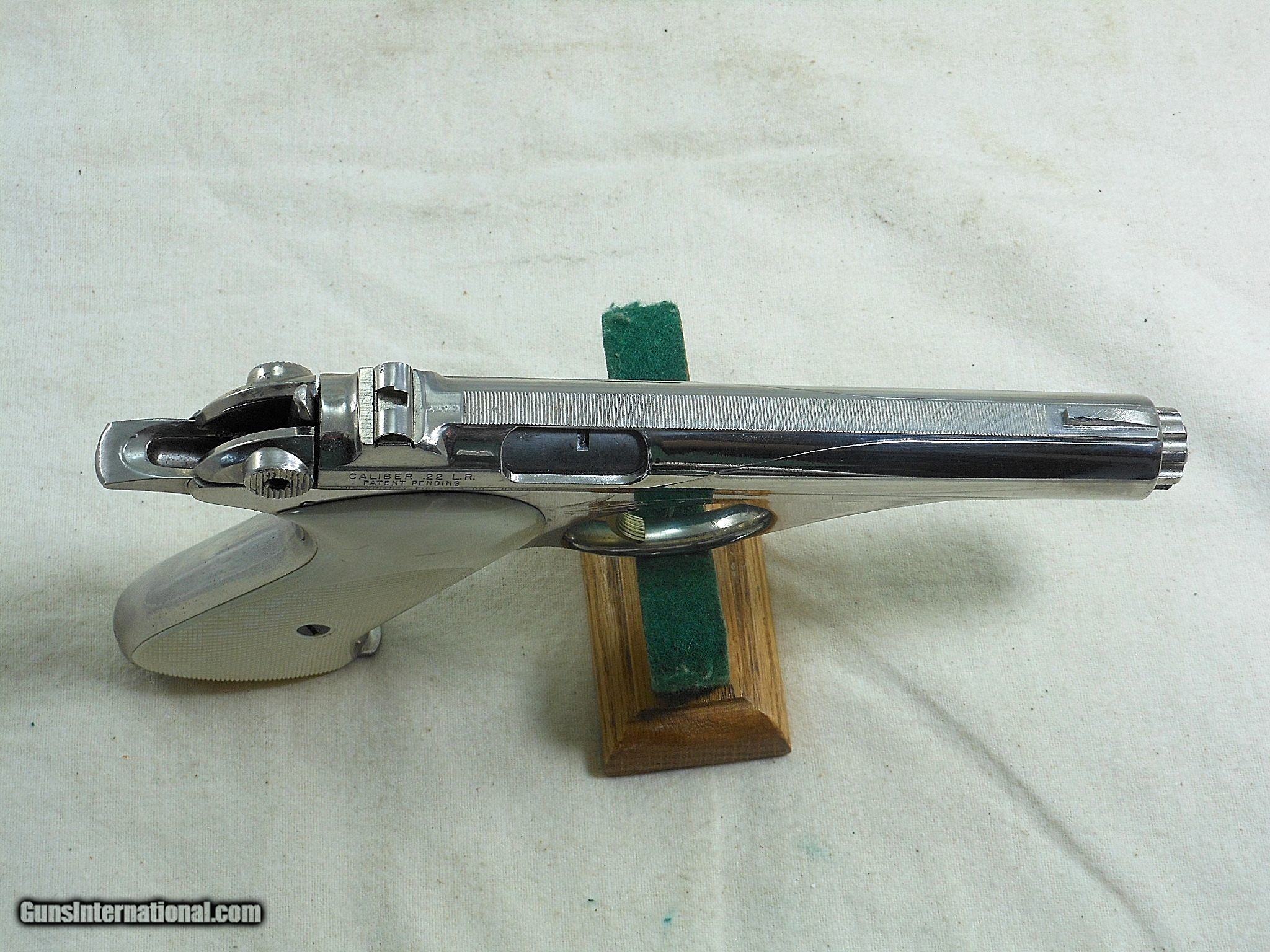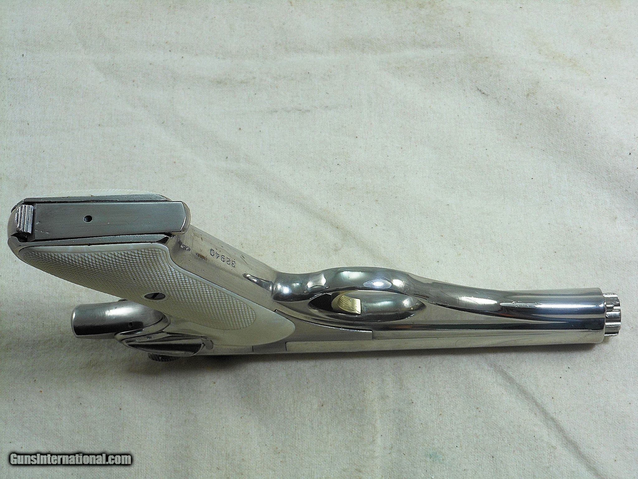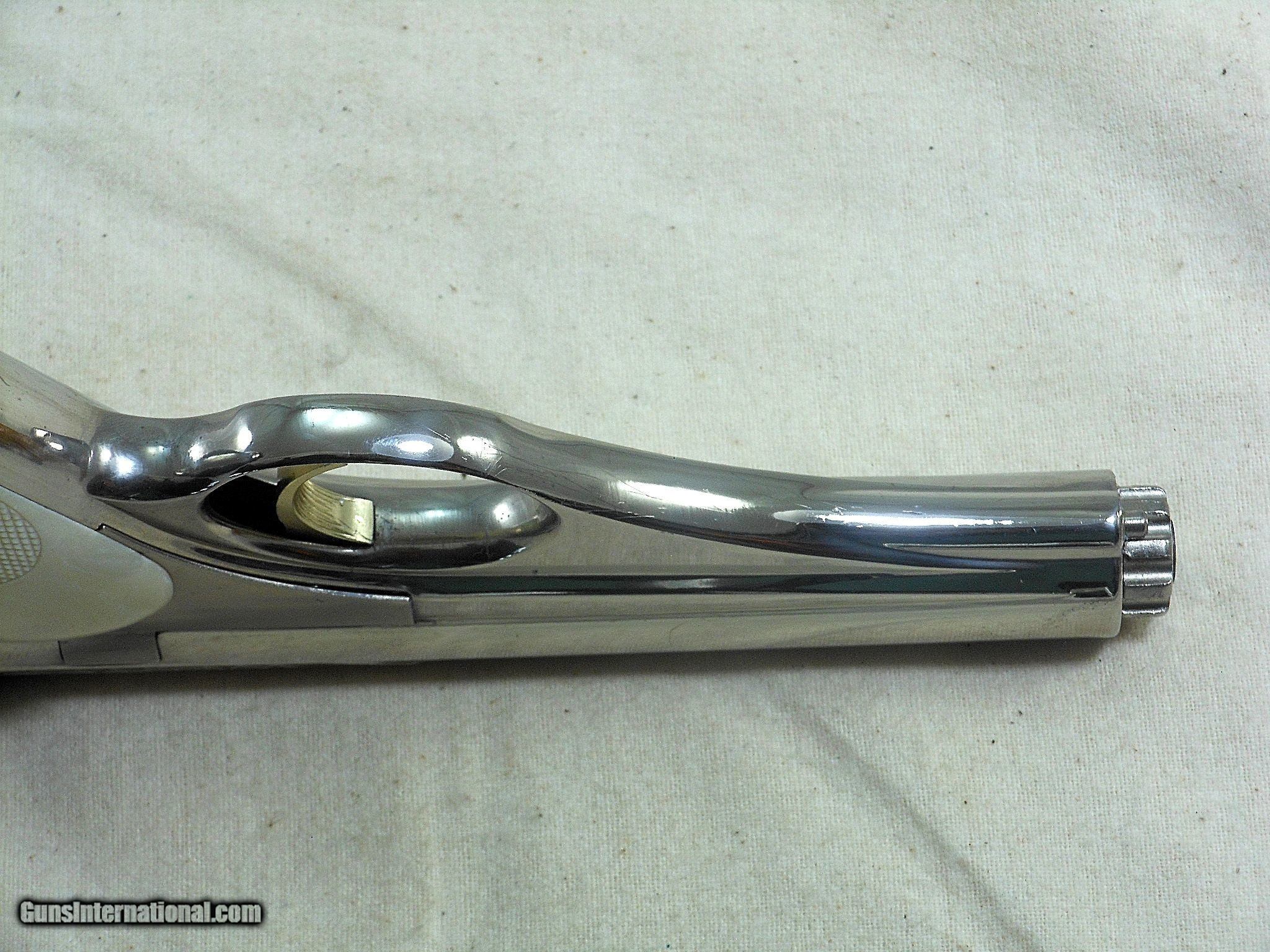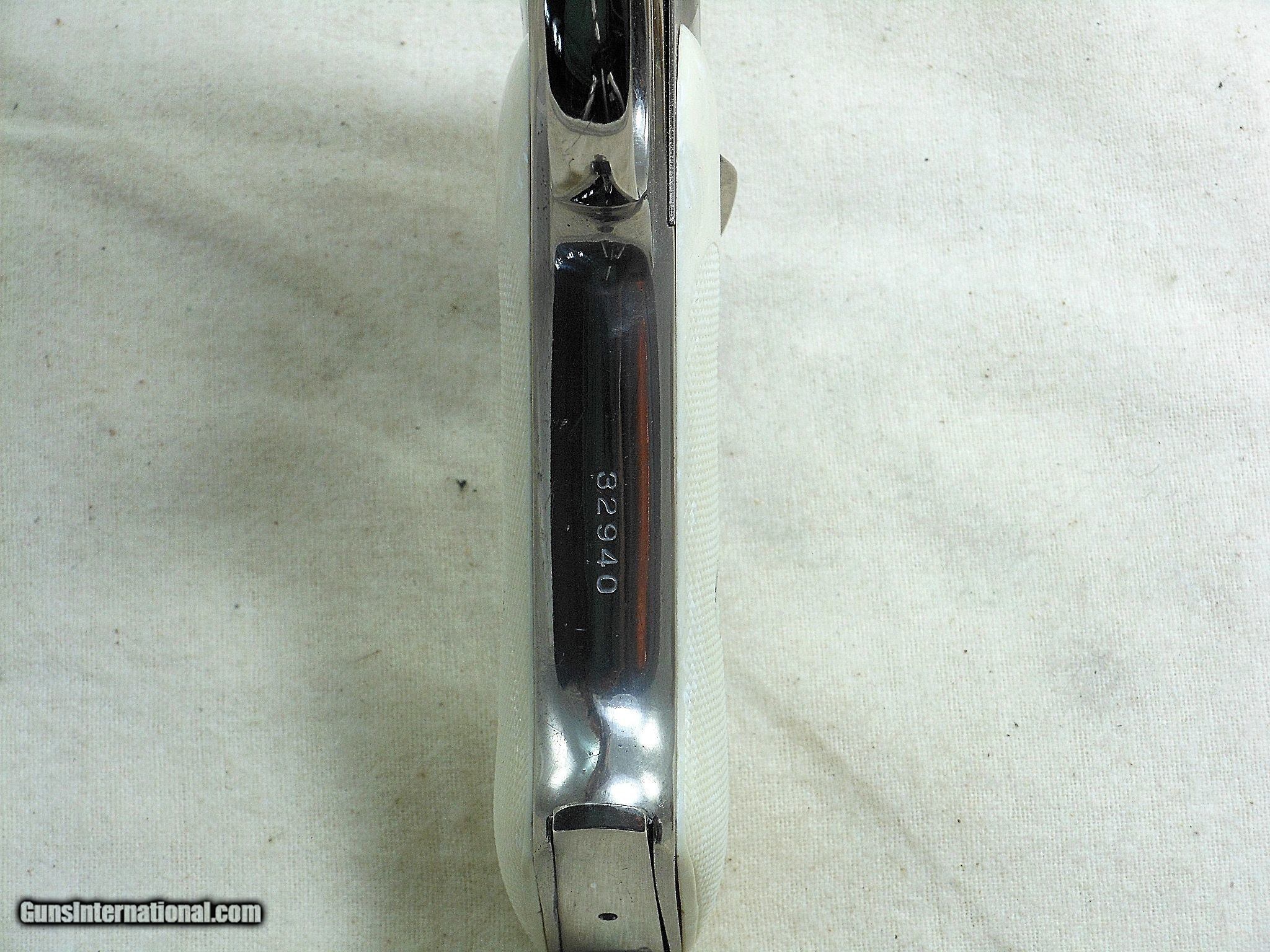 Description: These Whitney Wolverines were produced between 1955 to 1962. This pistol's serial number is 32940. This Wolverine is in near new condition. It has the standard 4 1/2 inch barrel. The bore is in minty condition. This pistol has the rare Full Nickel finish. This pistol is highly polished to make the nickel finish really stand out! The only blemish is above the trigger on the right side of the pistol. The rest of the finish is in new condition. This pistol also has the factory gold toned trigger. The magazine floor plate is also nickel plated. The grips are factory white plastic. These grips are in new condition. This pistol shows no sign of being fired or being used. This is a real stunning looking pistol with this finish! The original box is serial numbered to this pistol The box shows storage wear. The yellow plastic liner has some damage on the top area of where the gun would fit. The liner also has a compartment to place a box of 22 long rifle ammunition. These Nickel finished Wolverines are quite rare as they only produced around 900 pistols with this rare finish. Search for hlvfine guns on google for more details. Curio&Relic M.L.V. LLLK (2) F. No. 536 -21 SOLD Curio/Relic: Yes Handgun Caliber: .22 Long Rifle Manufacturer: Whitney Arms Co. Model: Wolverine Serial Number: 32940 Barrel Length: 4 1/2 Inch Condition: Near New Bore Condition: Minty Barrel Type: Take Down Action: Self Loading Finish: Nickel Sights: Standard Manufacture Date: 1955 To 1962 Extras: Original Box |