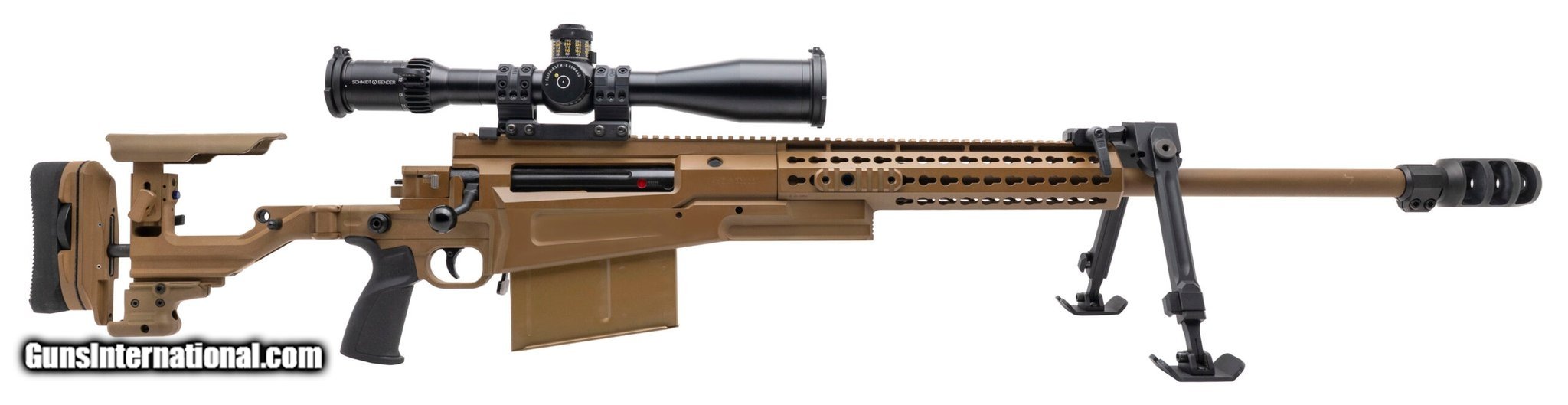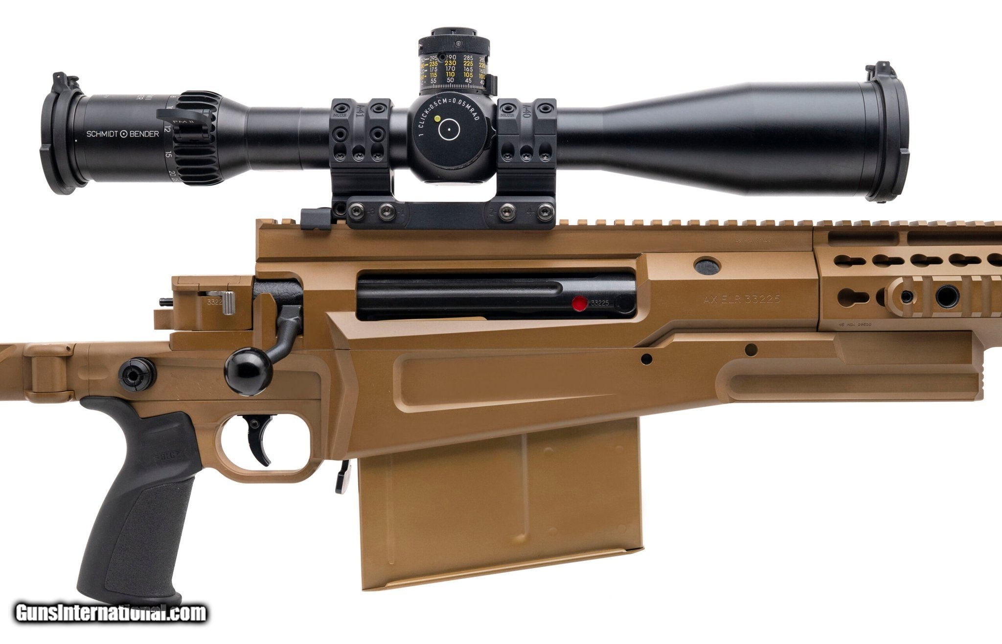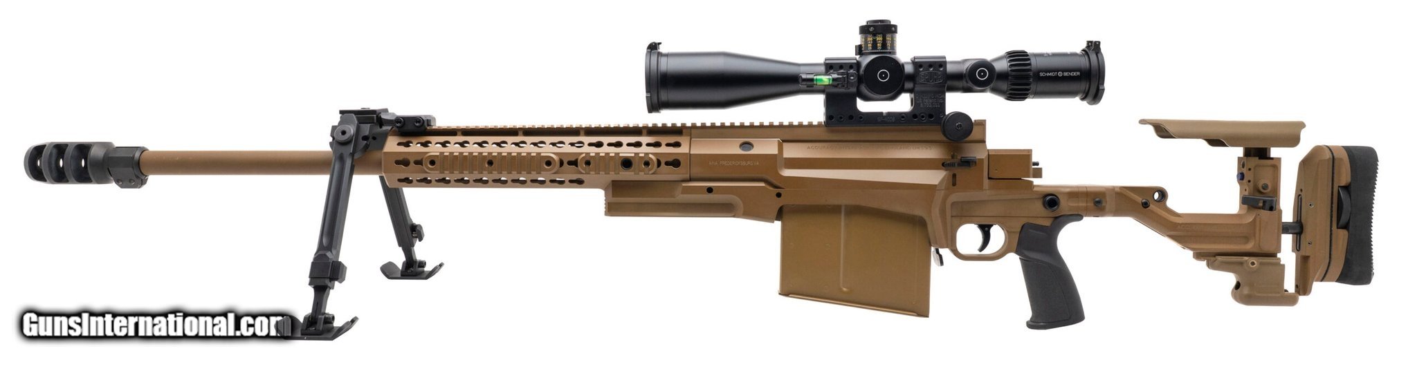 Description: Guns Listing ID: 524546 SN: 33225. Modern production, .50 BMG with a 27\" barrel w/AI triple chamber muzzle brake. Bore is bright with strong rifling. Bolt action heavy marksman rifle with a Sphur scope mount w/Schmidt & Bender 5-45x56 P MII High Power scope and Kipps bipod. FDE Finish and side folding sniper stock are in very good condition. Comes with extra magazine. (R44532) SOLD Manufacturer: ACCURACY INTERNATIONAL Model: AX ELR Caliber Info: .50 BMG Condition: Used - Non-Certified Barrels: 27 Action: BOLT ACTION Finish: fde |
