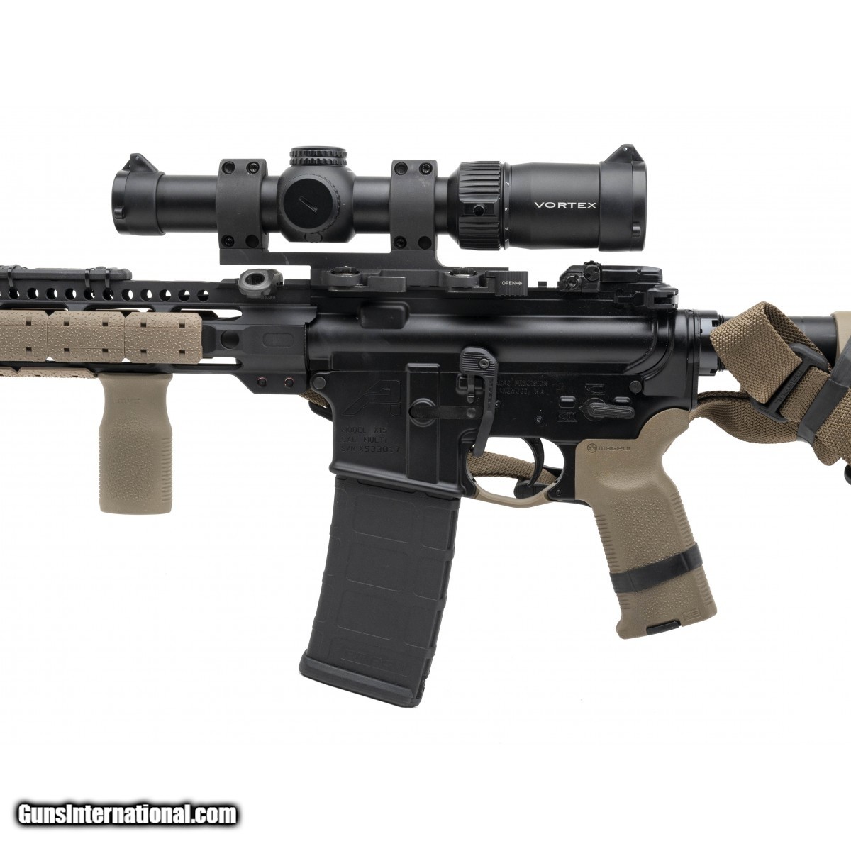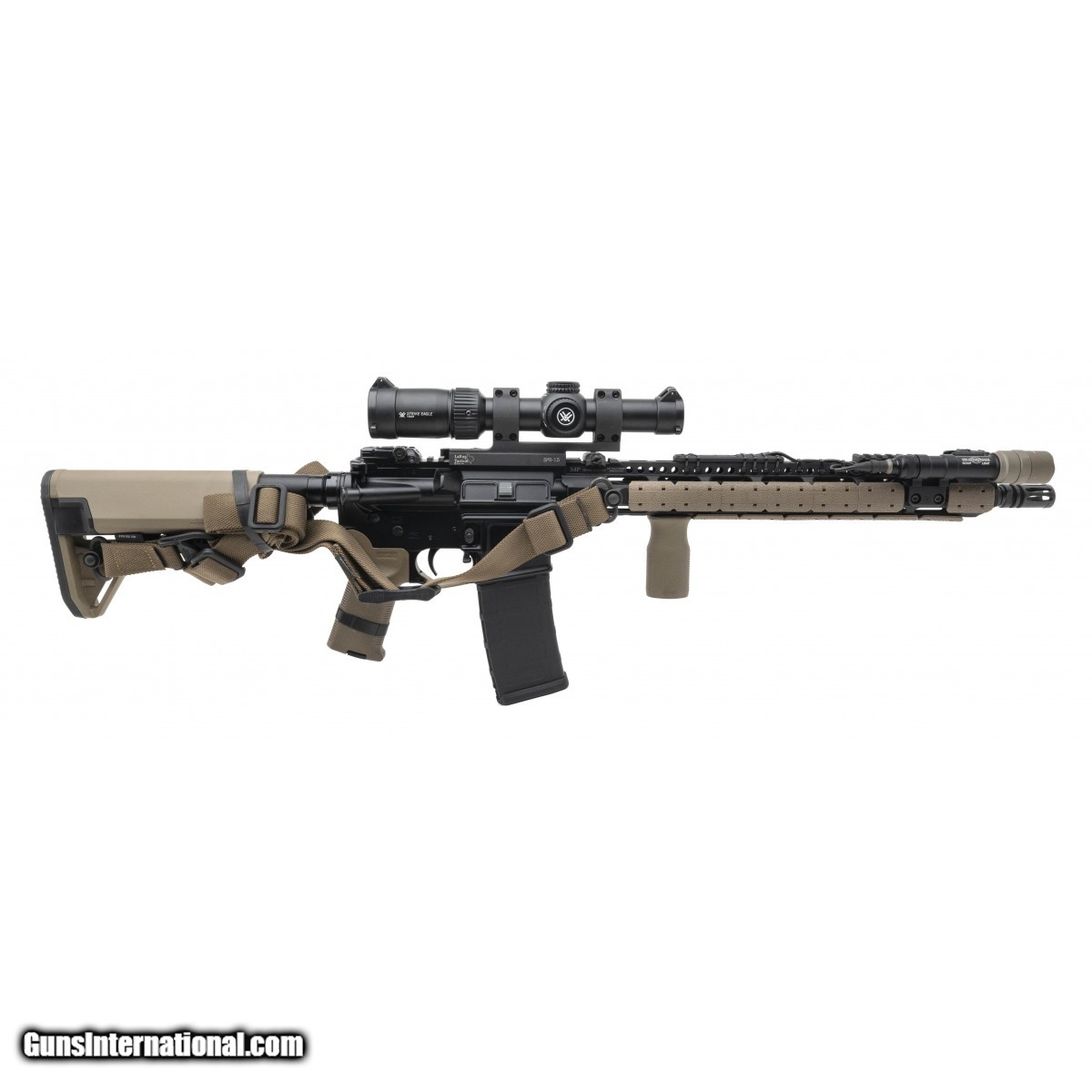 SN: X533017. Modern production. 5.56 with a 16"" barrel. Bore is excellent. Direct Impingement AR. Finish and Magpul telescoping stock are in excellent condition. Rifle comes with a Vortex Strike Eagle 1-8X optic, 15"" Midwest Industries forend, Surefire Scout light. and sling. Overall excellent condition.