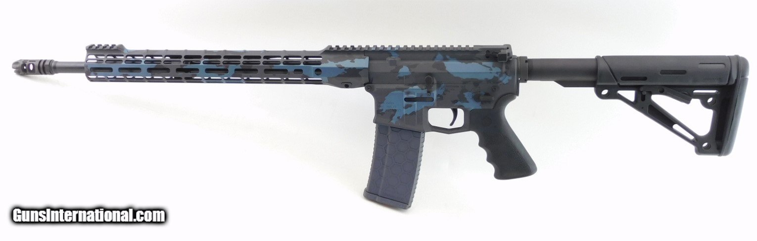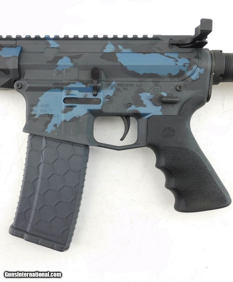 Description: Aero Precision M4E1 AR-15 Rifle 5.56, 18" bbl, bright shiny bore, good rifling, flash hider, blued finish, 15" MLok hand guard with 2 1/2" Picatinny top rails near upper - muzzle, grey/blue/black camo finish hand guard - upper - lower, grey 30 round magazine, black pistol grip, and SB adjustable arm brace. Very clean rifle for your collection! Add 3% for Credit Card Shipping $35.00 SOLD |