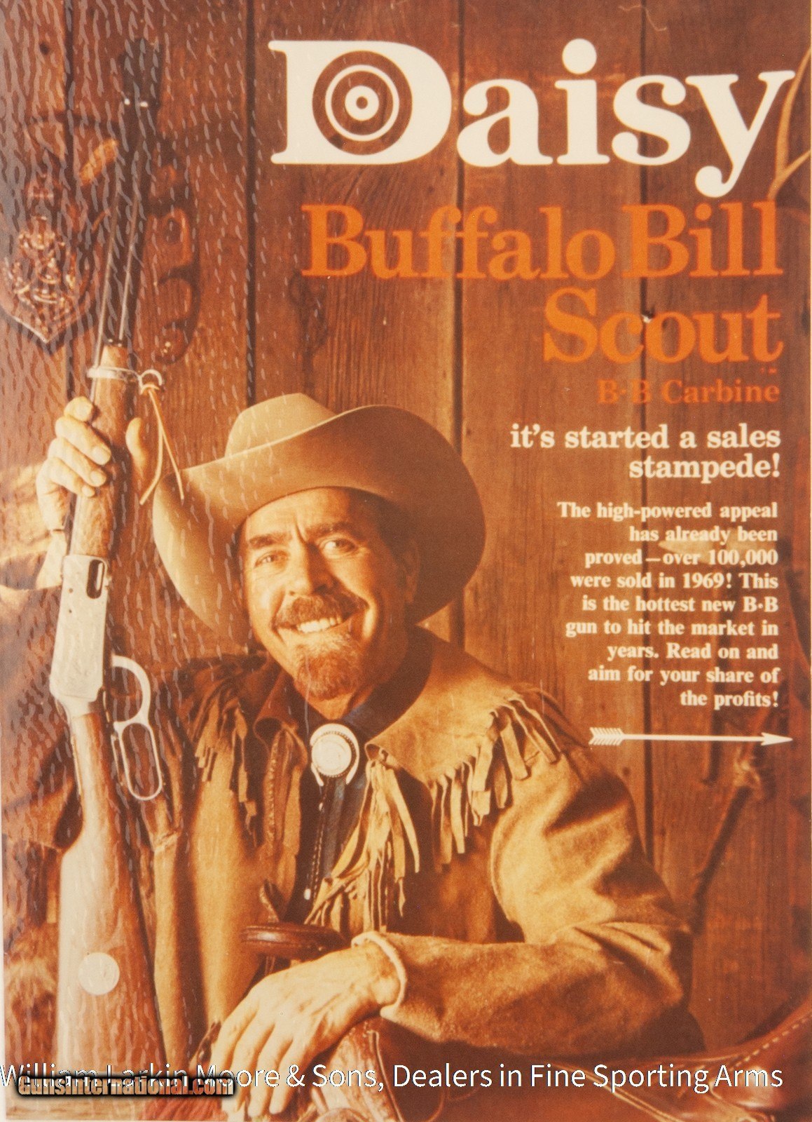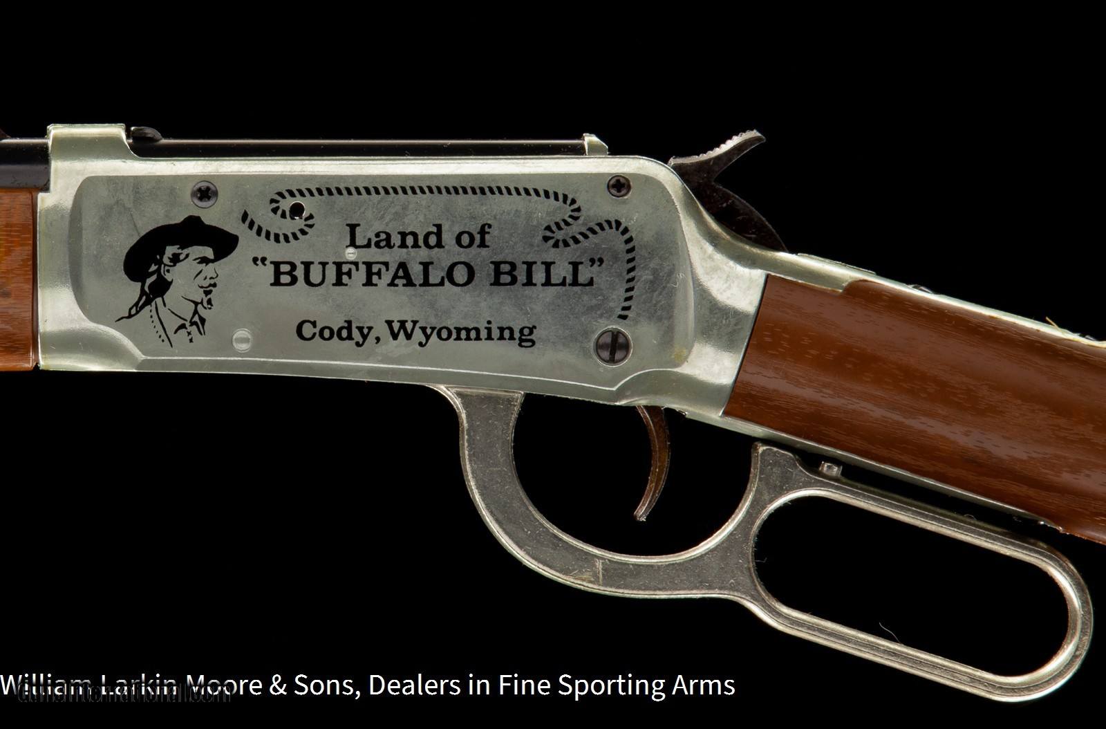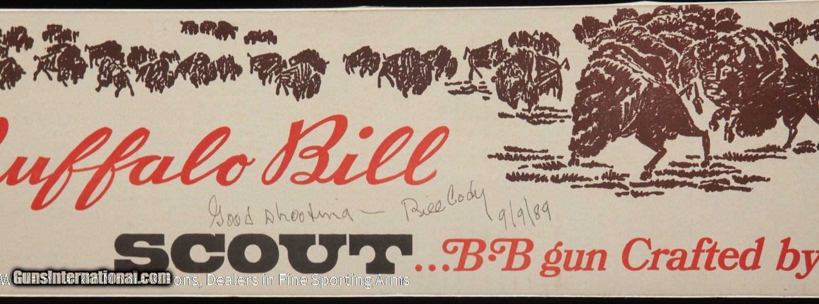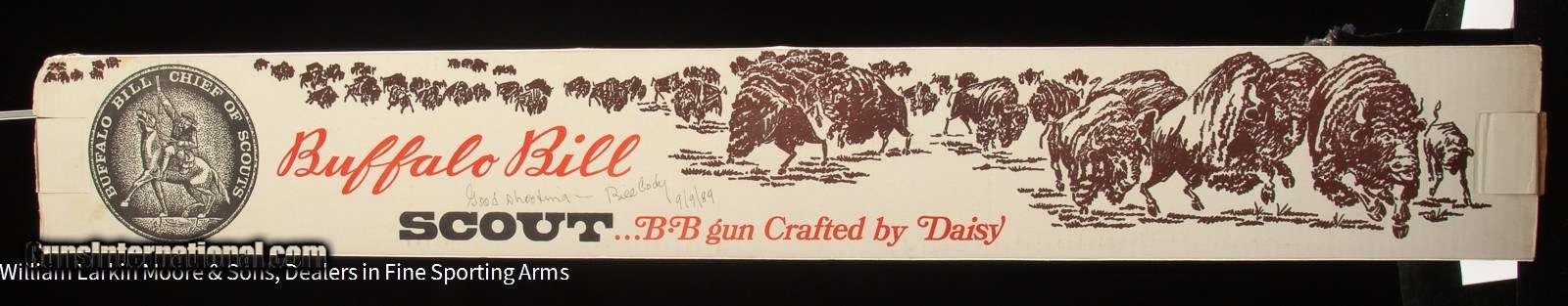 Description: D # 7907 Make DAISY Model Bill Cody's Buffalo Bill Scout 30-30 Configuration BB gun Gauge / Caliber .177 BB Price $1,000.00 Serial # NSN Country of Origin America Stock Configuration Straight Grip, Medallion in stock Forearm Type Carbine style Receiver Finish Coin Finish Other Options Original box signed by Bill Cody III Condition AS NEW IN BOX, UNFIRED Other Details Mfg 1969, This model was only sold at the Cody Museum in Cody WY, Very collectible and new in the box with the box signed by Bill Cody III SOLD |