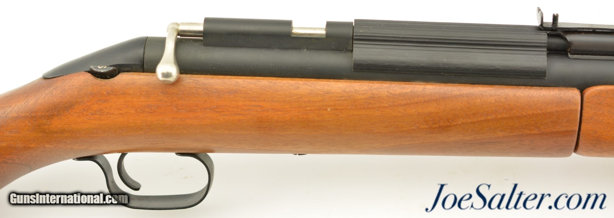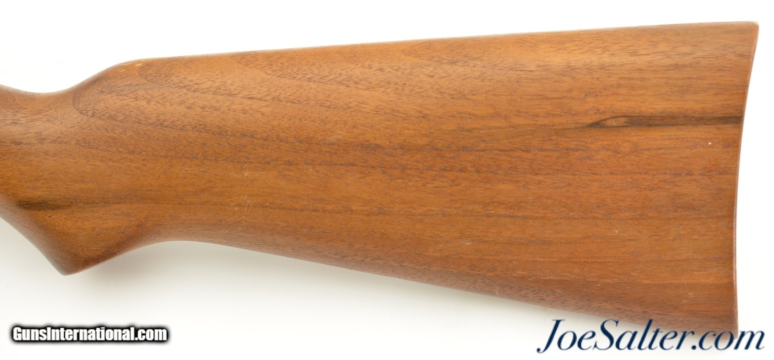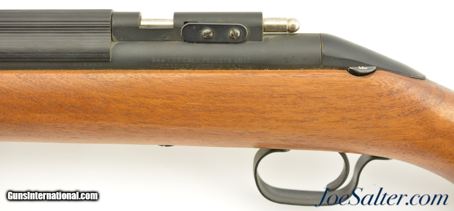 Description: Serial #243361, 5mm (.20 Cal.) pellet, 19 one half inch rifled barrel with an excellent bore. This is the Sheridan Products Inc. "Blue Streak" series "C" air pellet rifle manufactured in Racine, Wisconsin featuring the rocker style safety, and full walnut stock. In excellent condition the barrel retains virtually all of the original finish with some light scratches and use marks and the stock is likewise excellent, solid, with some small contusions and light scratches. It appears to function properly with tight seals. An excellent example of this classic pellet rifle. SOLD |