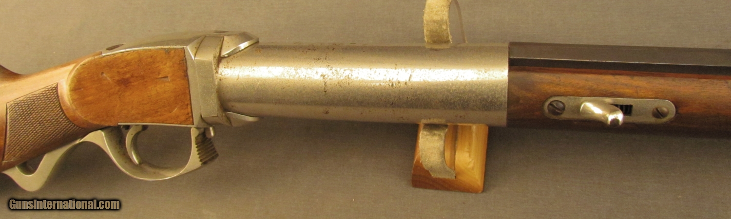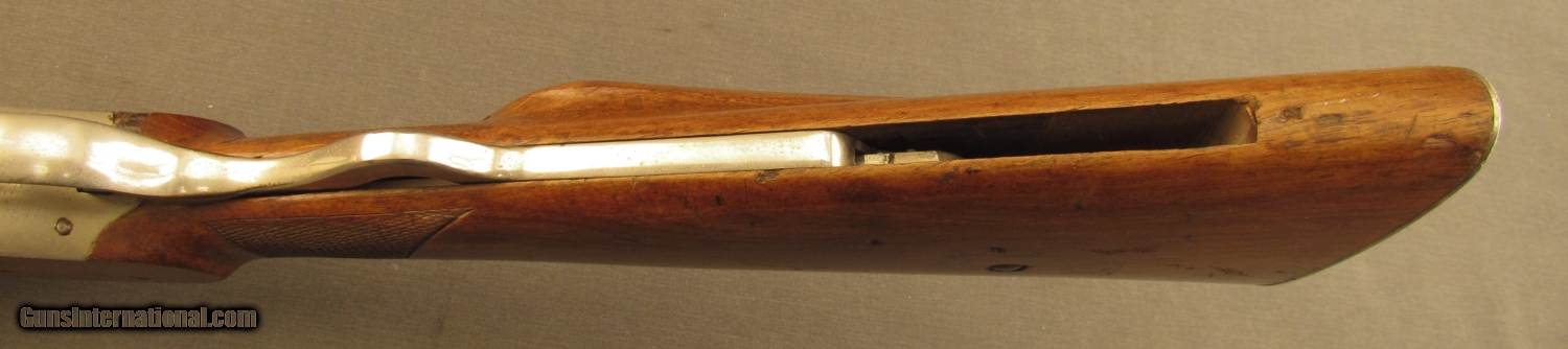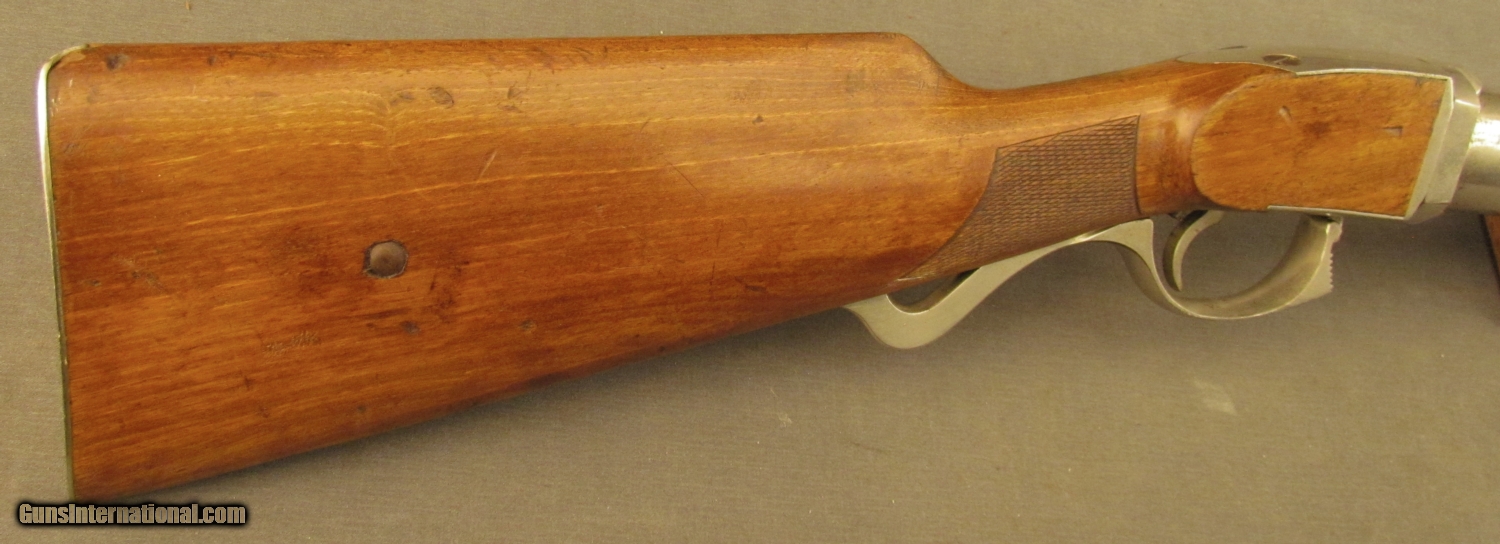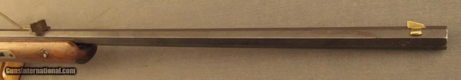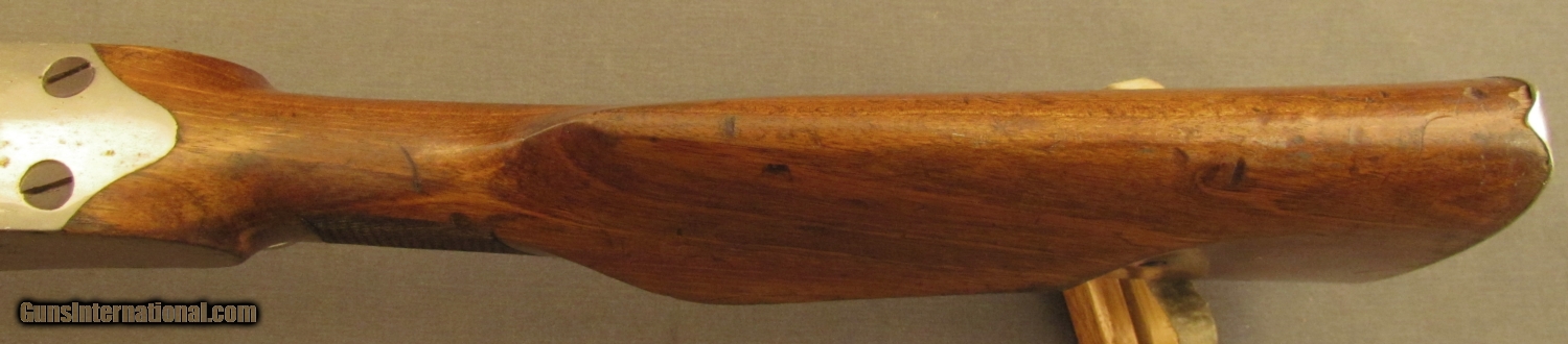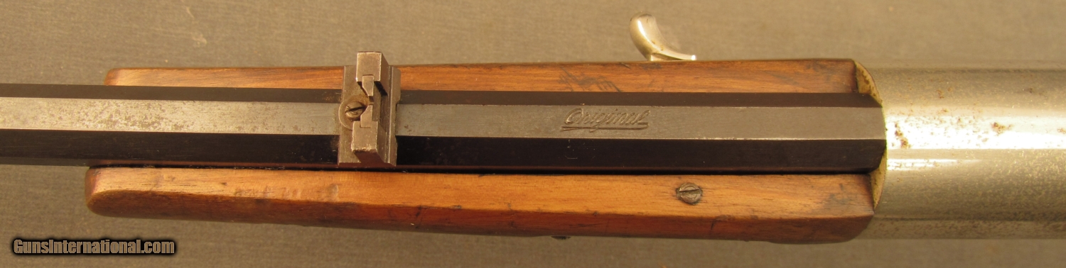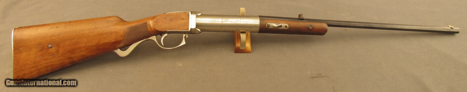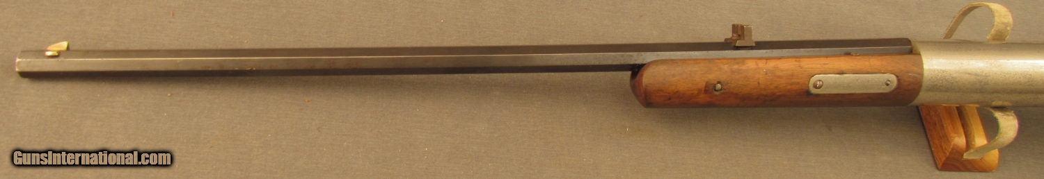 Description: This old air rifle remains in very good condition with strong spring and still shoots well. Barrel is marked "Original" indicating production between 1900 and 1930. Gun cocks by levering the trigger guard and has no safety. Trigger is adjustable and sights are drift adjustable for windage. This gun has the upgraded nickel finish on action and lever with 80% nickel remaining showing specks of loss. The barrel retains 70% blue with areas of staining and light corrosion. Stock shows typical dings ans wear with no large cracks or major damage. This gun shoots .25 caliber darts. SOLD Manufacturer: Original Model: Air Caliber Info: .25 Cal Gauge Info: .25 Cal |