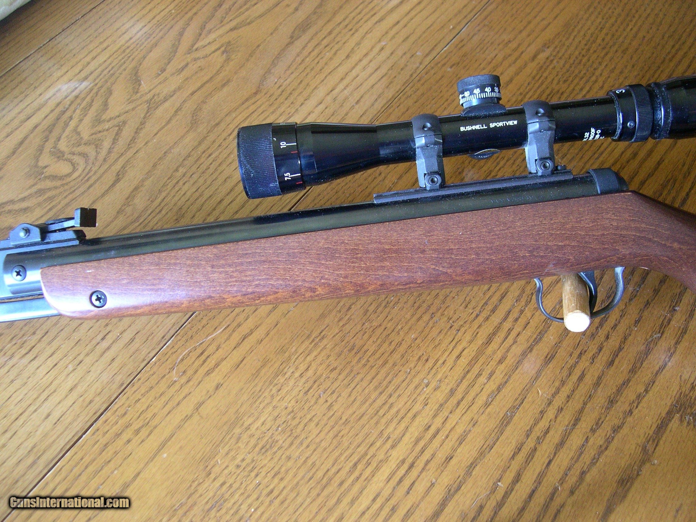 Description: This Break Barrel 177 cal, will shoot dimes at 30 yds, with an adjustable trigger that you can make a hair trigger, very smooth ! Very powerful also, a pest rifle for sure, wood is mint, as is all metal parts, with a Busnell 3x9x40 air gun scope, clear as new with duplex cross hairs, A great buy, if your looking for a German made precision air rifle, in like new condition!! SOLD |