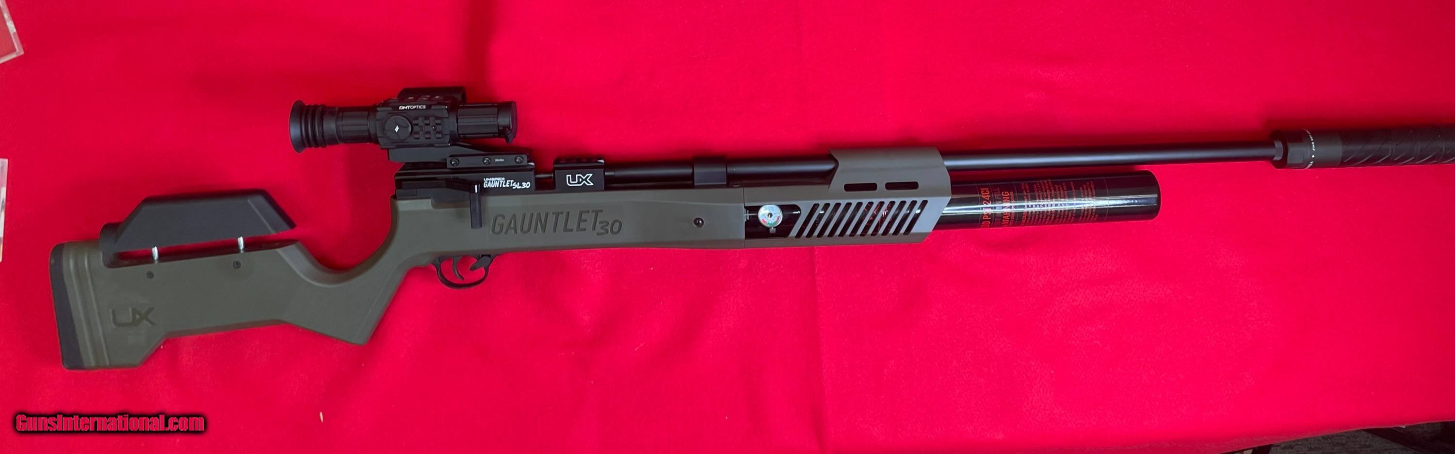 Description: Like New Donnyfi suppressor DT, infared Zulus HD 5-20 scope The Umarex Gauntlet SL30 PCP 30 Caliber Air Rifle is a natural evolution of the hot selling and high perfoming .30 caliber Gaunlet platform. With a side-lever cocking mechanism, shooting the big Gauntlet becomes easier than ever giving the shooter improved ergonomics and interaction with the rifle. The Gauntlet SL30 uses the same 7-shot magazine and shoots with the same hard hitting performance ofthe original Gauntlet 30. Gauntlet SL30 owners will be pleased to know that they can shoot either pellet or .30 caliber airgun slugs in this new PCP. Features