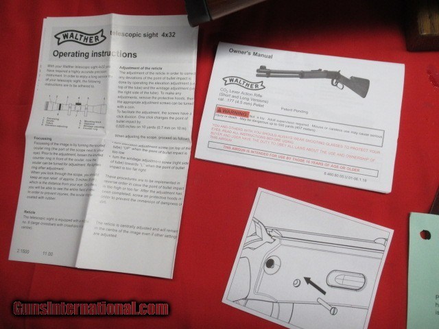 Description: Looks new Comes with everything shown, Walther 4X32 Scope, Buyer pays 60.00 shipping Pa residents add 6% sales tax, Price is for check or money order, Cc add 3% SOLD |