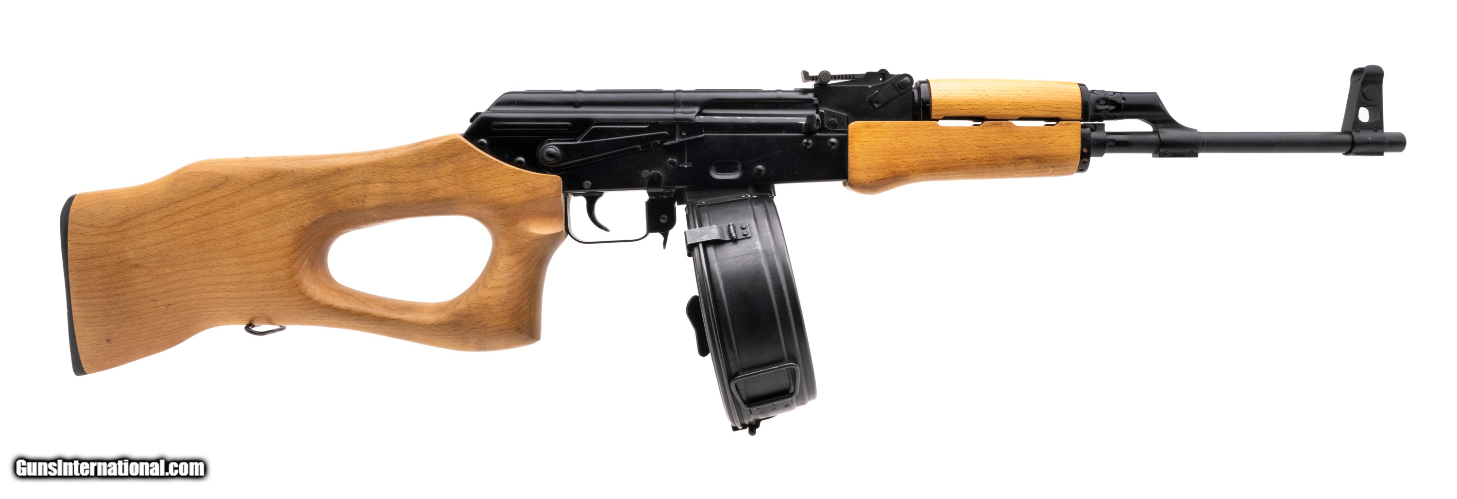 Description: "SN: SM25227. Made in 1990 in Budapest by FÉG (Fegyver- és Gépgyár or "" Arms and Machine Manufacturing Company"") with a 16"" barrel chambered in 7.62x39mm. This is a numbers matching SA 85M that was imported by K.B.I in post-ban configuration with thumbhole stock, no bayonet lug, no cleaning rod retainer, and no muzzle threading. Overall condition is very good with original factory finish across the metallic parts & wooden furniture that shows only minor handling marks. The bore is bright with strong rifling. Unusually, this SA 85M is equipped with the FÉG AMD-65 type short gas system that uses a 4.75"" piston instead of the usual 6.25"" piston. Comes with a 75rd Chinese drum magazine. (Consignment) SOLD |