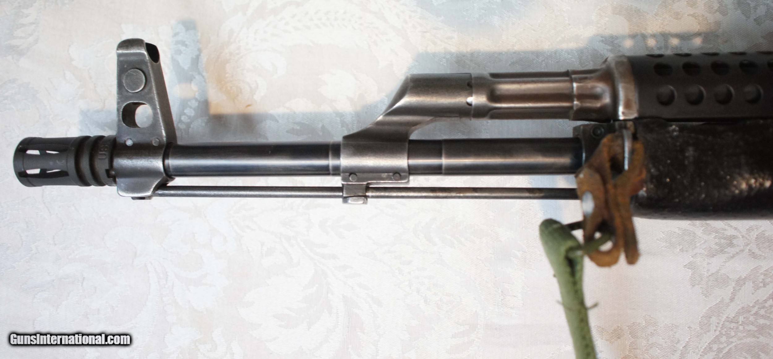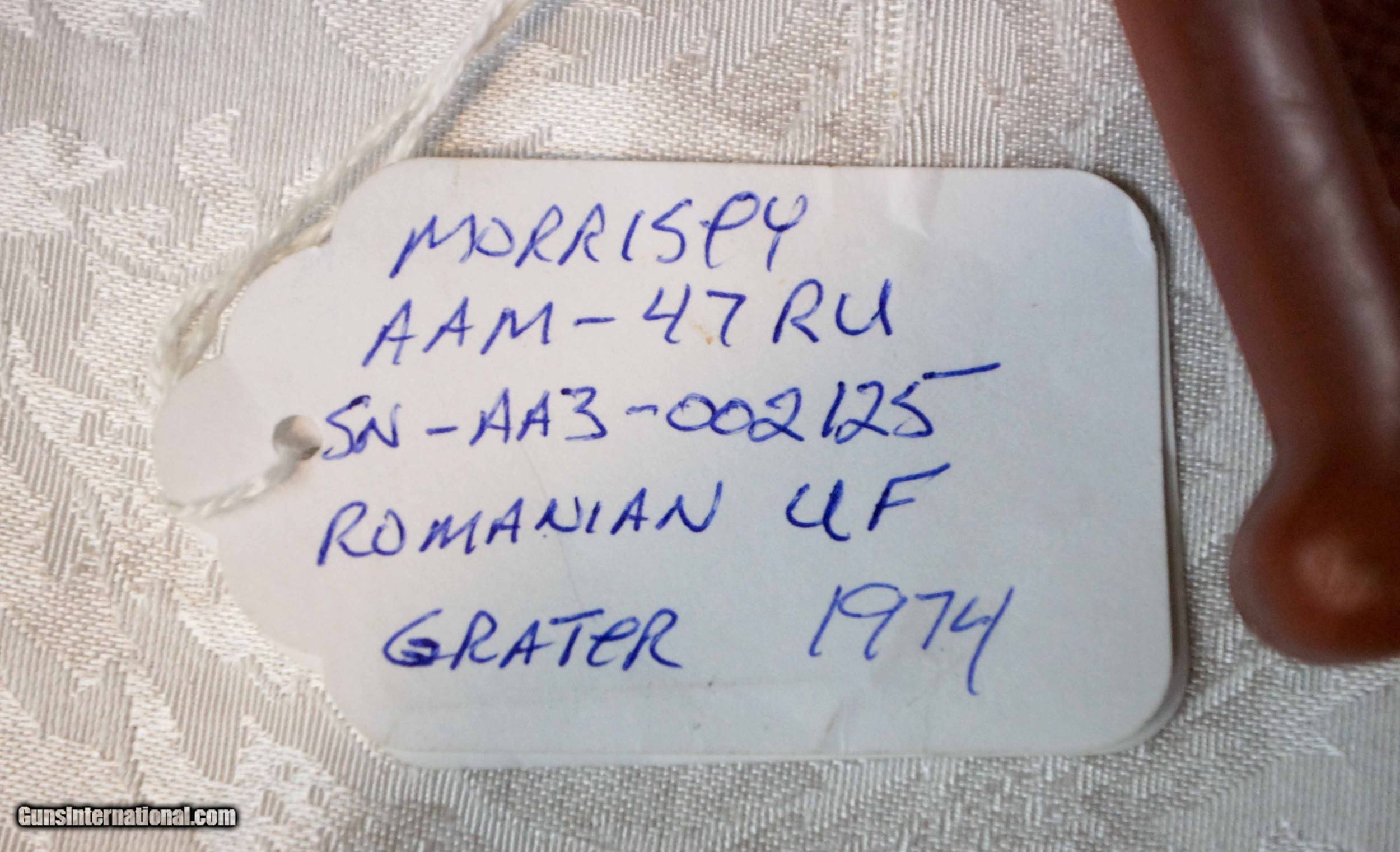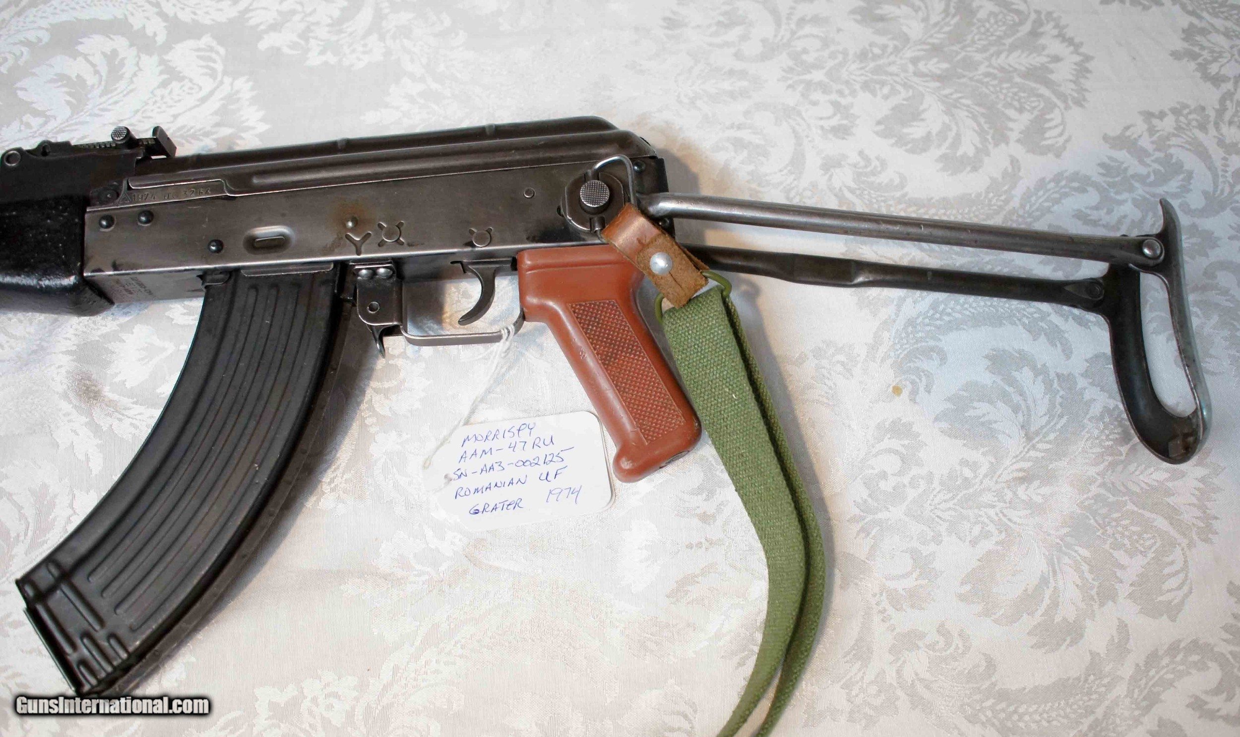 Description: THIS GUN IS SOLD Preban Romanian underfolder dated 1974 with a grater top guard. Pro built on a Morrissey receiver. Black pebble finished handguard. This is a very classic sought after gun. It printed a very accurate test target at 50 yds. SOLD Rifle Caliber: 7.62x39mm Model: 47RU Serial Number: AA3 002125 Barrel Length: 16 Bore Condition: excellent |