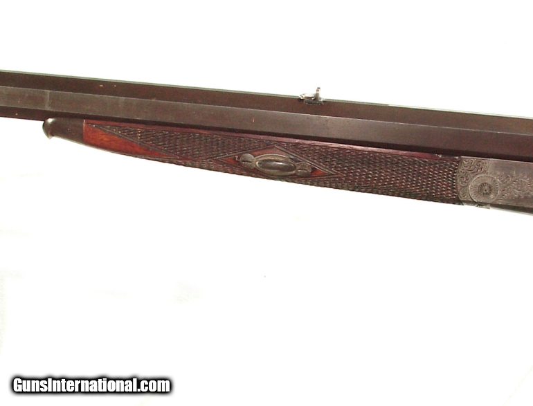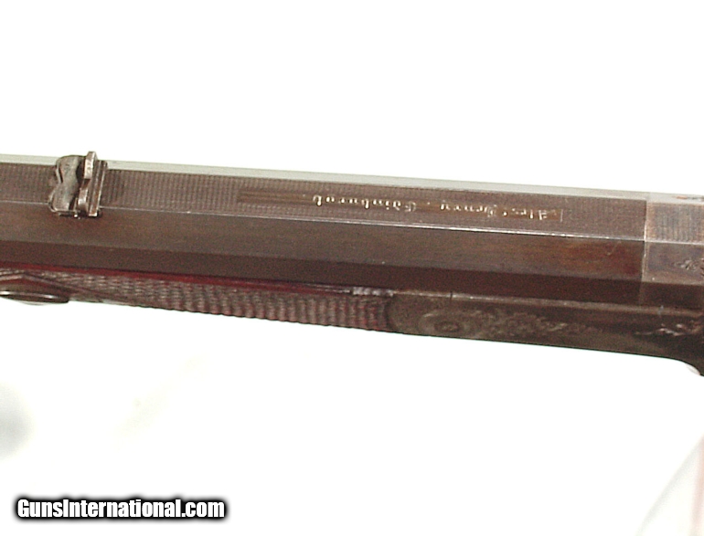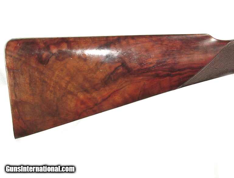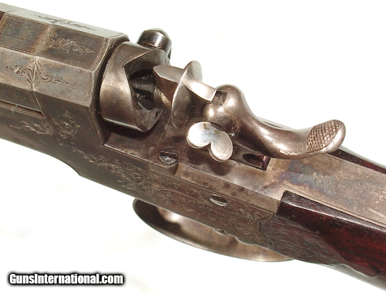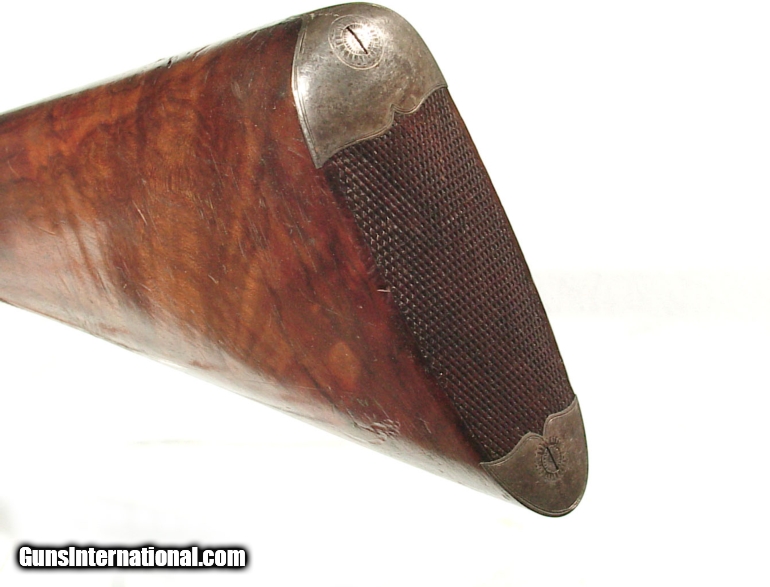 Description: .38 caliber, 24" full octagon barrel with filed rib and folding express site. Rigby patent breech with removable needle striker. Casehardened and engraved frame, checkered walnut forend and straight grip buttstock. LOP: 14 1/4" over engraved heel and toe plates. Superb quality retaining nearly all of the original blue and case colors. Deluxe wood with crisp checkering and horn forend cap. Mint bore. Accompanied by it's leather rifle scabbard. This rare and beautiful rifle is featured on the cover of "BRITISH SINGLE SHOT RIFLES, VOL. 7, Rook, Rabbit, and Miniature Rifles" by Wal Winfer and Tom Rowe. SOLD Antique: Yes |