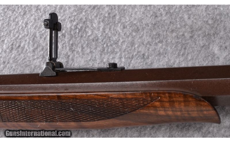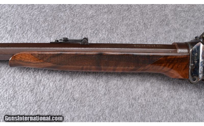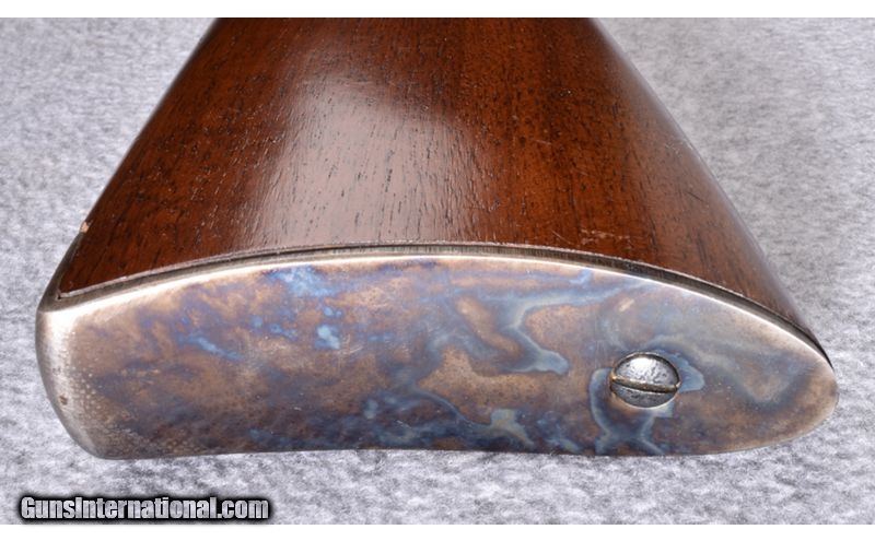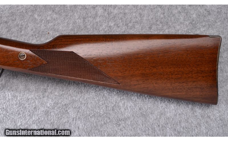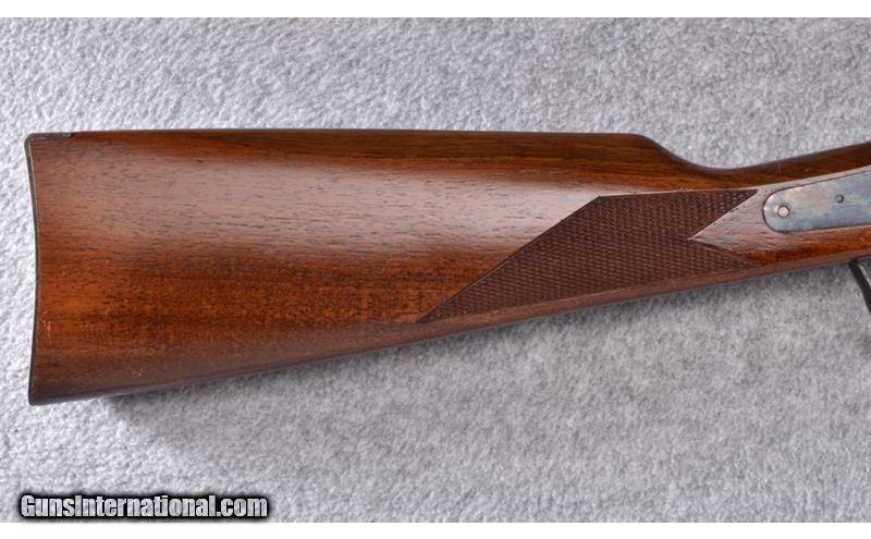 Description: Wood is solid and without cracks showing only light use and handling marks. Barrel originally had brown finish and shows some light oxidation in places. Case coloring remainsgood but also shows some oxidation in spots.Bore is excellent. No box. .45-70 SOLD Metal Condition: Very Good Wood Condition: Very Good Barrels: 28" Octagon - Brown Finish Triggers: Double - Set Trigger Stock Dimensions: 14 1/8" LOP Fore End: Checkered Walnut Butt Pad: Case Colored Metal Butt Plate Sights: Brass Blade Front - Folding Ladder Style Rear Item Location: Wheeling |