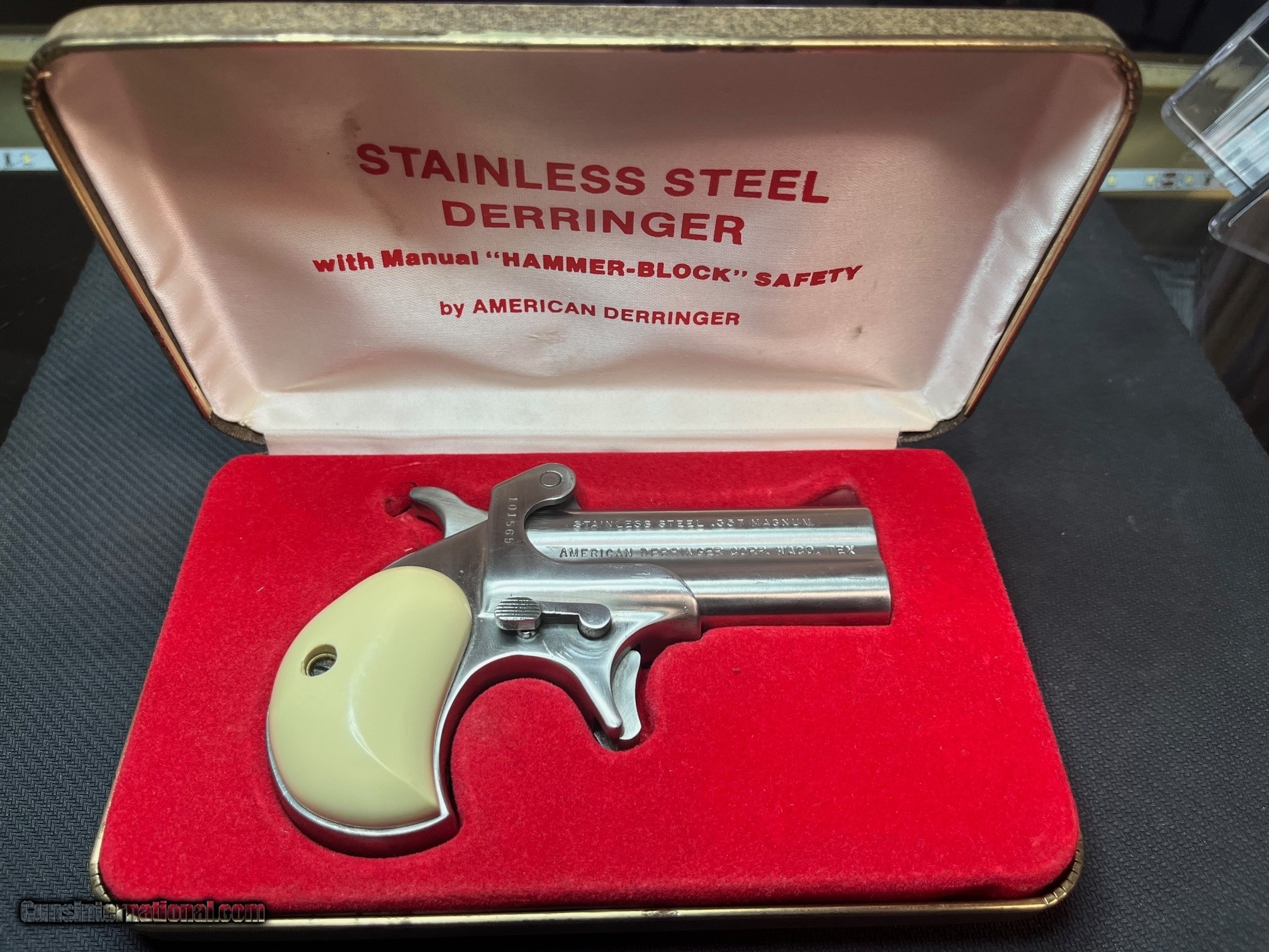 Description: Guns Listing ID: 1231272 American made stainless steel derringer with hammer block safety 357 mag or 38 spl SOLD Manufacturer: AMERICAN DERRINGER CORPORATION Model: M-1 Caliber Info: .38 SPECIAL/.357 MAGNUM Condition: Used - Non-Certified Barrels: 3 BARREL Finish: STAINLESS |