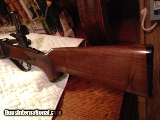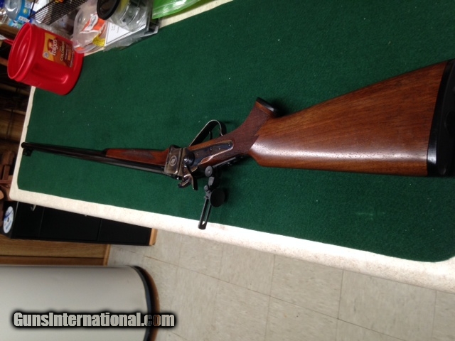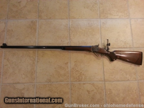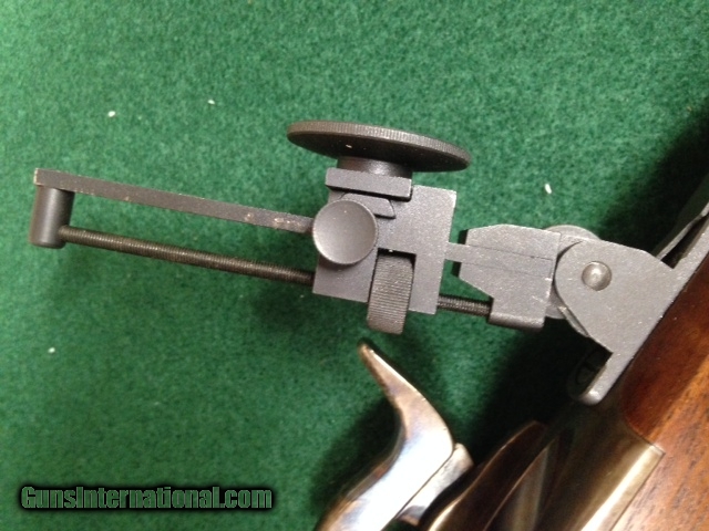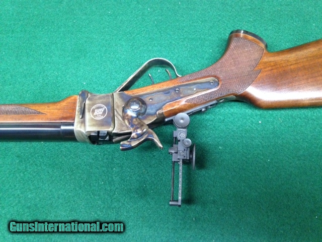 Description: This is a BPCR for long range shooting with the right features. Globe front sight with Spirit level, 34" high polished tapered barrel, rear tang sight adjustable windage and elevation, shotgun but stock with pistol grip and deep checkering. An eye catcher and good shooter for 200 plus yards. The gun has been fired very little and has a few handling marks. A beautiful replica from Itali. SOLD |