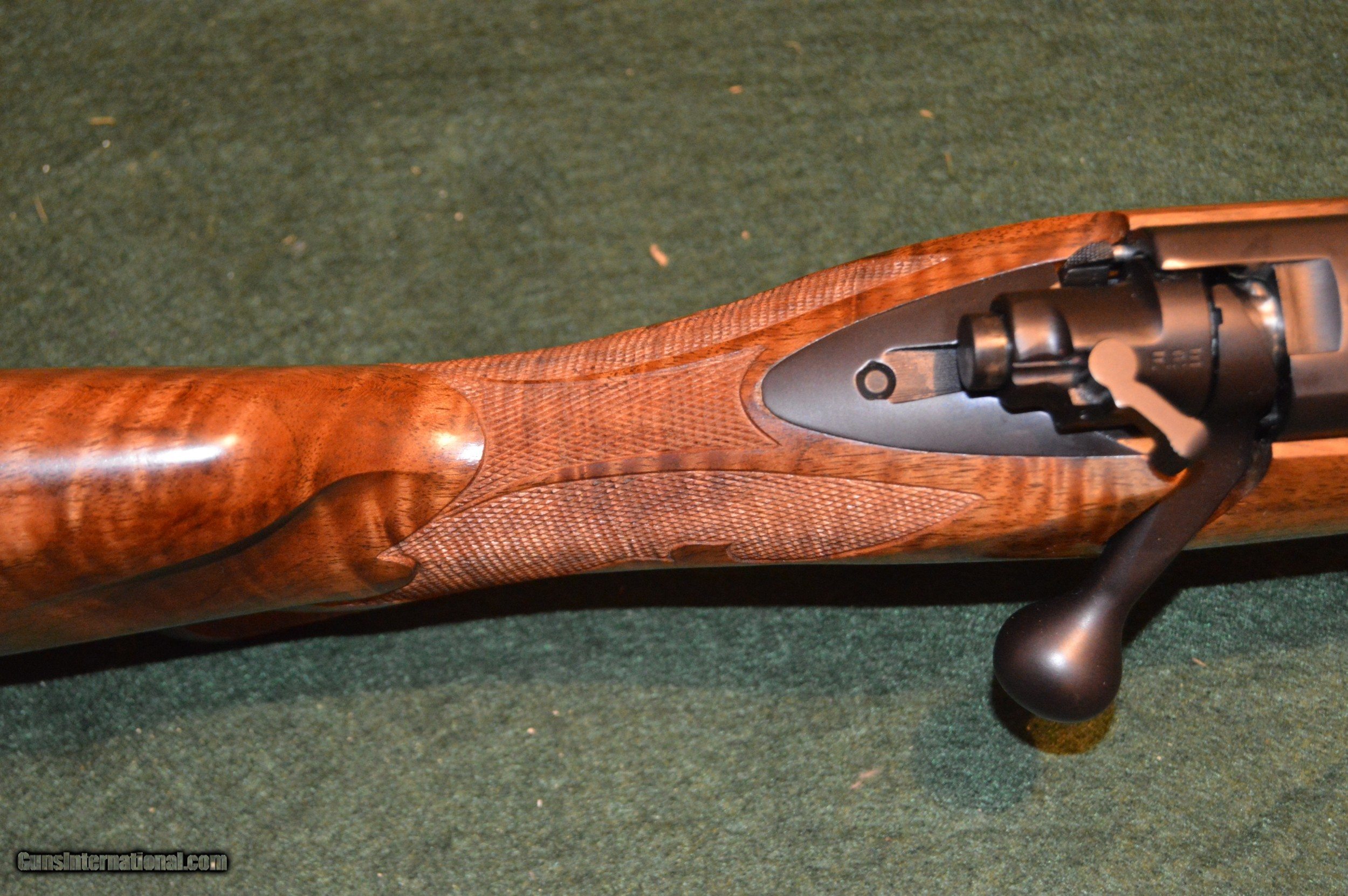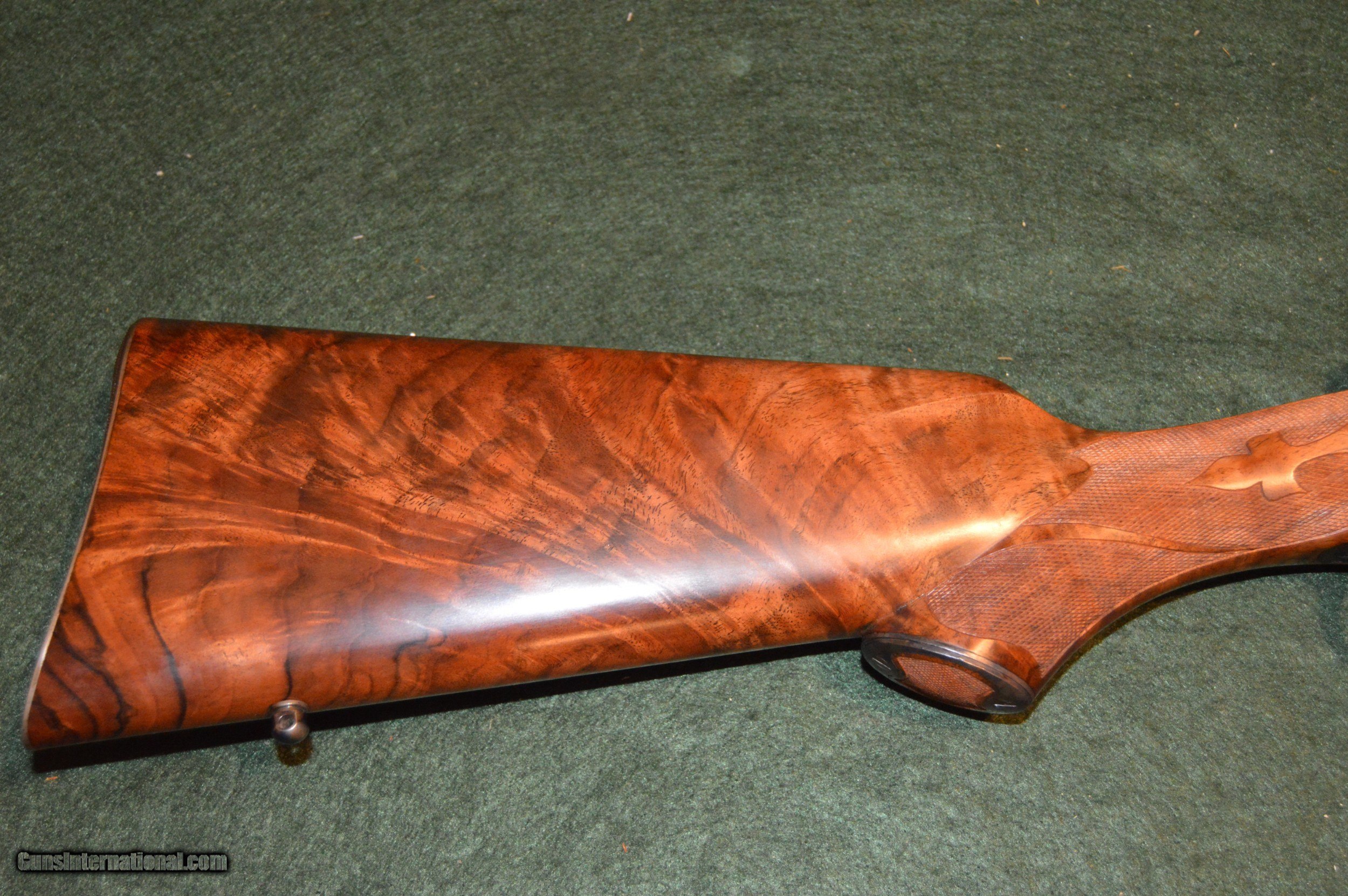 Description: A classic Al Lind stock but a distinctly different caliber. This M70 is chambered in .22/243 wildcat on an Apex Imperial barrel. The California English walnut is definitely XXXX with lots of color contrast and an almost irridescent sparkle to it. The ribbon fleur de lis checkering pattern is quintiscential Al Lind. Also not the case hardening colors on the skeleton grip cap. Al also went with a Biesen checkered steel butt plate and ebony forned tip on this project. Some once-fired cases are available. SOLD Rifle Caliber: .22-243 Manufacturer: Winchester Model: M70 Serial Number: 566283 Condition: 98% Metal Condition: 100% Wood Condition: 98% Bore Condition: 100% Barrel Type: Apex Imperial Action: Winchester M70 Stock: California English walnut Weight: 9 lb., 4 oz. Sights: none |