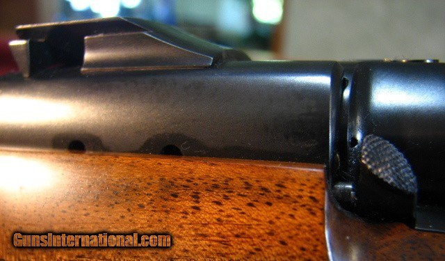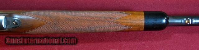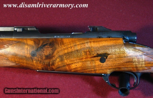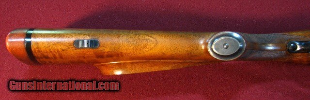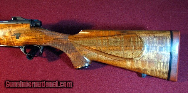 Description: Full custom .416 Remington built on a 1957 Pre-64 Winchester Model 70 action. Barrel is 24" and features an island ramp front sight, attached sling stud, forward barrel recoil lug, and quarter rib with single leaf sight. Reciever features a custom bolt handle, raised checkered bolt release, and Blackburn drop box bottom metal with straddle floorplate and trigger bow release. It has custom scope bases machined for Talley CZ rings or Alaskan Arms rings. Stocked in a nicely figured piece of Bastogne Walnut with extensive fiddleback figure in American Classic style. Stock features include a shadow line cheekpiece, point pattern 26 LPI checkering with mullered border, steel pistol grip cap, two screw inletted swivel stud with hidden screws, double crossbolts, and an ebony forend tip. LOP is 14" Weight is 8lb 15oz without scope. Mr. Elrod of Chesaning, MI has been stocking rifles for over 40 years. Mr. Hughes [Blue Canyon Rifles] Nowata, OK is a master machinist and a member of the ACGG. This piece is built solid to go the distance. It has been to Africa and used on elephant. It remains in very good overall condition showing only the slightest of hunting use. Blue, checkering, and stock finish all remain at 99% SOLD |