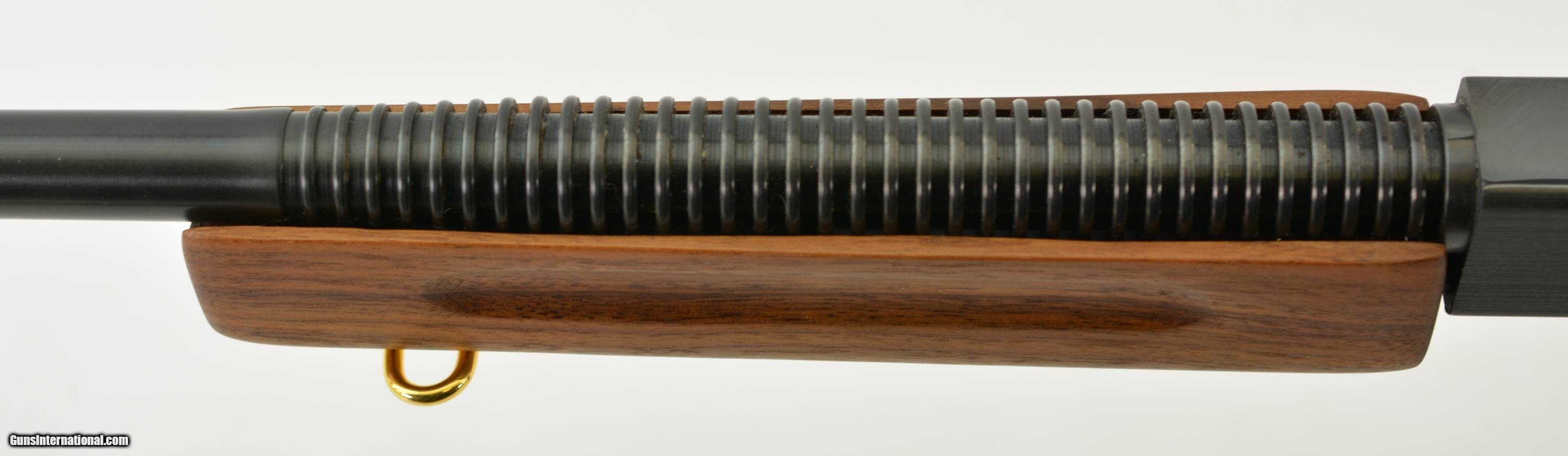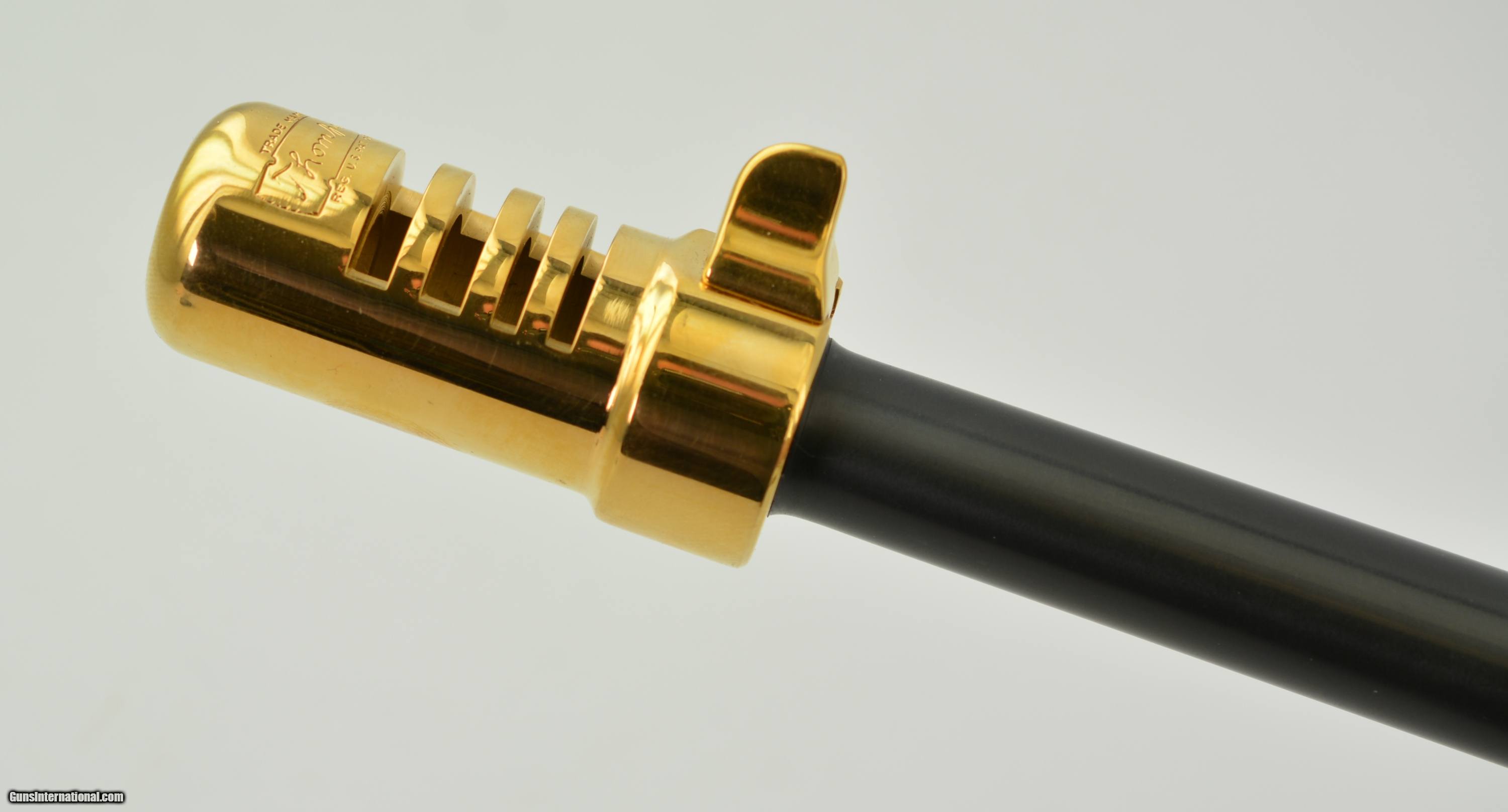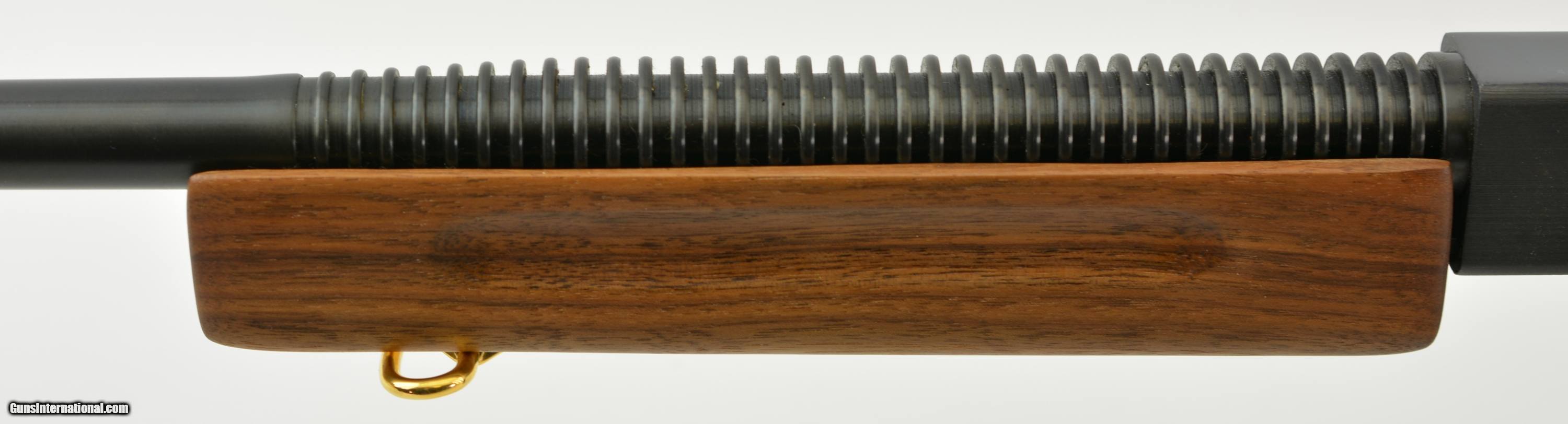 Description: Serial #ETO-010 / 19183, .45 ACP, 16 inch barrel with an excellent, bright bore. This is a West Hurley-made gun that has a bright gold plate finish on the Cutts compensator, cocking-handle, trigger, sling swivels, and rear sight protectors. The remaining metal has nearly all of the original blue finish remaining, apart from a few minor scratches on the left side opposite the ejection port, and also has a gold wash filling on the extensively marked receiver. The horizontal forend, pistol-grip, and buttstock have all of their original matte finish remaining, with almost no handling marks or blemishes, as well as excellent multi-colored enamel inlays on the pistol-grip and base of the buttstock. The gun comes with a single 20 rd. stick magazine, and the original unused leather sling. FFL or C&R SOLD Manufacturer: Auto-Ordnance Model: Thompson Serial Number: ETO-010 / 19183 Caliber Info: .45 ACP Gauge Info: .45 ACP |