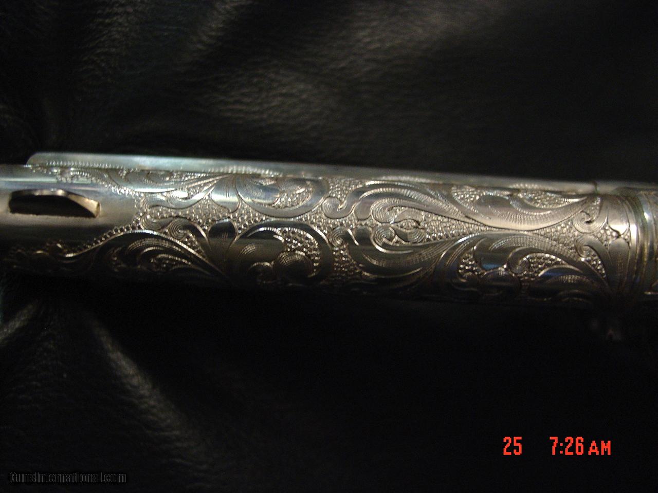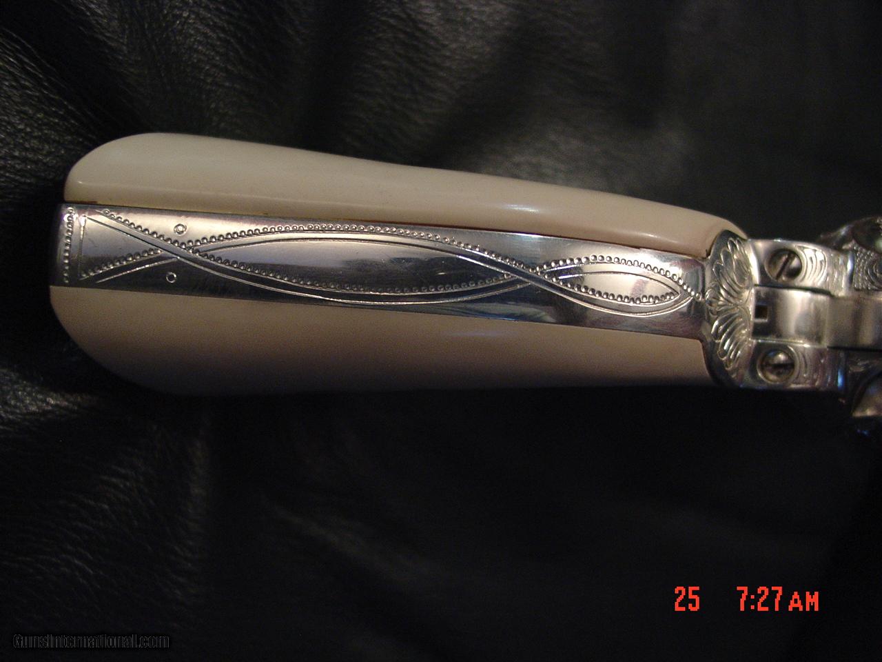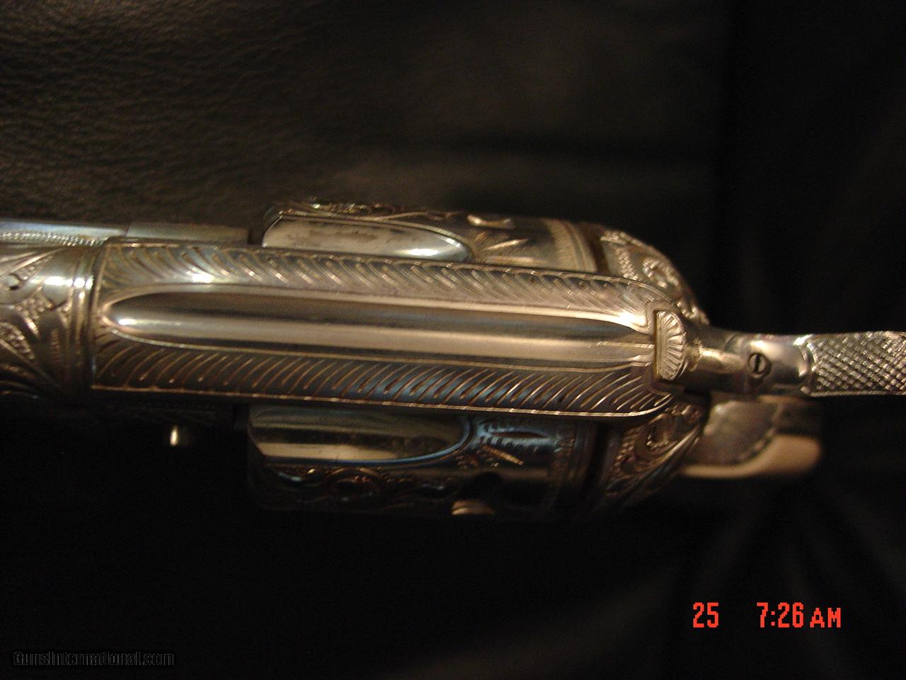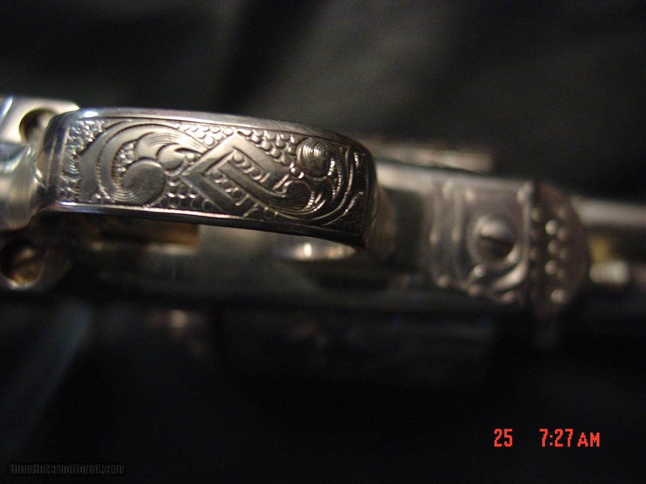 Description: SALE PENDING AWAITING FUNDS .Here is a real work of art showpiece from Uberti & The American Historical Foundation. its a replica of a Colt SAA in 45 Colt caliber,& is a Tribute to General George S Patton,& is factory engraved & then plated in pure silver,so it actually does tarnish like a silver tea set.its a 6 shot working revolver that has not been fired, & has cool faux ivory looking grips with the 4 star General stars medallions & GSP engraved on one side, & has the lanyard swivel loop, & a super cool stand up wood display case with pure silver plate in front & 4 stars on top. serial #P0906 no other boxes or paperwork. its a real steal at only $2095.firm +$60 shipping to your FFL dealer only. ships in 2 boxes to be safe. I am an FFL dealer,located in the Clearwater,Florida area. I accept bank wire transfers, direct deposits to Wells Fargo Bank,cashiers checks,bank & postal money orders,or personal & business checks,but those take time to clear. no credit cards or Pay Pal sorry. I now offer 60 day layaways with 1/3rd down & 1/3rd per month.be sure to check out all my other unique listings. SOLD |
