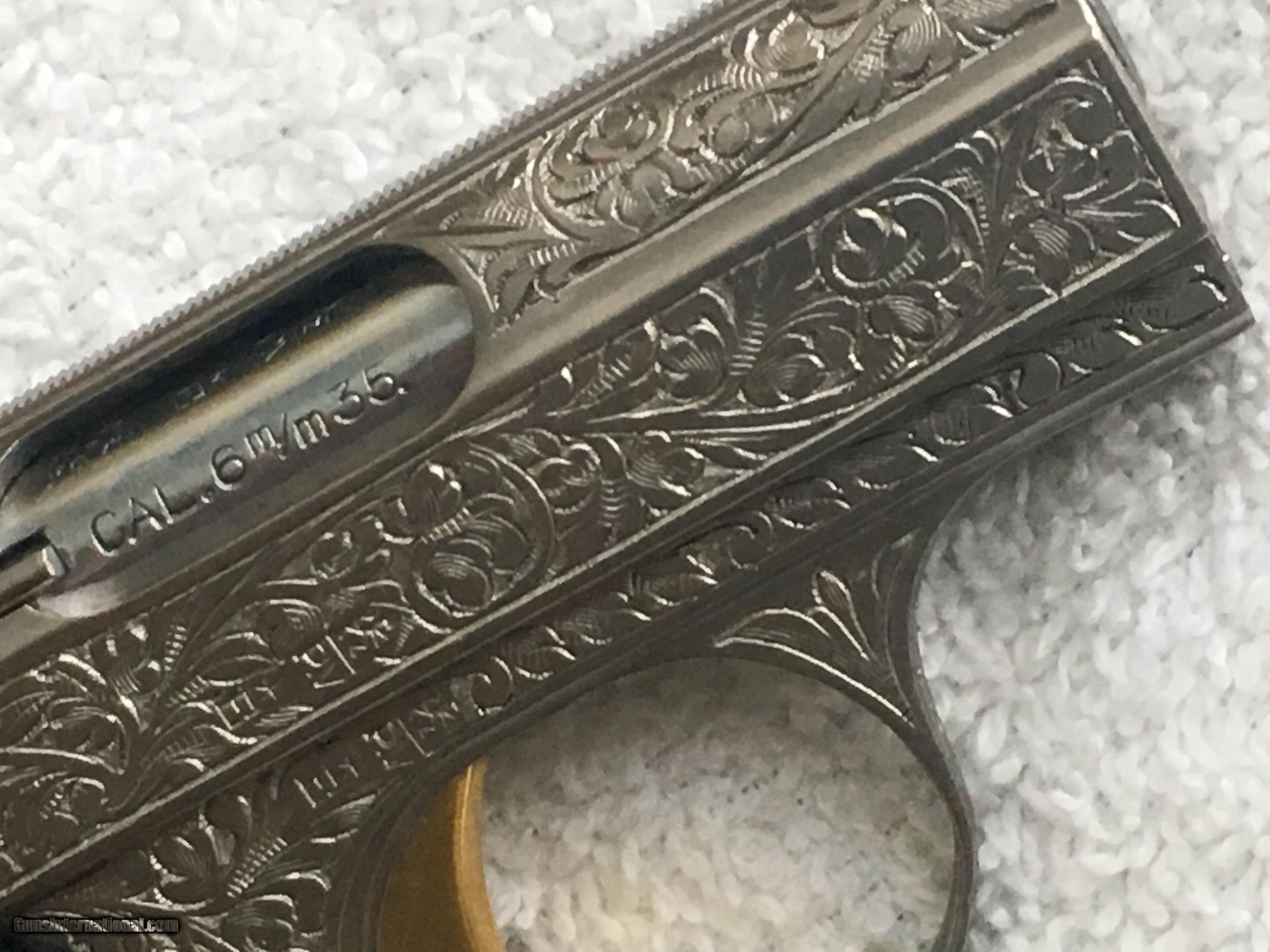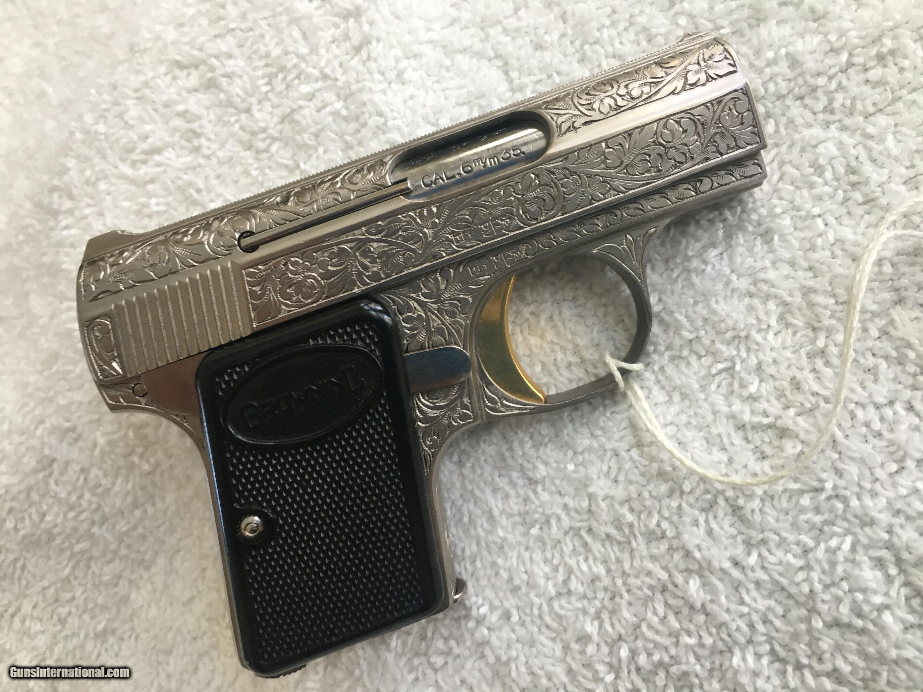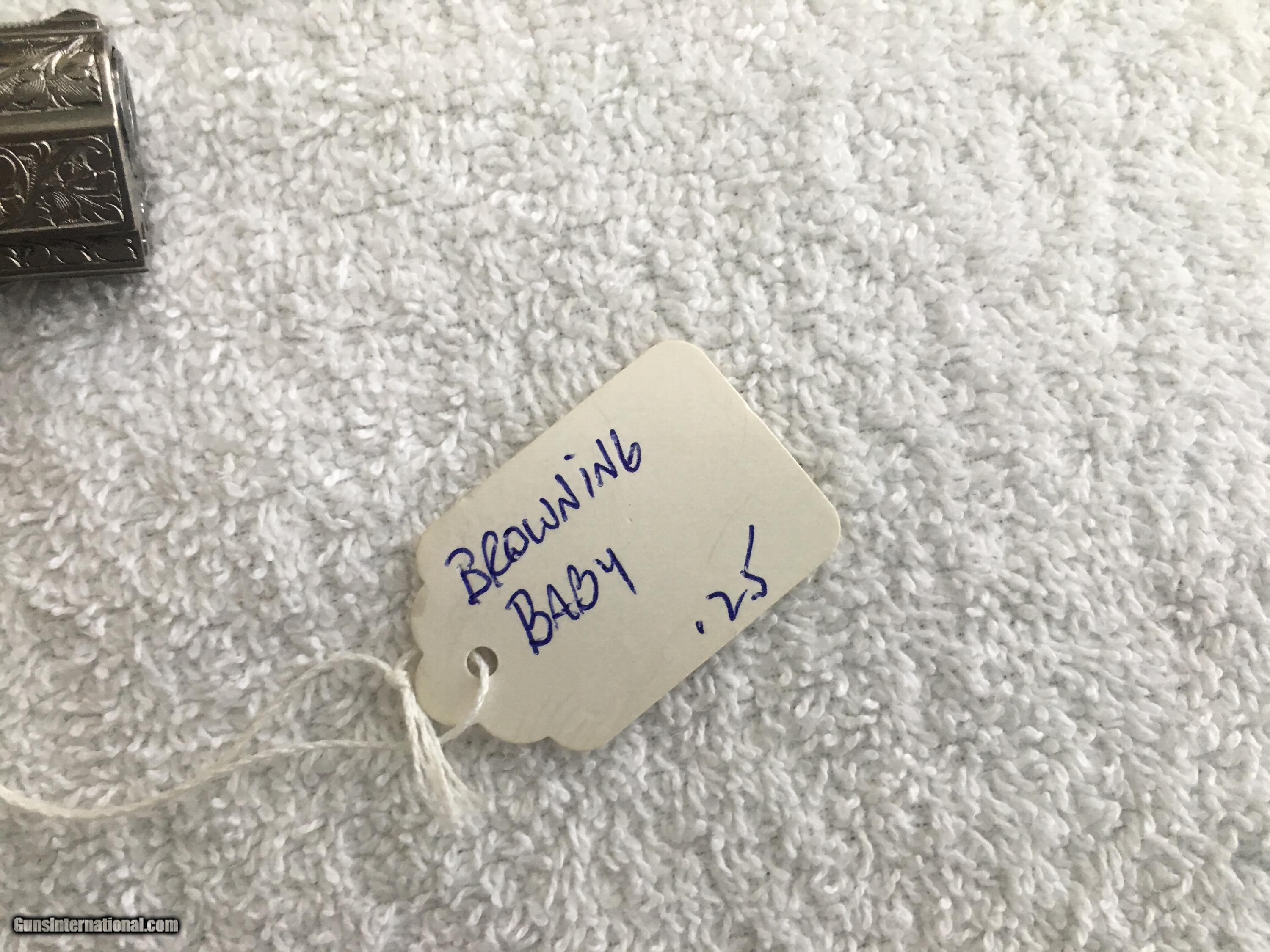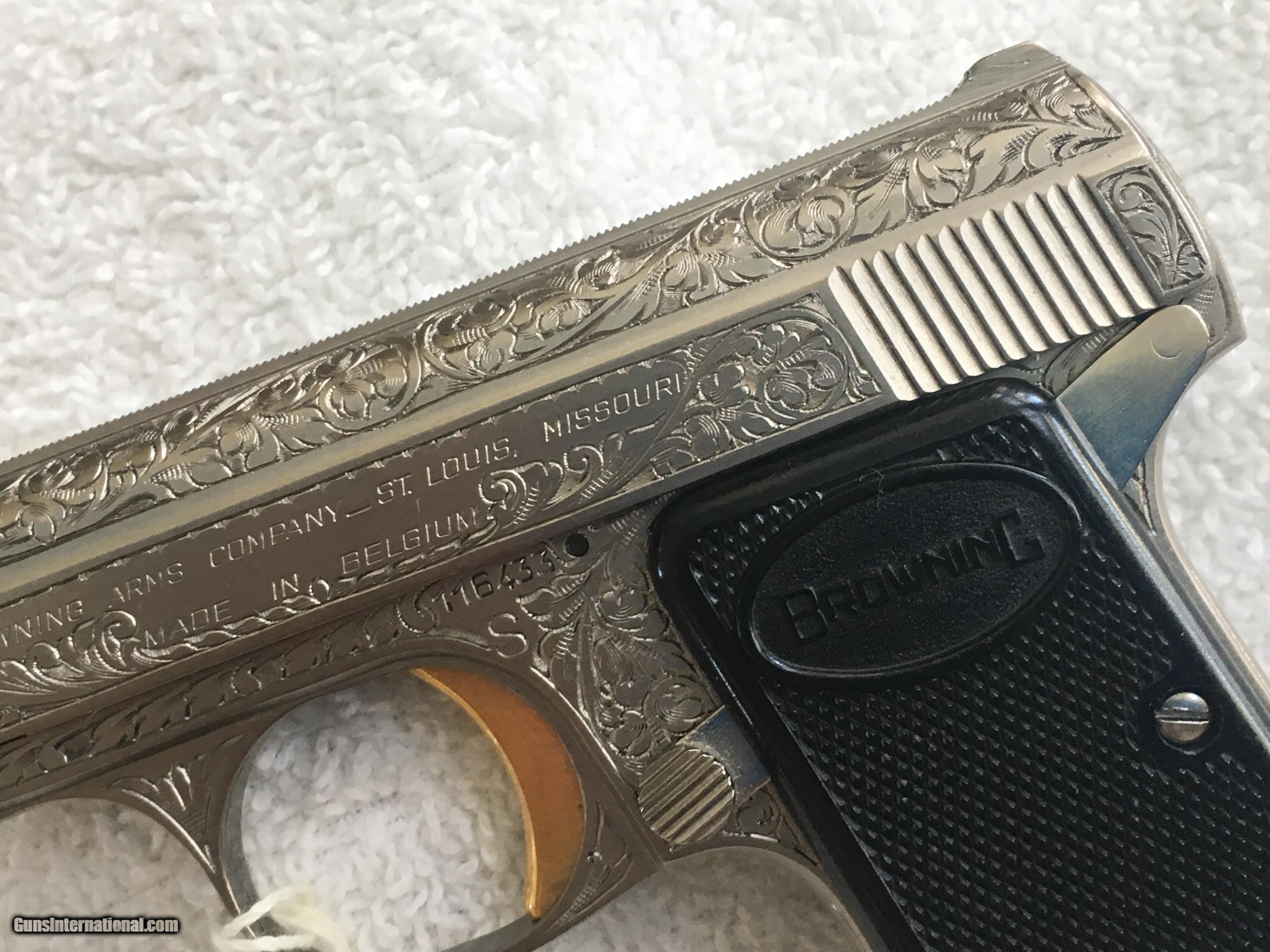 Description: Beautiful Baby Browning in stainless steel. Artfully engraved in renaissance style by formed Browning in house engraver, Master Angelo Bee. .25 cal. 2" bbl. New since rebirth. SOLD Curio/Relic: Yes Manufacturer: Browning Model: Baby Serial Number: 116433 Caliber Info: .25 Bore: New Condition: New Metal Condition: New Bore Condition: New Barrels: New |