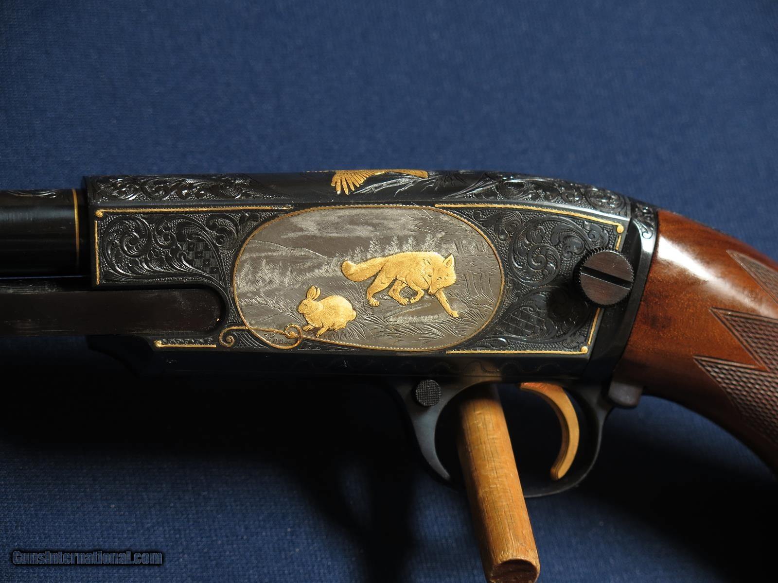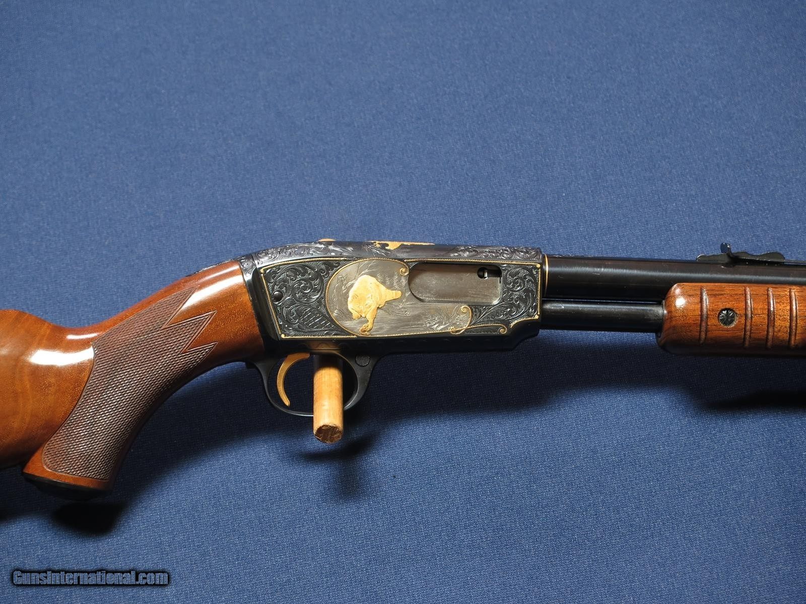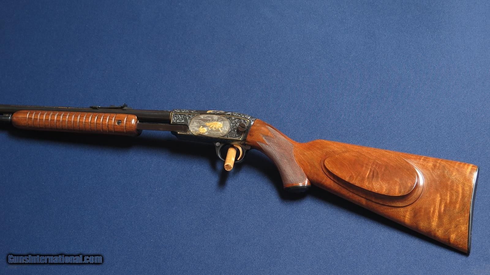 Description: Winchester 61 22 S,L,LR. Angelo Bee engraved. Signed "A. Bee" 1951 mfg. 24 inch barrel. Gold fox and squirrel on one side, raccoon on the other. Eagle engraved on smooth top receiver. Gun remains in excellent condition. Metal butt plate. SOLD Curio/Relic: Yes |