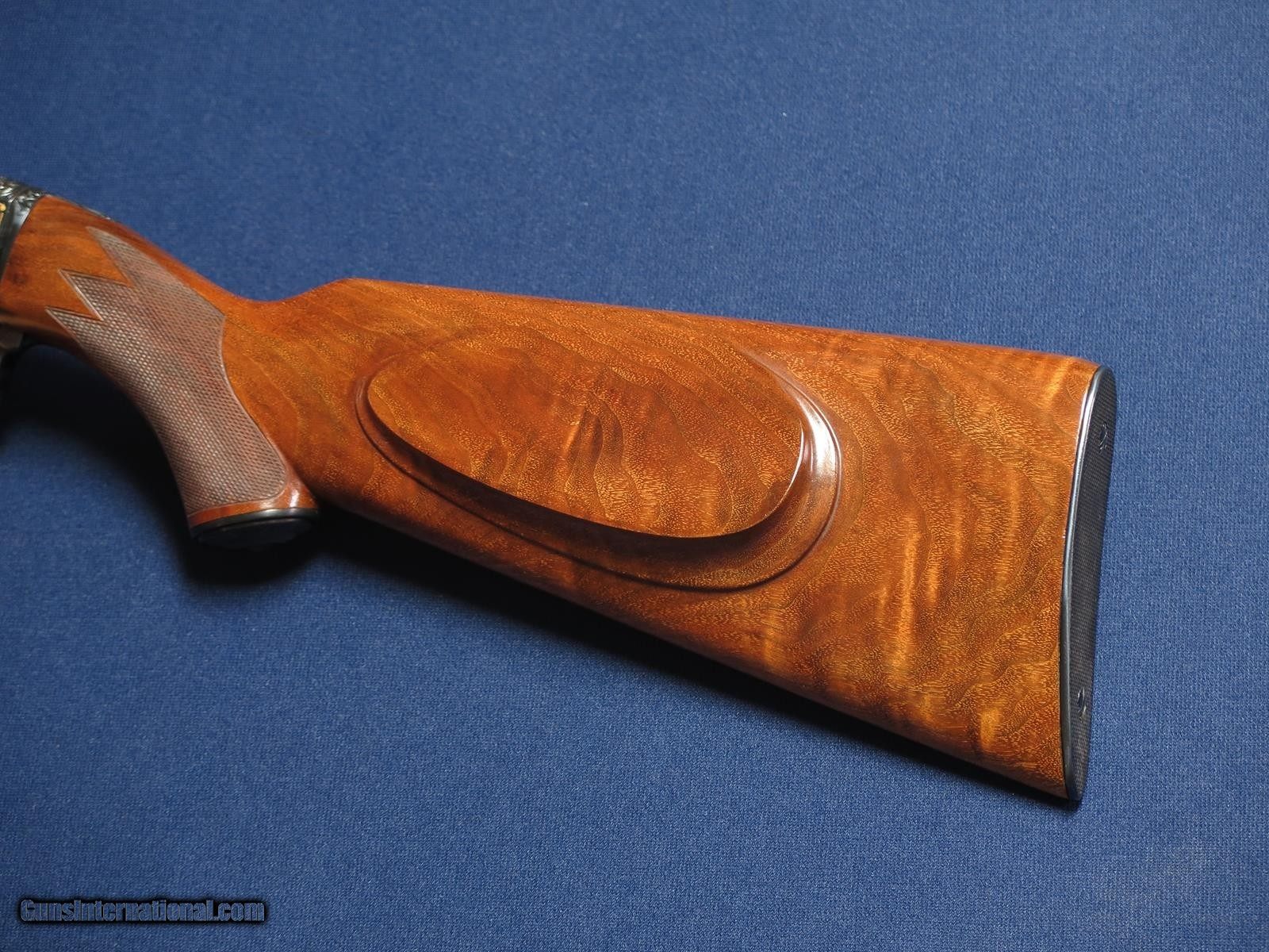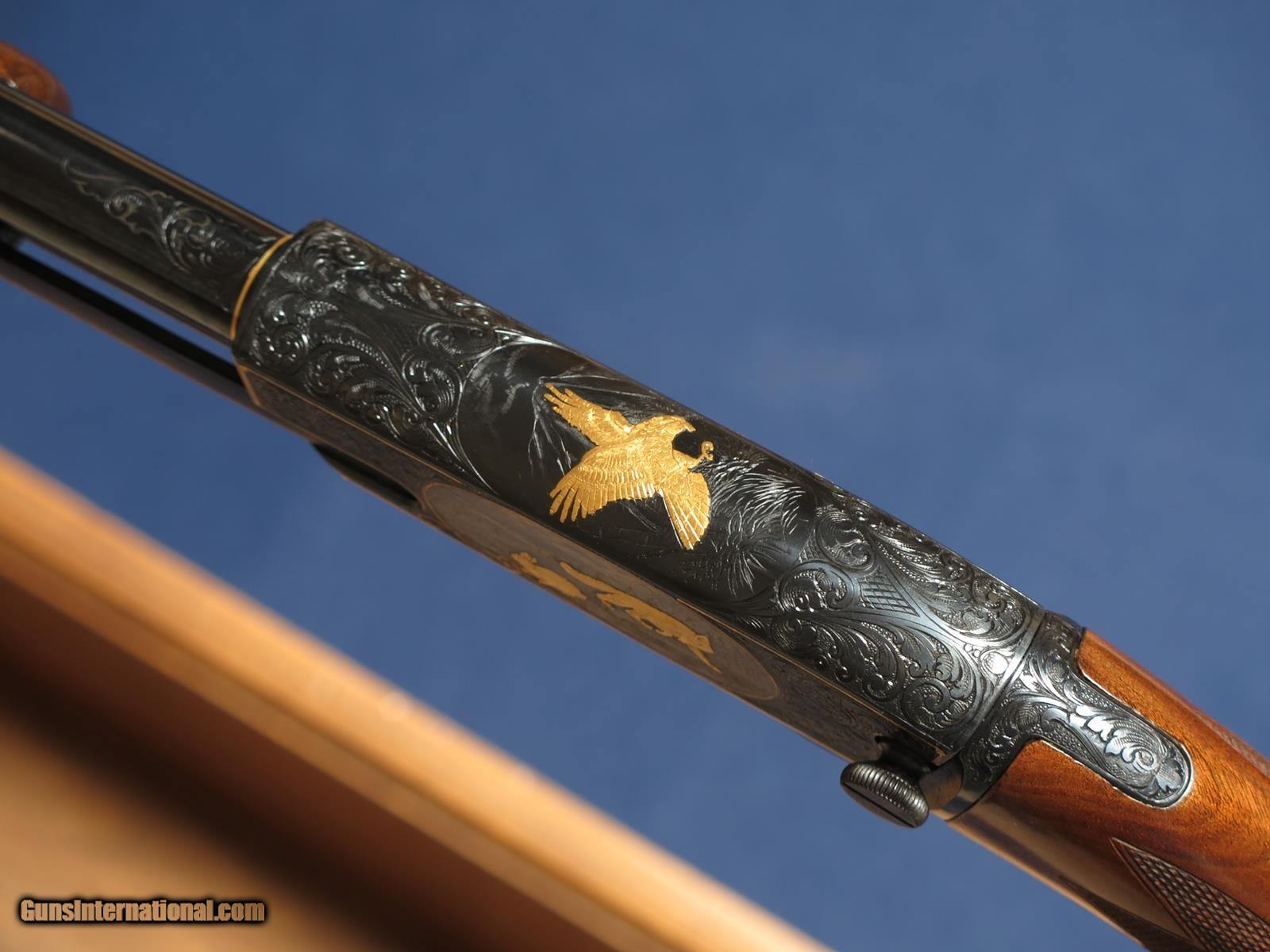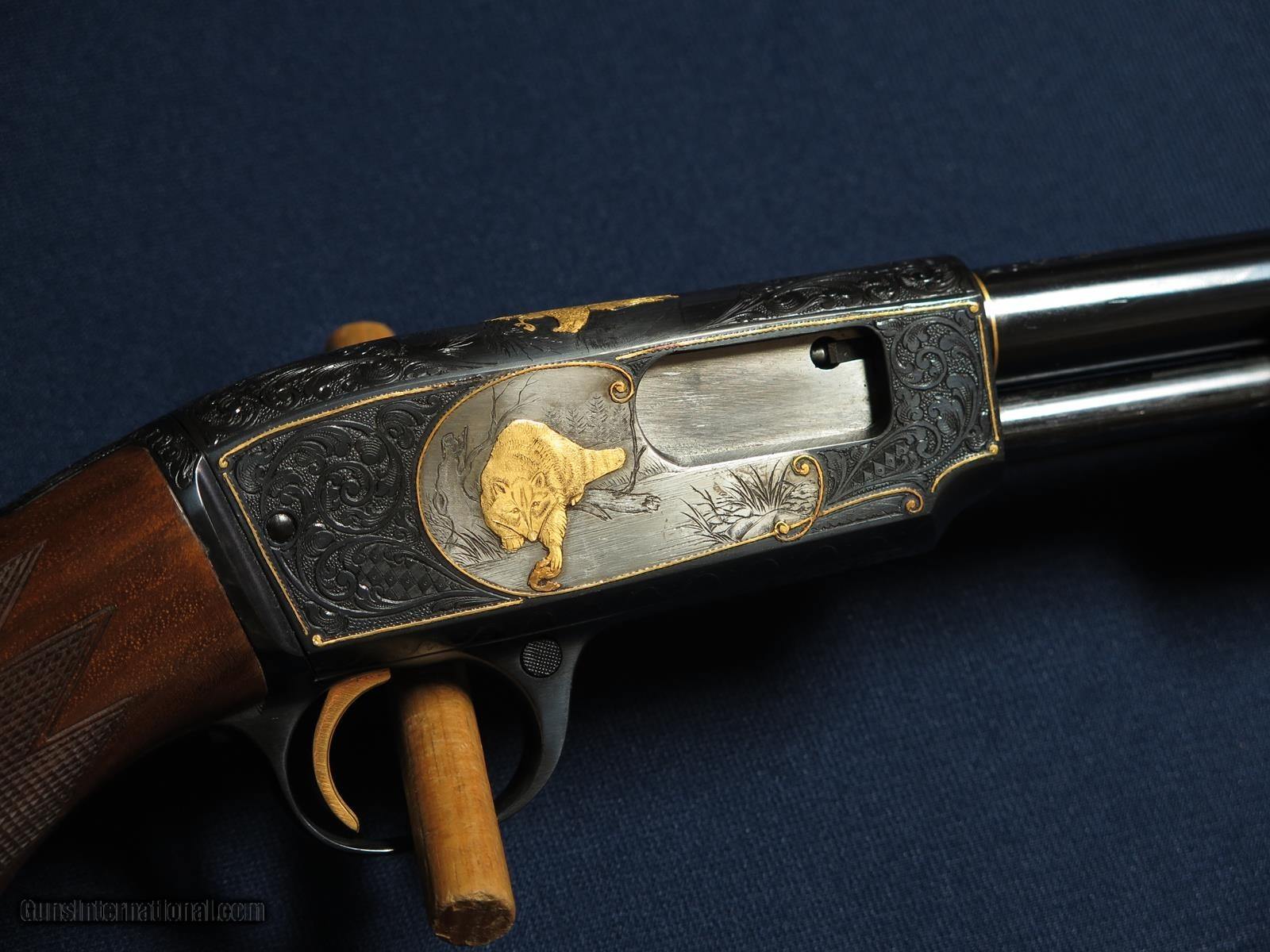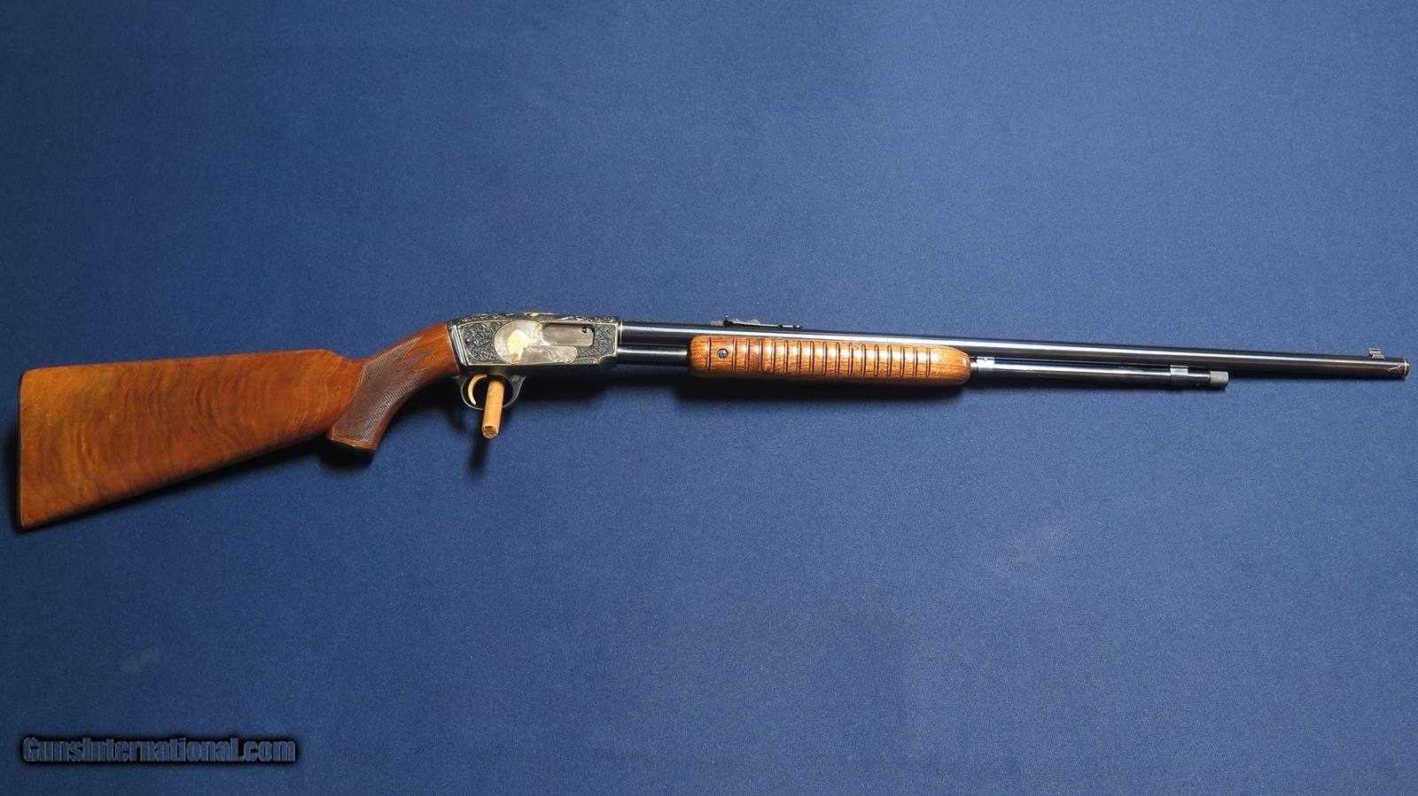 Description: Winchester 61 22 S,L,LR. Angelo Bee engraved. Signed "A. Bee" 1951 mfg. 24 inch barrel. Gold fox and squirrel on one side, raccoon on the other. Eagle engraved on smooth top receiver. Gun remains in excellent condition. Metal butt plate. SOLD Curio/Relic: Yes |