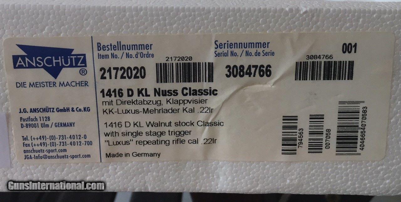 Description: Sale pending!!! #3084766. Anschutz 1416 DKL Luxus 22LR, New in Box with papers. 22.5” heavy barrel with open sight ( folding adjustable rear sight) , 5 shot mag, single stage trigger, checkered walnut stock, 5lbs 9 oz. SOLD |