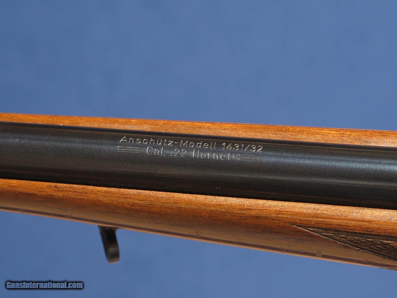 Description: Anschutz 1431/32 22 Hornet. 24 inch barrel. One magazine. Excellent 98% blue finish. Wood shows some hunting use. Excellent bore. SOLD |