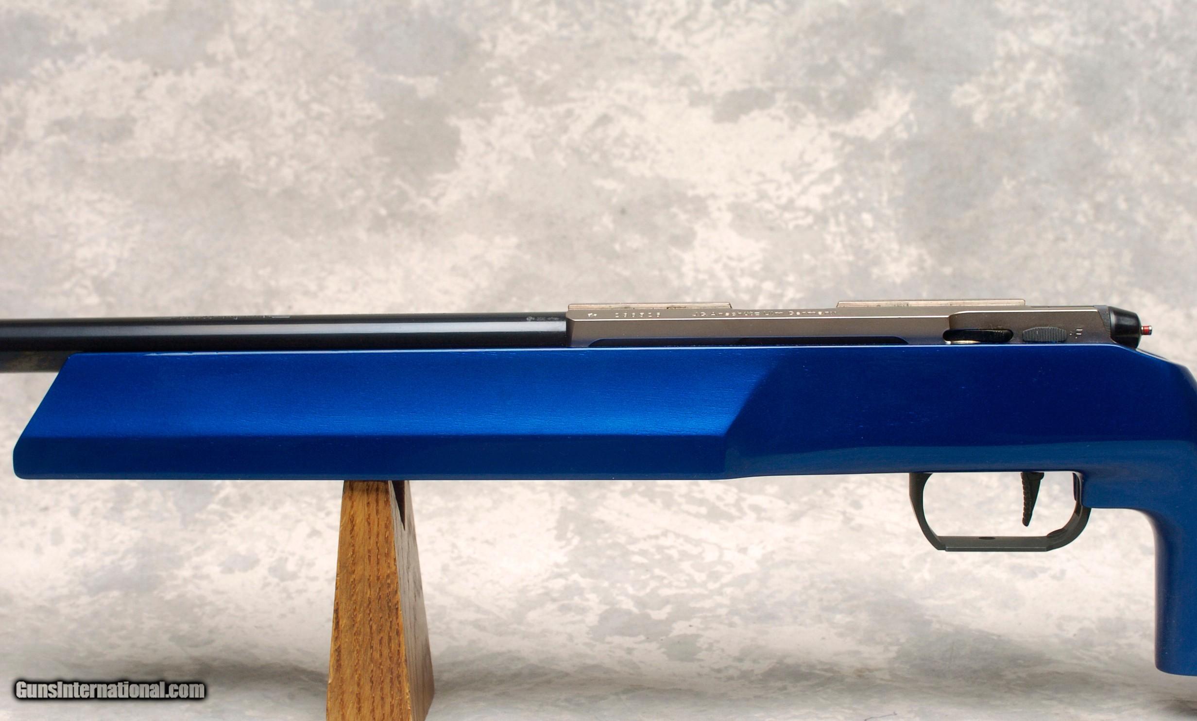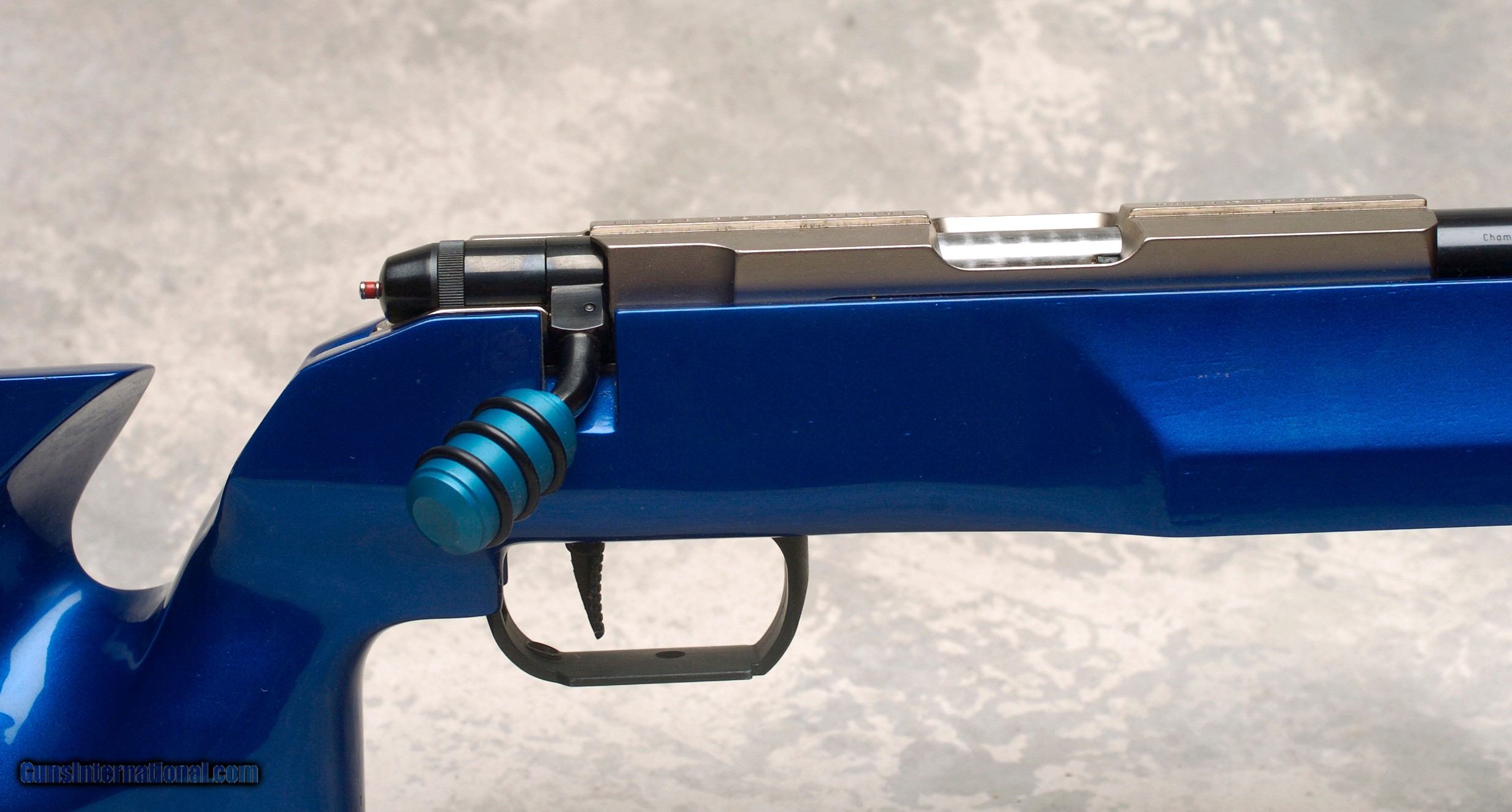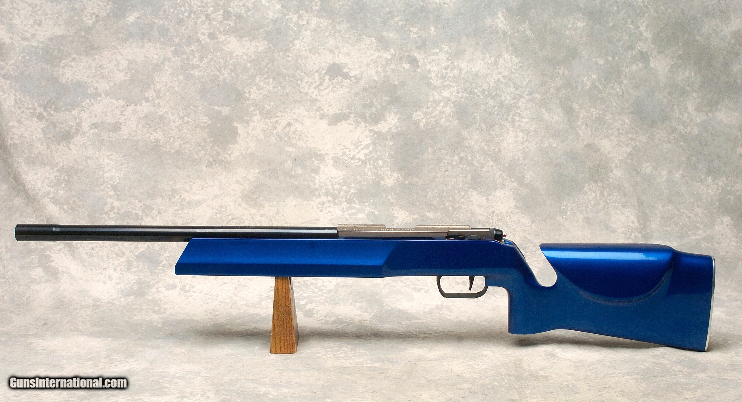 Description: This is a clean, used, Anschutz model 2007/2013 benchrest rifle in .22 LR caliber. This rifle has a 19 inch heavy barrel with a clean bright bore. The barrel is finished in a gloss black finish with no dings or marks. The one piece laminated stock is finished in Depont Deep Blue Pearl auto paint with 4 clear coat layers. The finish was done professionally and looks awesome.The rifle weighs under 6.5 kilos which qualifies it for use in International sport rifle competition. It has a wide flat base, a thumb-hole cutout and raised cheekpiece. The barrel is free floated and the trigger is light and crisp. It has a blue bolt handle to match the finish on the rifle. There is one small nick in the paint at the bottom edge of the pistol grip. Otherwise the finish is in excellent condition and is quite appealing to the eye. It wears a metal butt plate. SOLD |