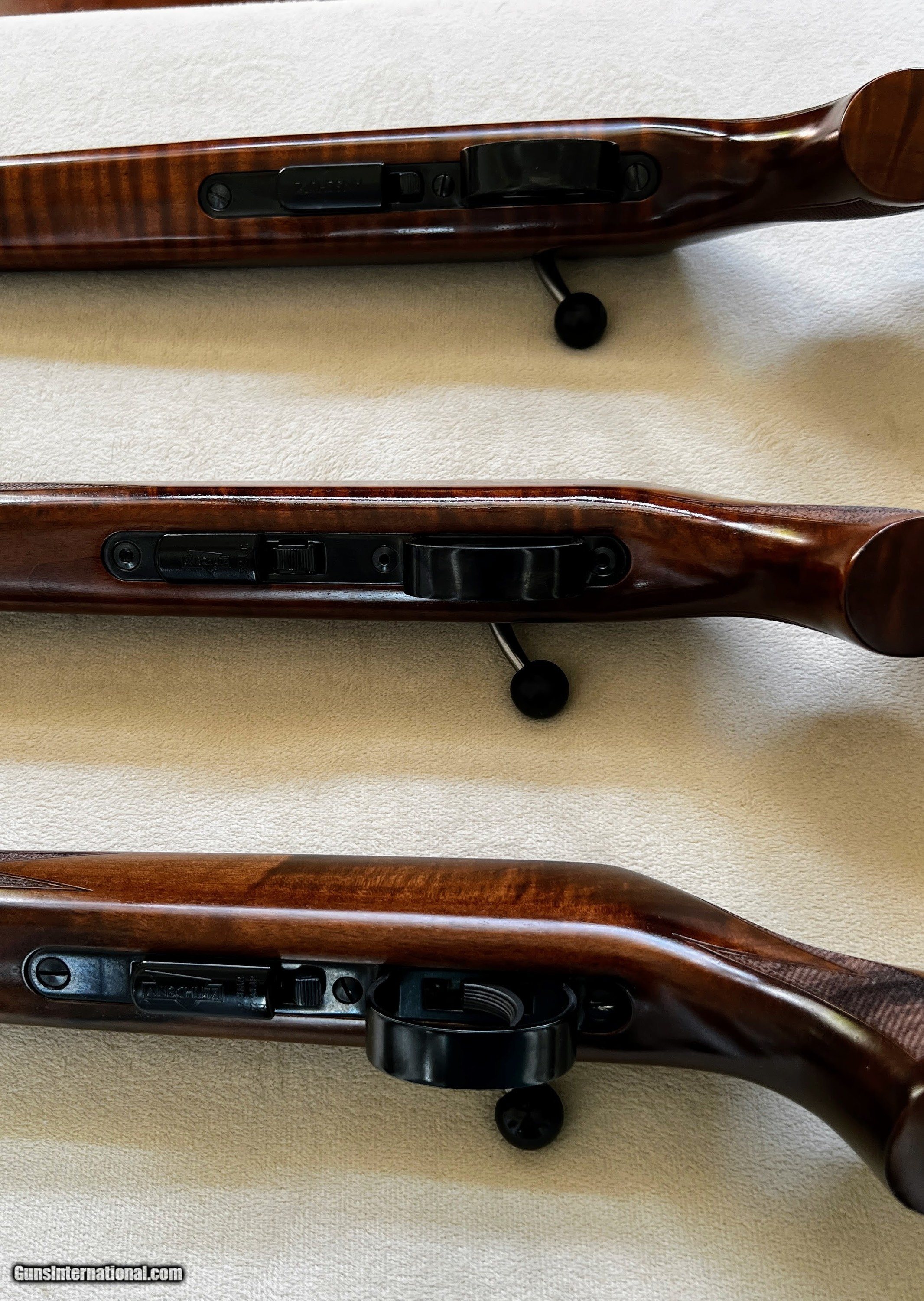 Description: "SOLD" I finally got the nerve to turn loose some of my Anschutz collection. Up for your consideration is a pretty well matched set of 22 LR, 22 Mag, and 17 HMR. They don't have Meister Grade in the 64 action lineup, but if they did, these would have made it. In the photos the 17 is on top the 22 LR is in the middle and the 22 Mag is on the bottom. The 17 HMR is NIB the others are lightly used. I do not want to separate them but if you made an insane offer, I would consider it. I also would consider trades on high end Coopers, Canyon Creek or Kimber SA or S models. Please see the numerous high quality photos to determine condition for yourself. The price listed is for cash but credit cards are available for an additional 3 1/2%. Shipping to the lower 47 (no shipping to CA) will be $120. Insurance is not included but highly recommended. Shipped only to an FFL and if your FFL does not accept a shipment from an individual with a bill of sale and copy of drivers license, add $25 to the order to cover my cost of using my FFL. Sold only where legal to purchase and you are responsible for knowing your local laws. Thanks for looking. SOLD Manufacturer: Anschutz Model: 1416,1516,1517 Bore: Excellent Condition: Excellent Metal Condition: Excellent Wood Condition: Excellent Bore Condition: Execellent Barrels: Blued Barrel Type: Sporter Action: Bolt Triggers: Adjustable Stock: Walnut |