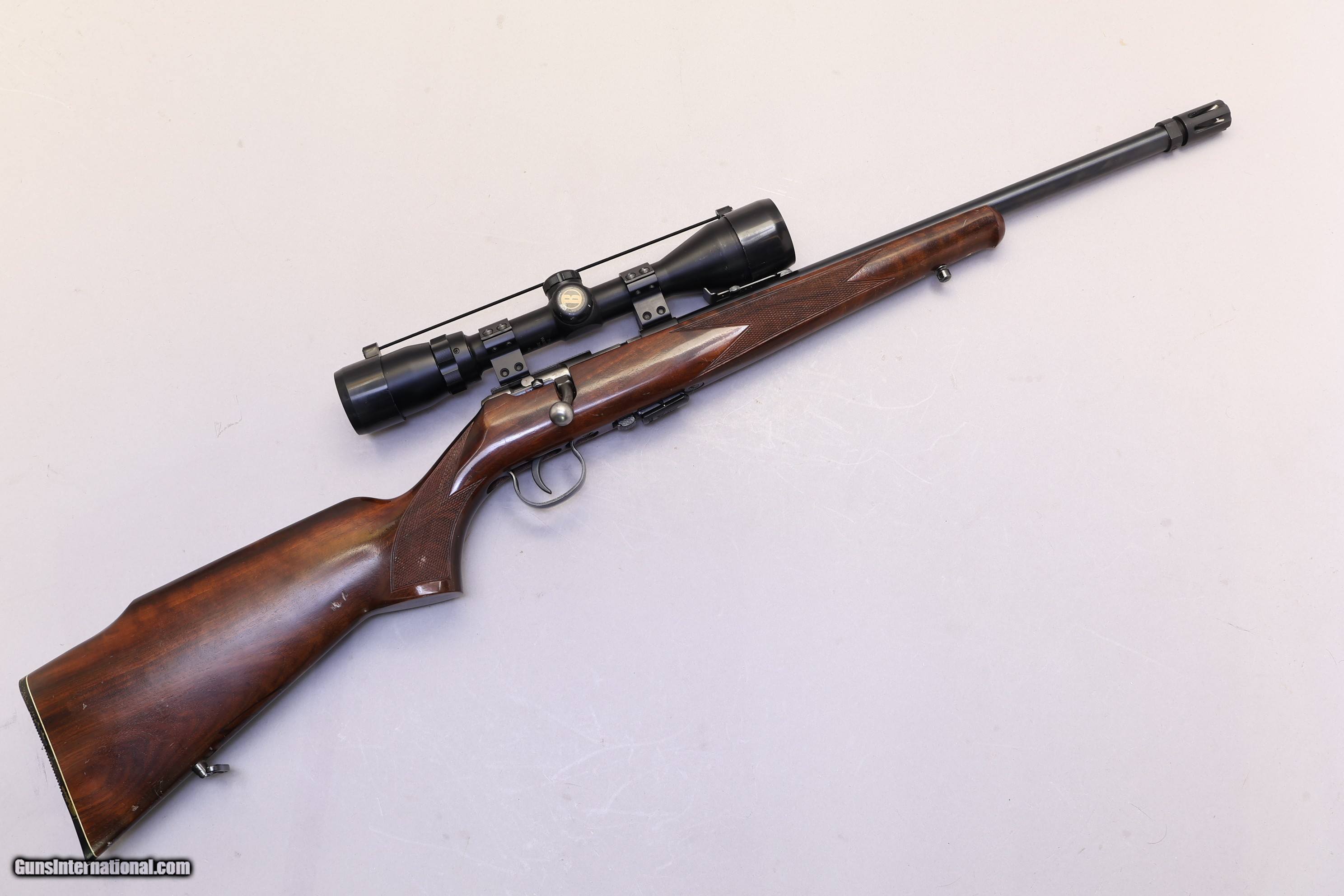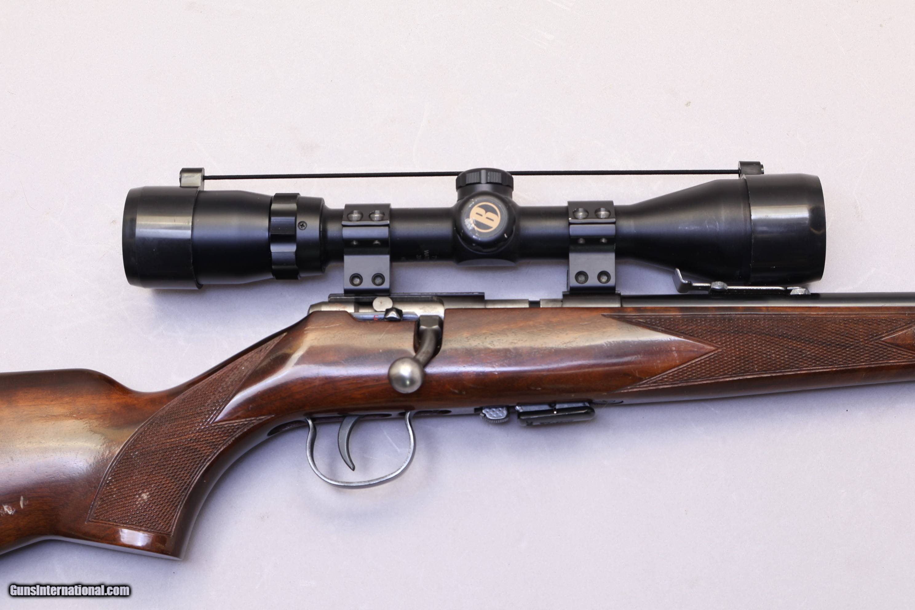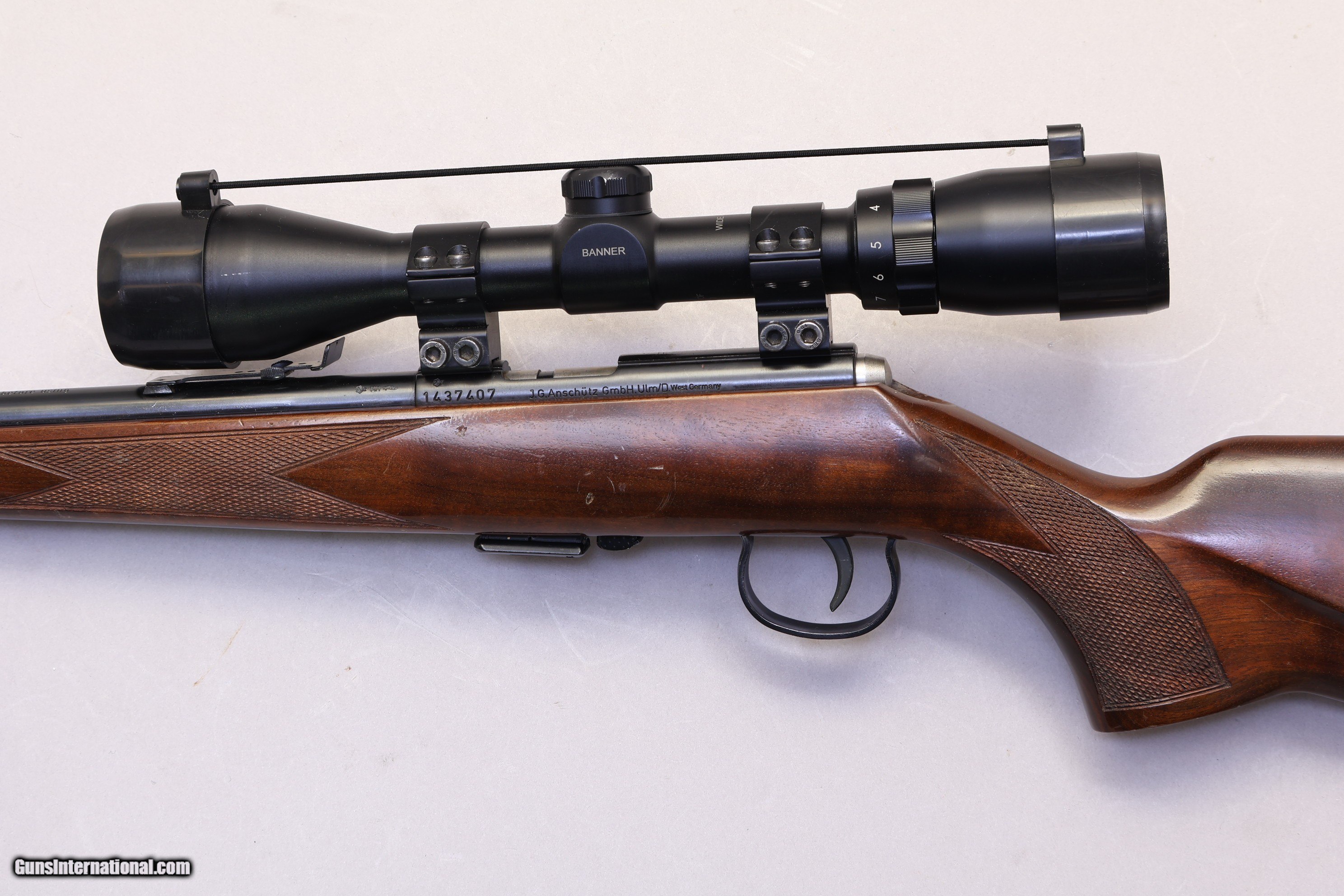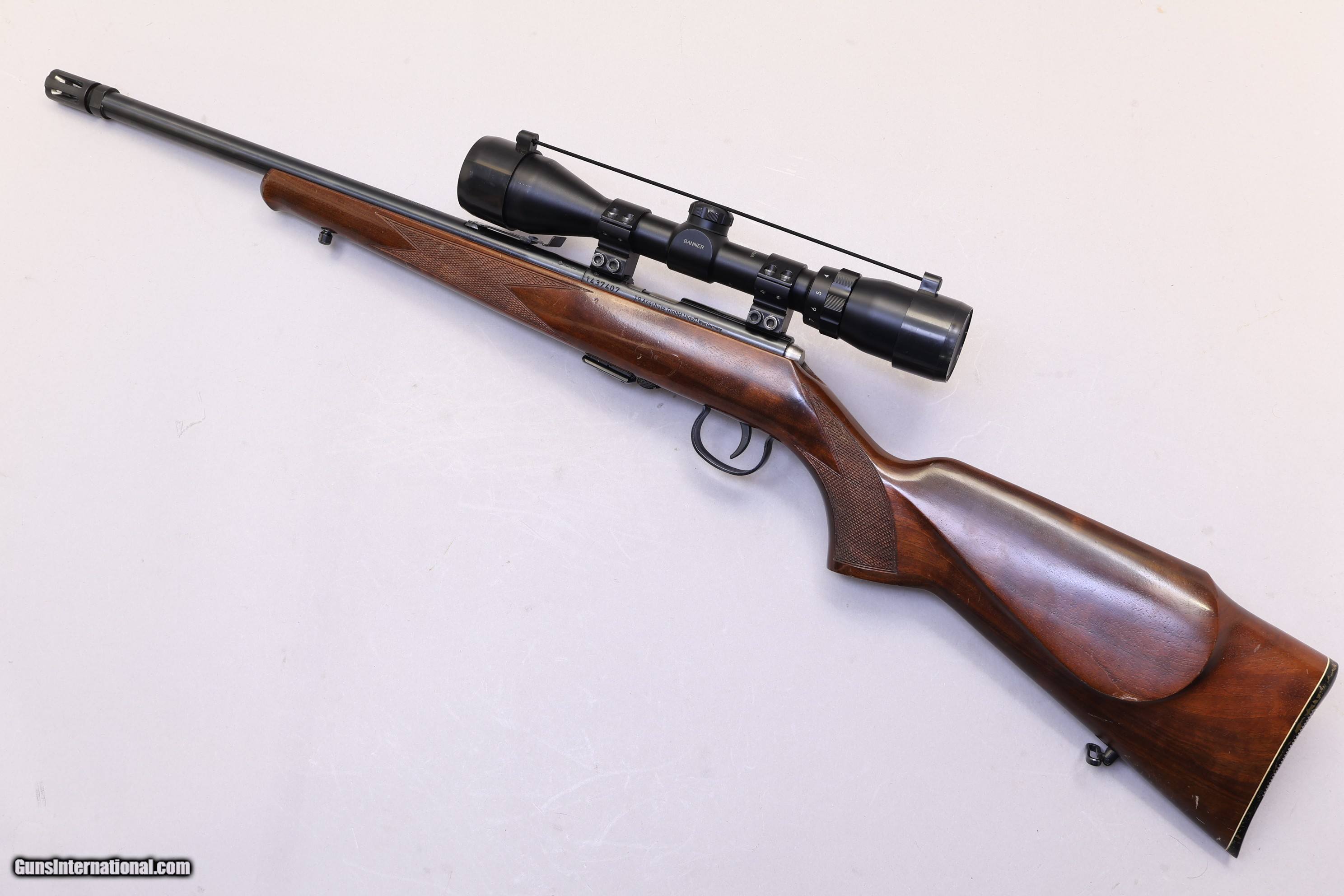 Description: Overall Length 33 3/4" | Good Condition The Anschütz Model 1451 is a German-made bolt-action rifle chambered in .22 LR, built with the solid workmanship the brand is known for. It offers dependable accuracy and a classic wood stock with a pistol grip, making it suitable for target work or small-game use. This rifle comes with a Banner 3–9×40 scope already mounted, along with its original bolt, detachable magazine, and a pin-welded flash hider. The stock shows a few light surface scratches, but the checkering remains sharp and the left-side cheekpiece provides comfortable sight alignment. The action cycles smoothly, and the rifle is clean, functional, and ready for its next owner.