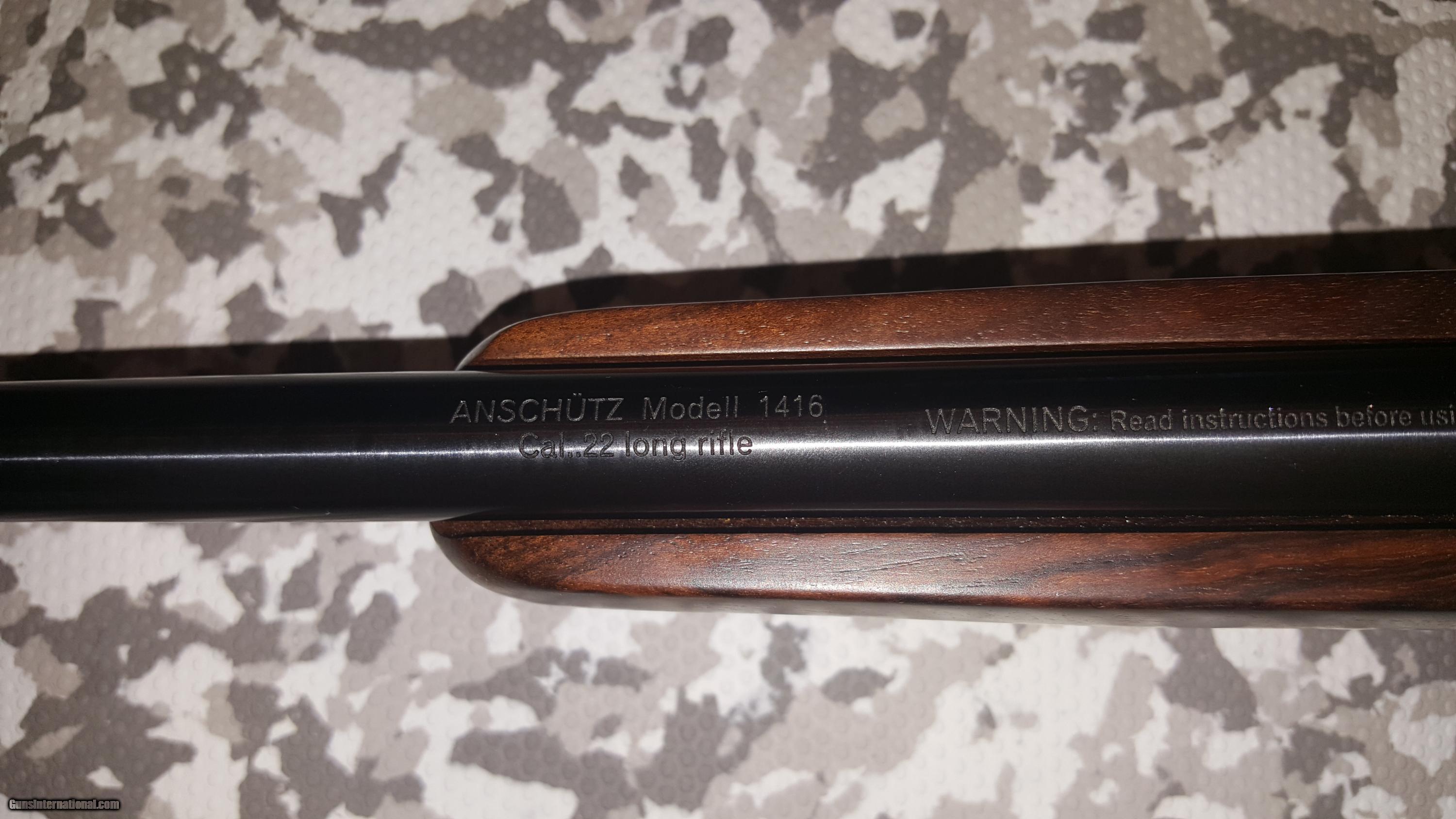 Description: Anschutz Model 1416D Classic 22 match rifle As new with box and books. Has extra 5 shot magazine, ramp front sight with hood, fold down adjustable rear sight, competition target sights with 5 apertures front and rear. Shot less than 3 boxes of shells. $1297.00 plus shipping to your local FFL dealer. Serial number 3123062DE SOLD |