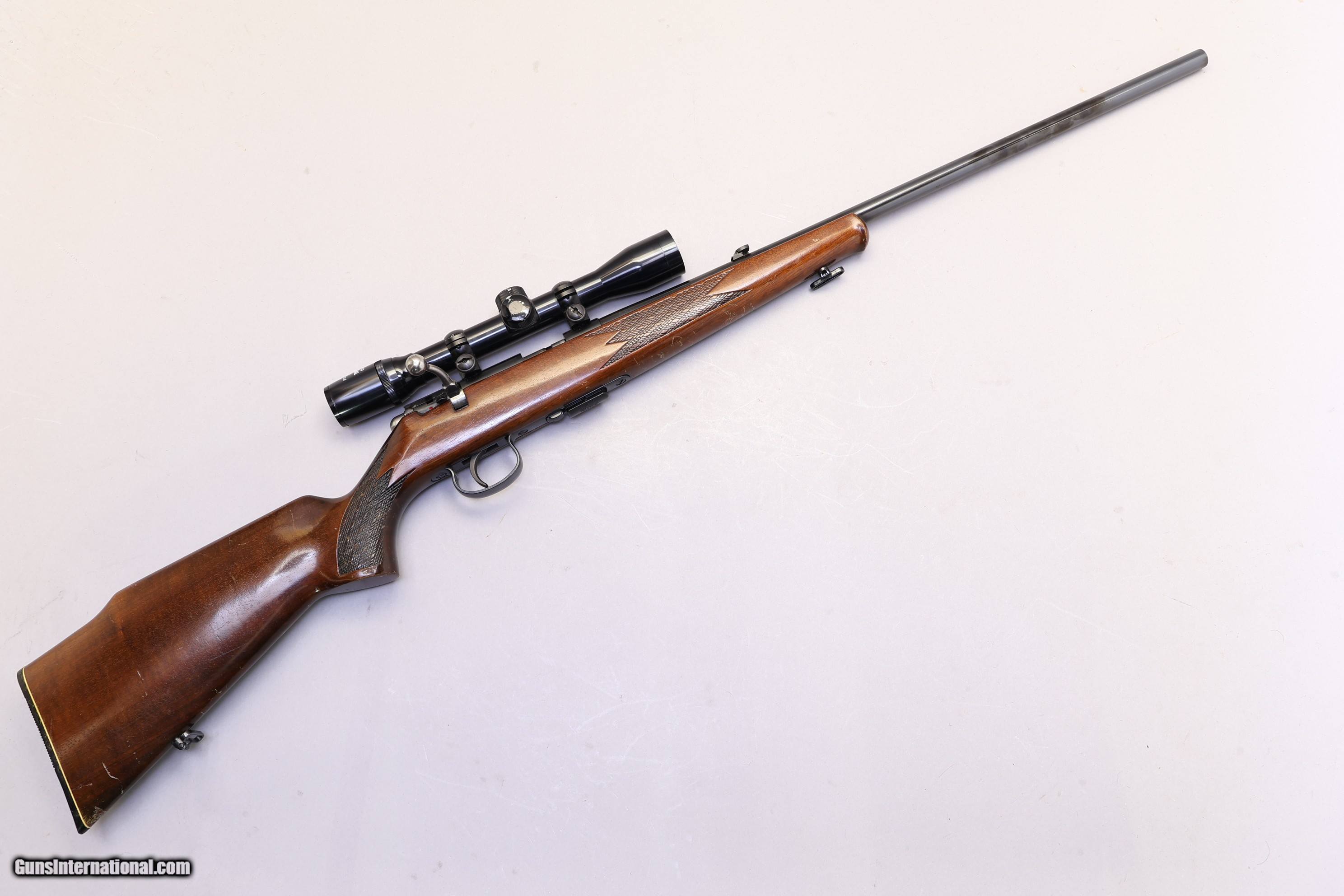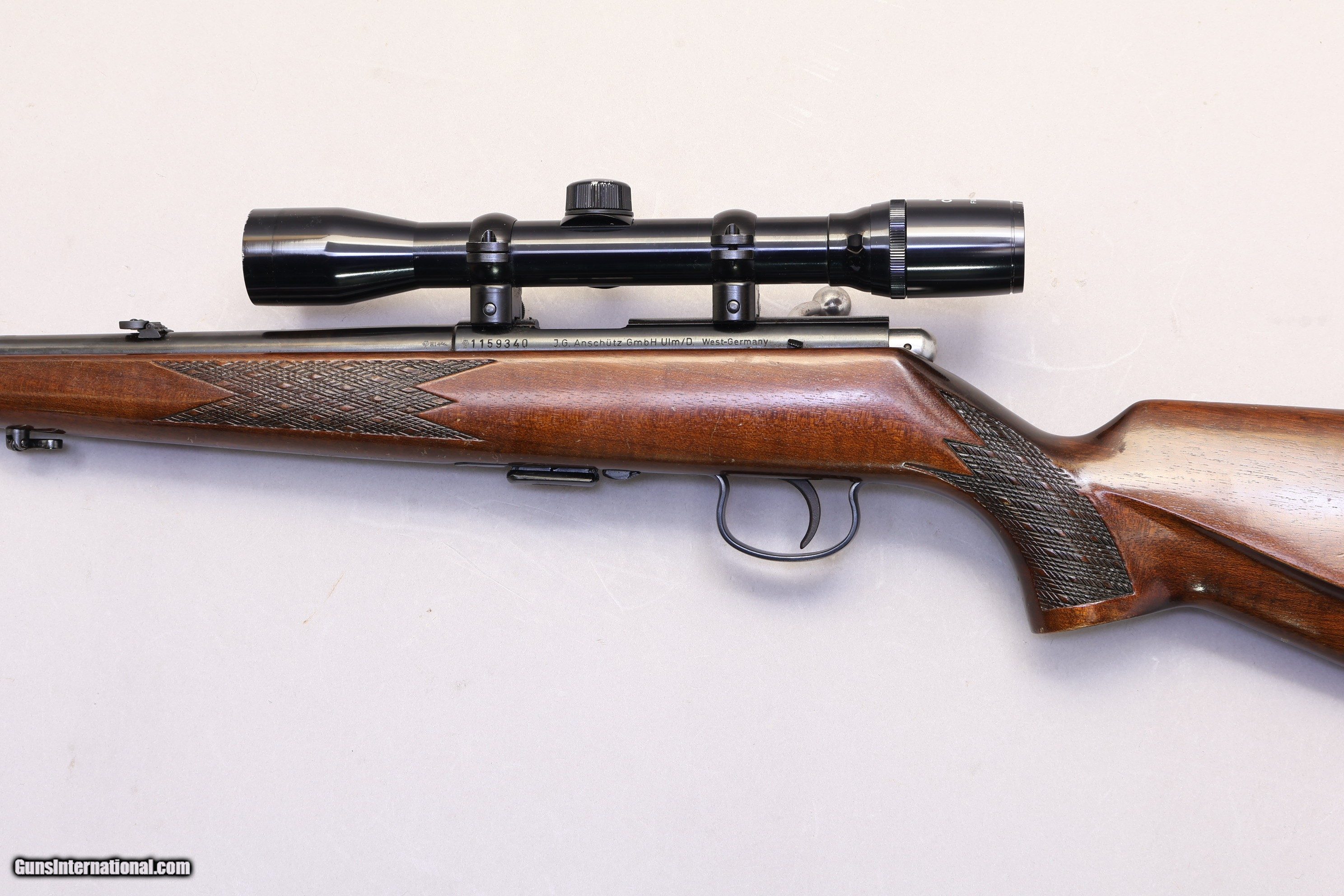 Description: Overall Length 40 1/2" | Good Condition The Anschütz 1415/16 in .22 LR is a well?built West?German bolt action rifle known for its smooth operation and dependable accuracy. It offers practical performance for target work and small?game shooting and comes fitted with an Original Model 10 4×32 scope for a clear sight picture. This rifle is in good working condition with honest wear on the wood, including some varnish loss and dents, while the barrel retains strong bluing. It includes a detachable magazine, and the stock has a raised cheekpiece on the left side for comfortable scope alignment. A solid and accurate rimfire suitable for range use, training, or general sporting needs.