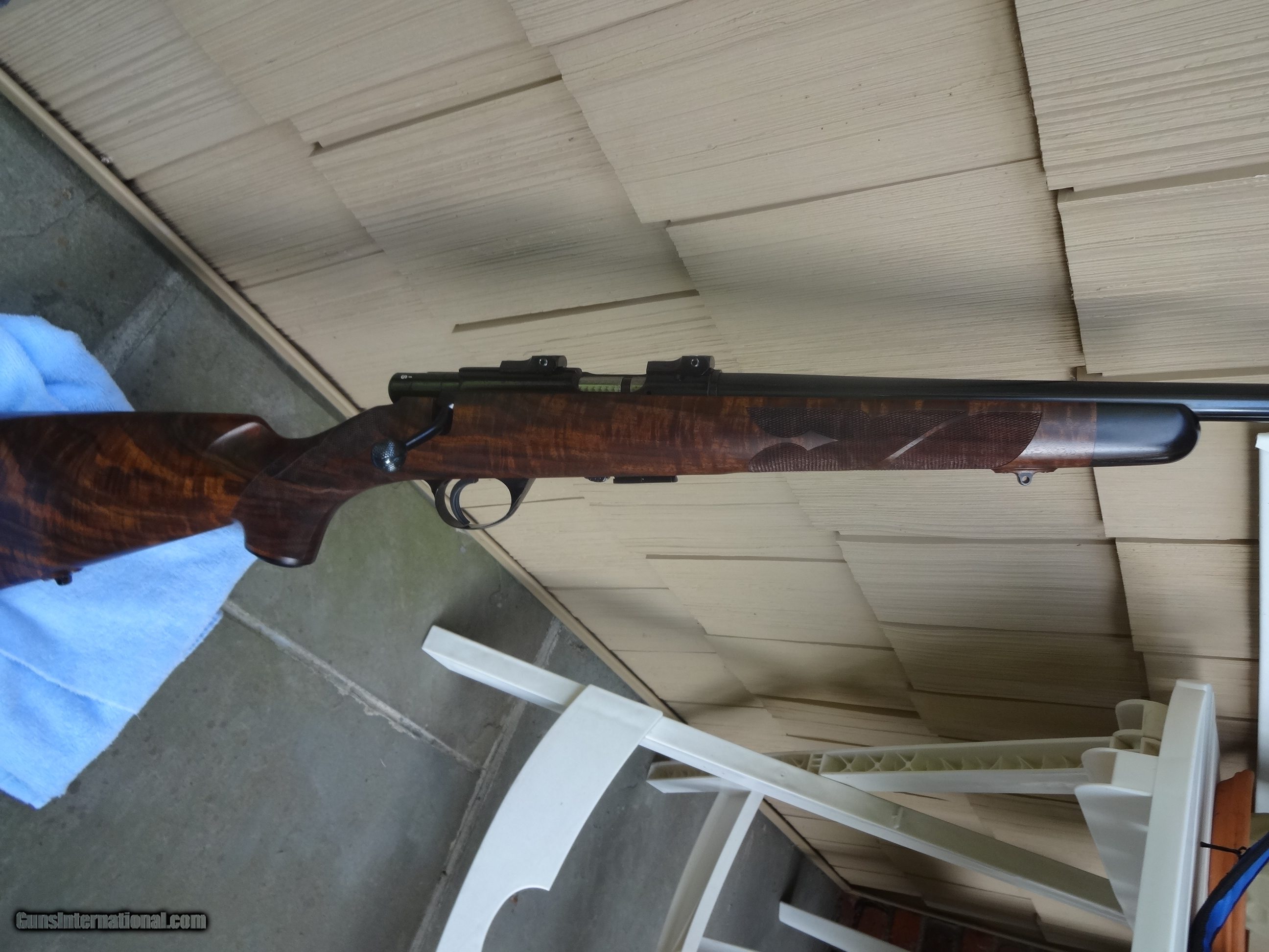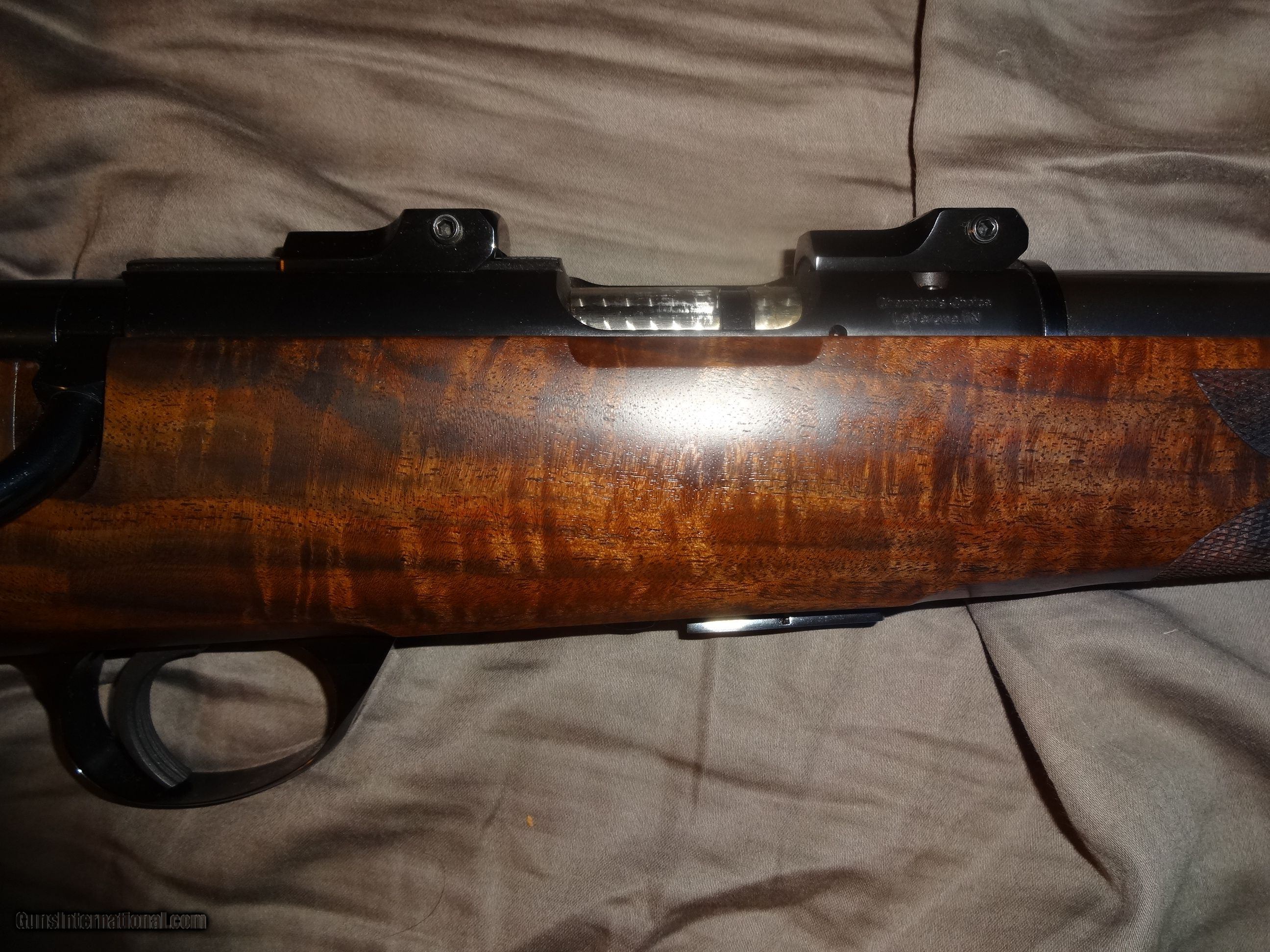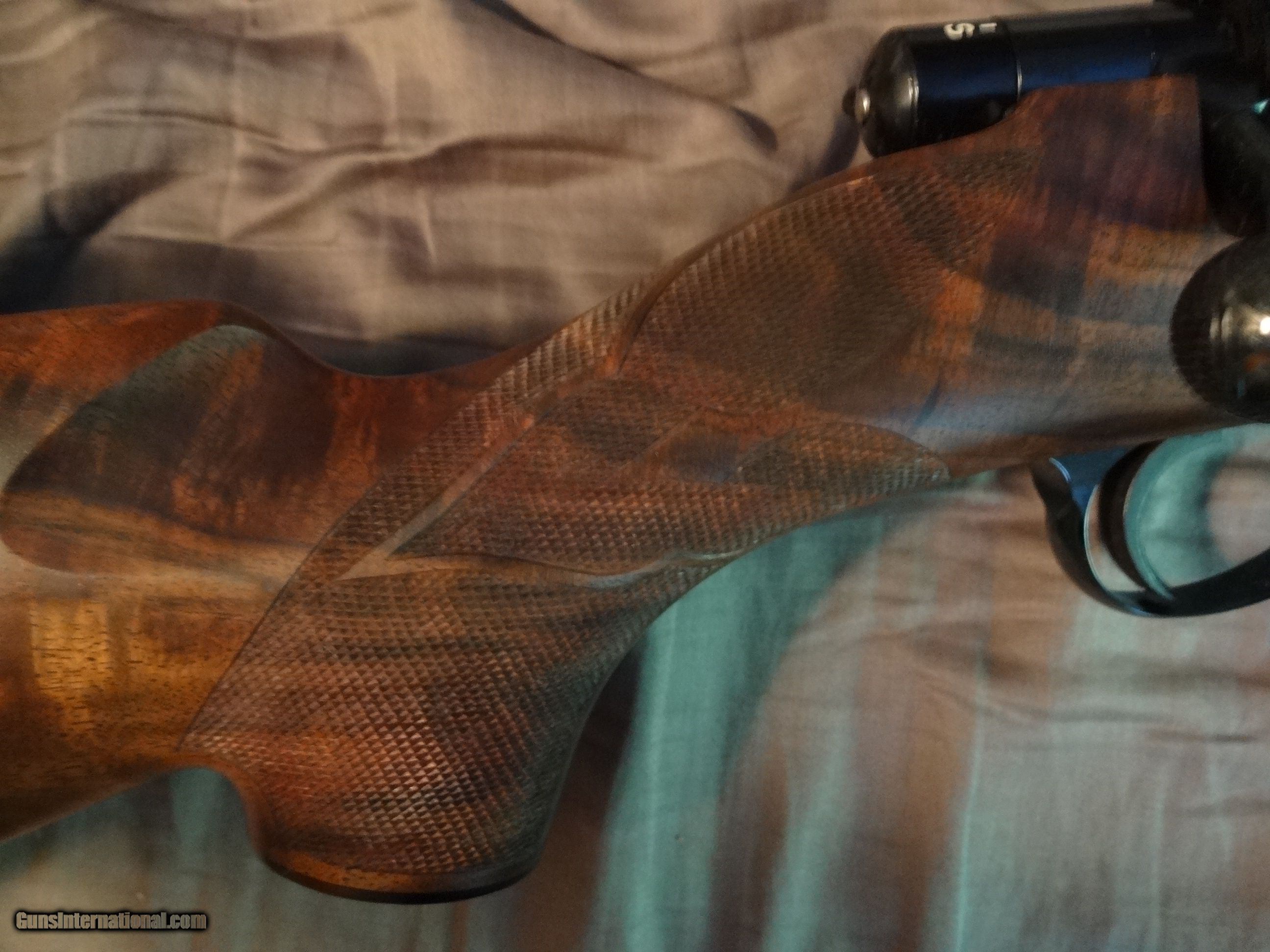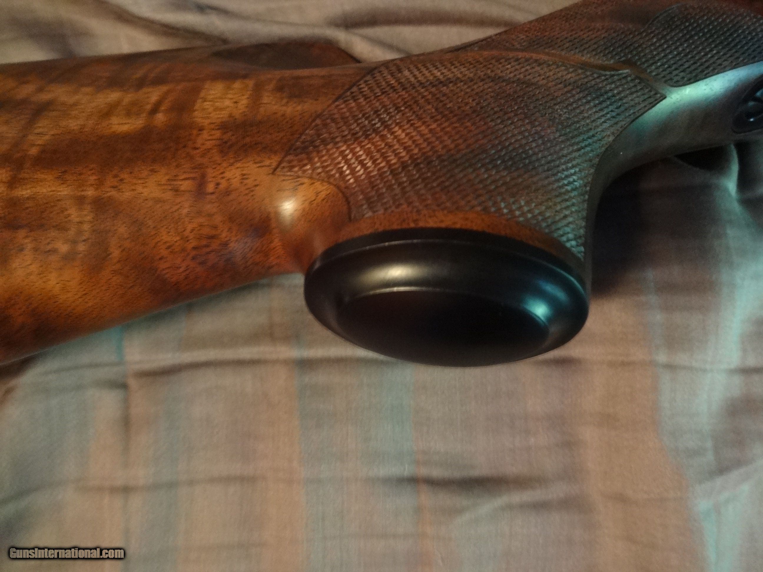 Description: SPF Built in 2007 using a new 2006 wing safety action.14" LOP. Exhibition claro.It remains unfired and flawless(other than factory test group) Manual is present.Fitted with a single stage trigger,with a lighter spring installed. Weight is 7 lbs 3 ounces with the bases installed.Well below current build cost,if you could even find some of the components.Not interested in trades or offers.Thank you. Options: Ebony tip Deluxe handmade ebony grip cap One piece steel triggerguard Steel bolt knob Checkering for knob Jeweled bolt Canyon Creek checkering pattern with spades Neidner buttplate Raised inletted swivels(guns with this option have a more slender stock) NOS S/A magazine,fitted with a gloss steel Cooper floorplate. Add the full gloss S&K bases and low rings for $100. Shipped in a plastic hard case,insured,FFL to FFL. Shipping with be $80. SOLD |