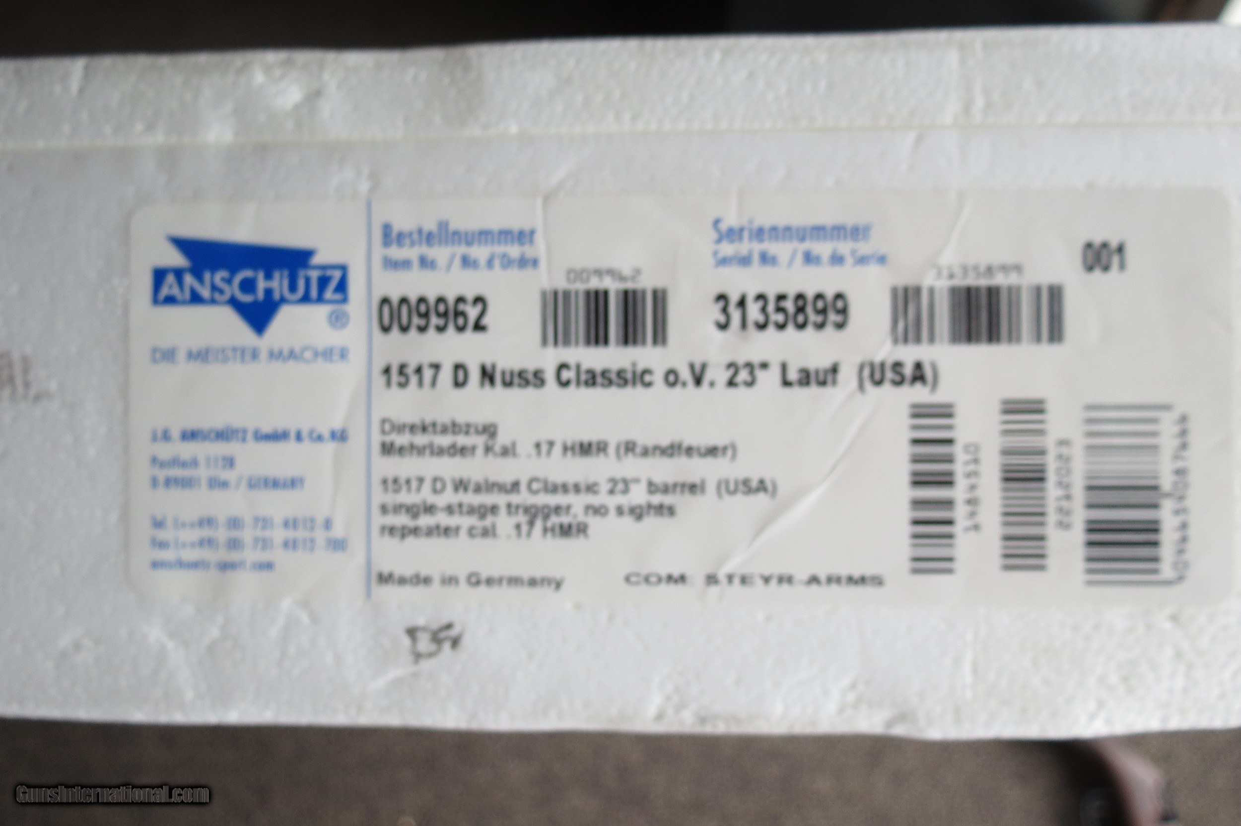 Description: New in box Anschutz Model 1517 in 17 HMR. 23" Barrel, Match 64 action, Single stage trigger, Classic walnut checkered stock. 1:9" rate of twist, Rubber butt plate, 4-round magazine. Bolt still in box not shown, Shipping/Insurance $45 SOLD Manufacturer: Anschutz Model: 1517 Caliber Info: 17 HMR Condition: New in Box |