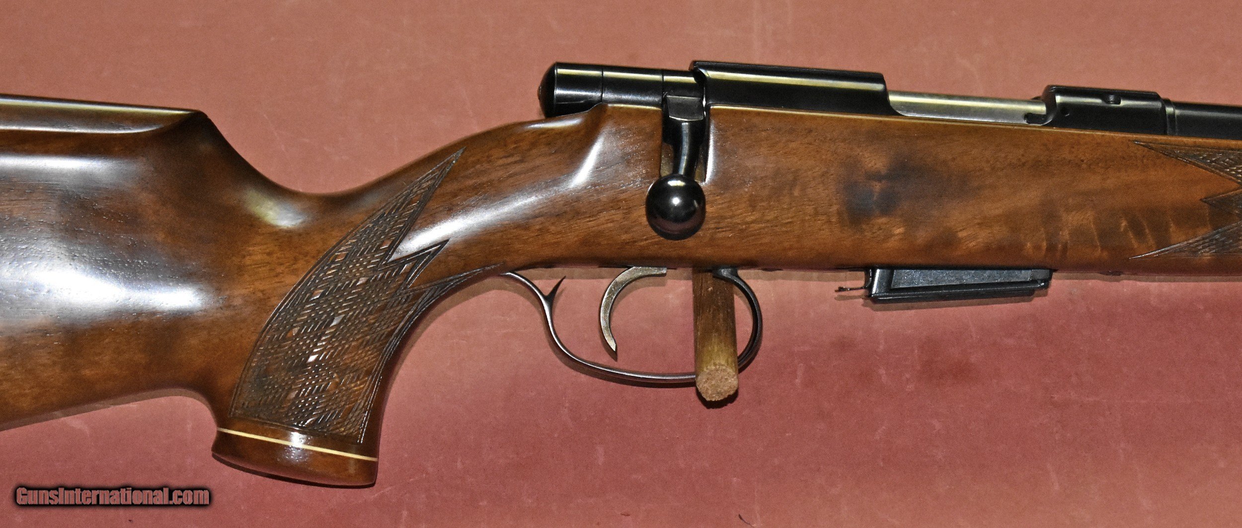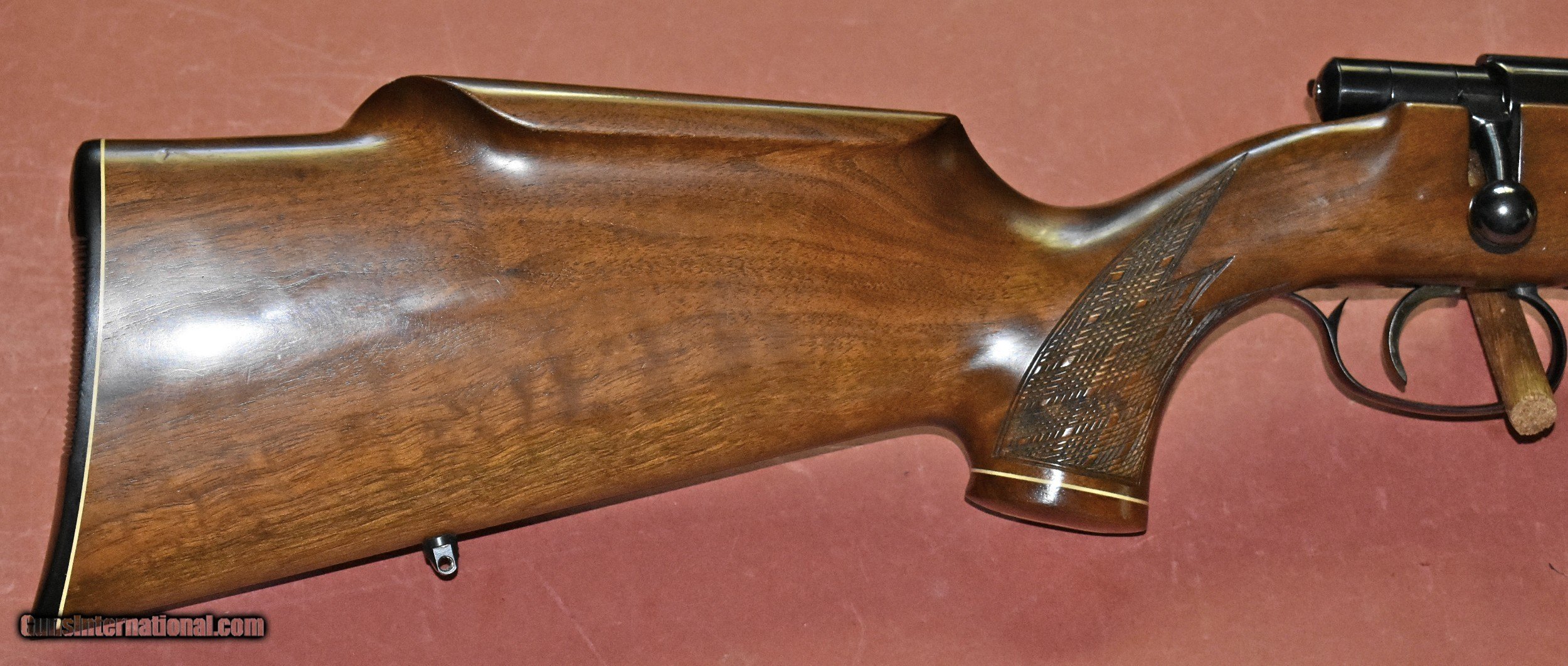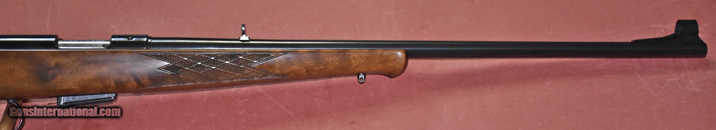 Description: West German built Anschutz model 1432 in the hard to find 22 Hornet.Built in the late 1970s,this rifle is in excellent all original condition.It retains 99% of the original blue and wood finish and has not been altered in any way.The bore is mint with sharp well defined rifling.It does not appear that there has ever been a scope mounted on the rifle..A difficult caliber to find in this model Anschutz. SOLD Manufacturer: Anschutz- West German Serial Number: 1276376 Barrel Length: 24 Caliber Info: 22 Hornet Metal Condition: mint Wood Condition: excellent Bore Condition: mint Action: bolt |