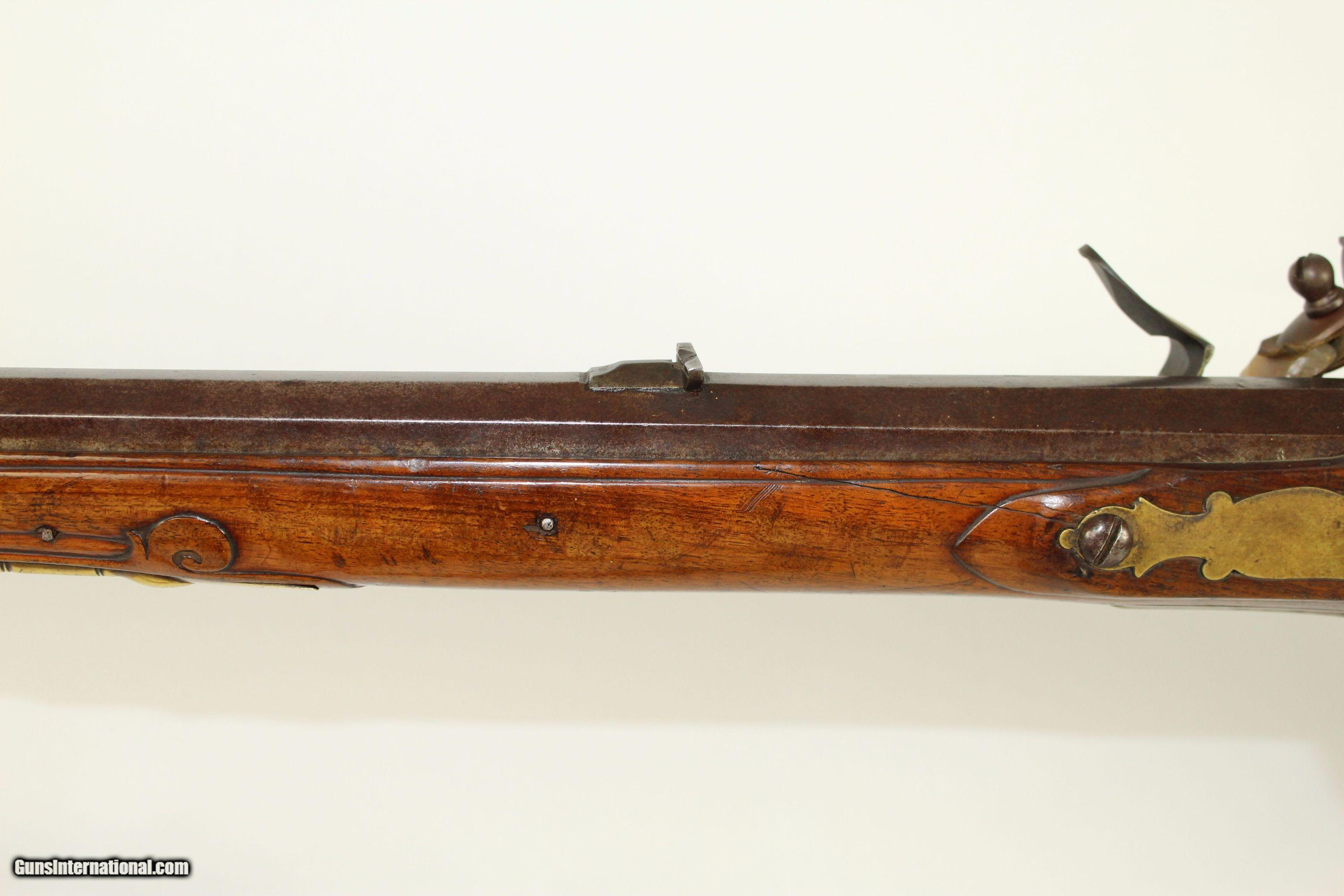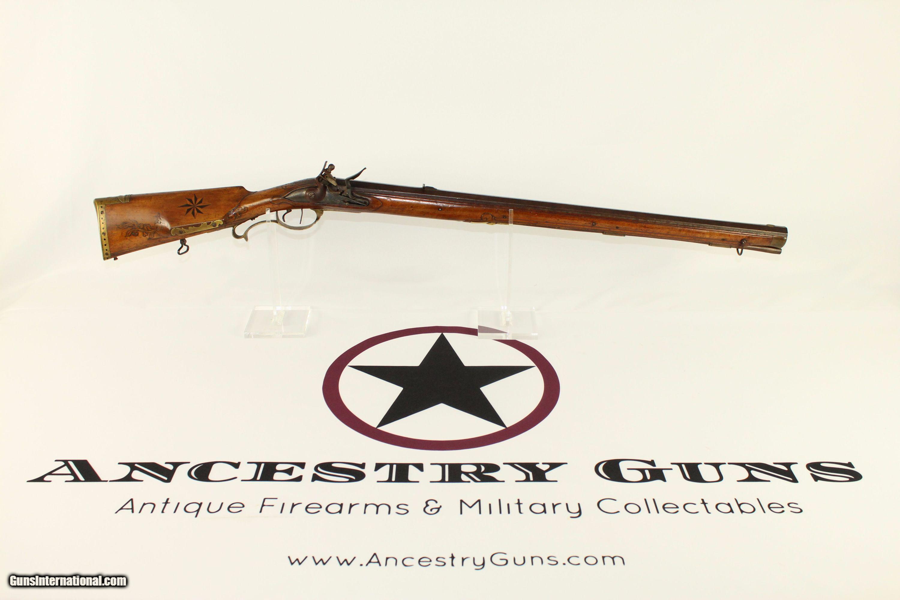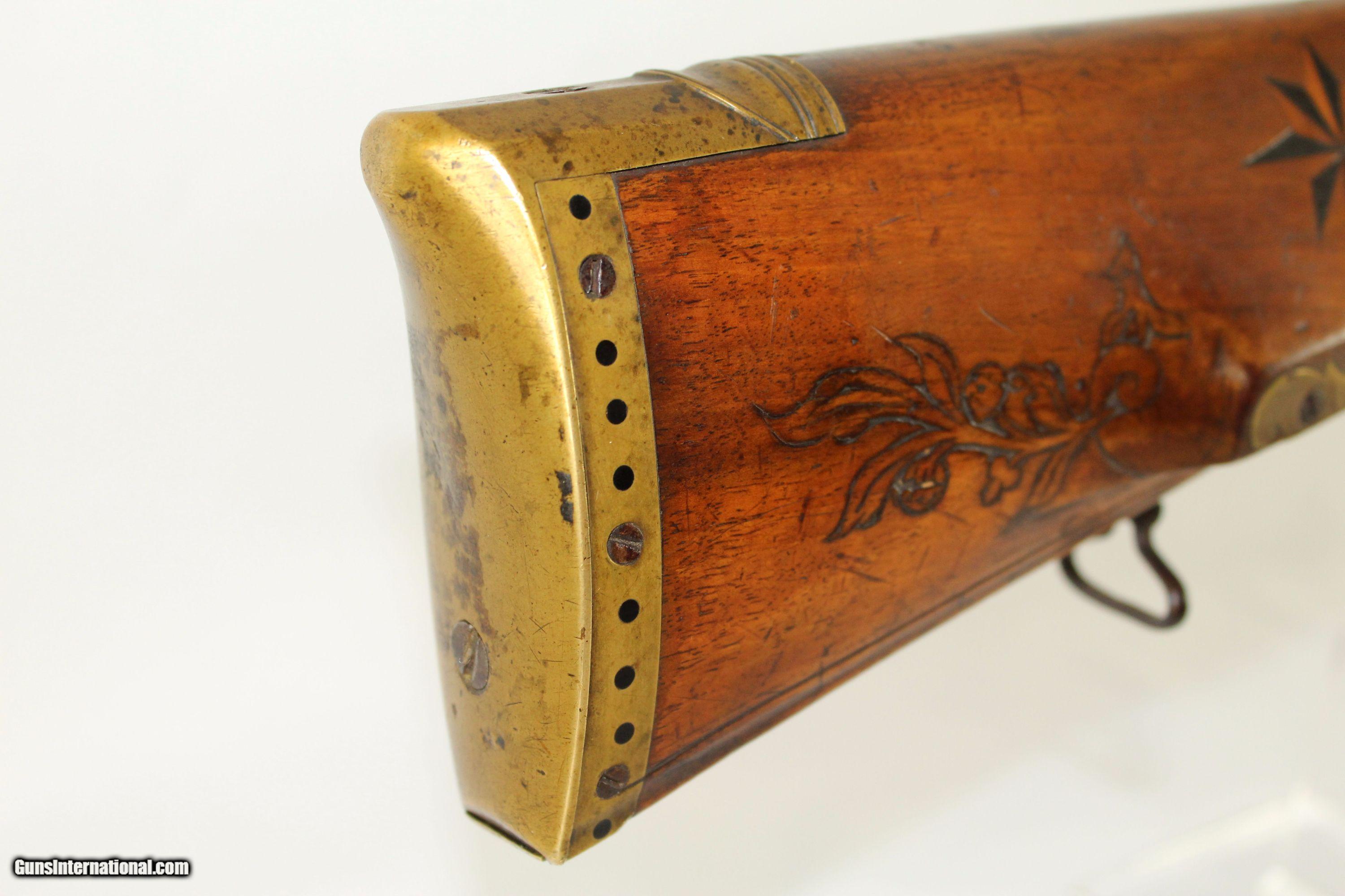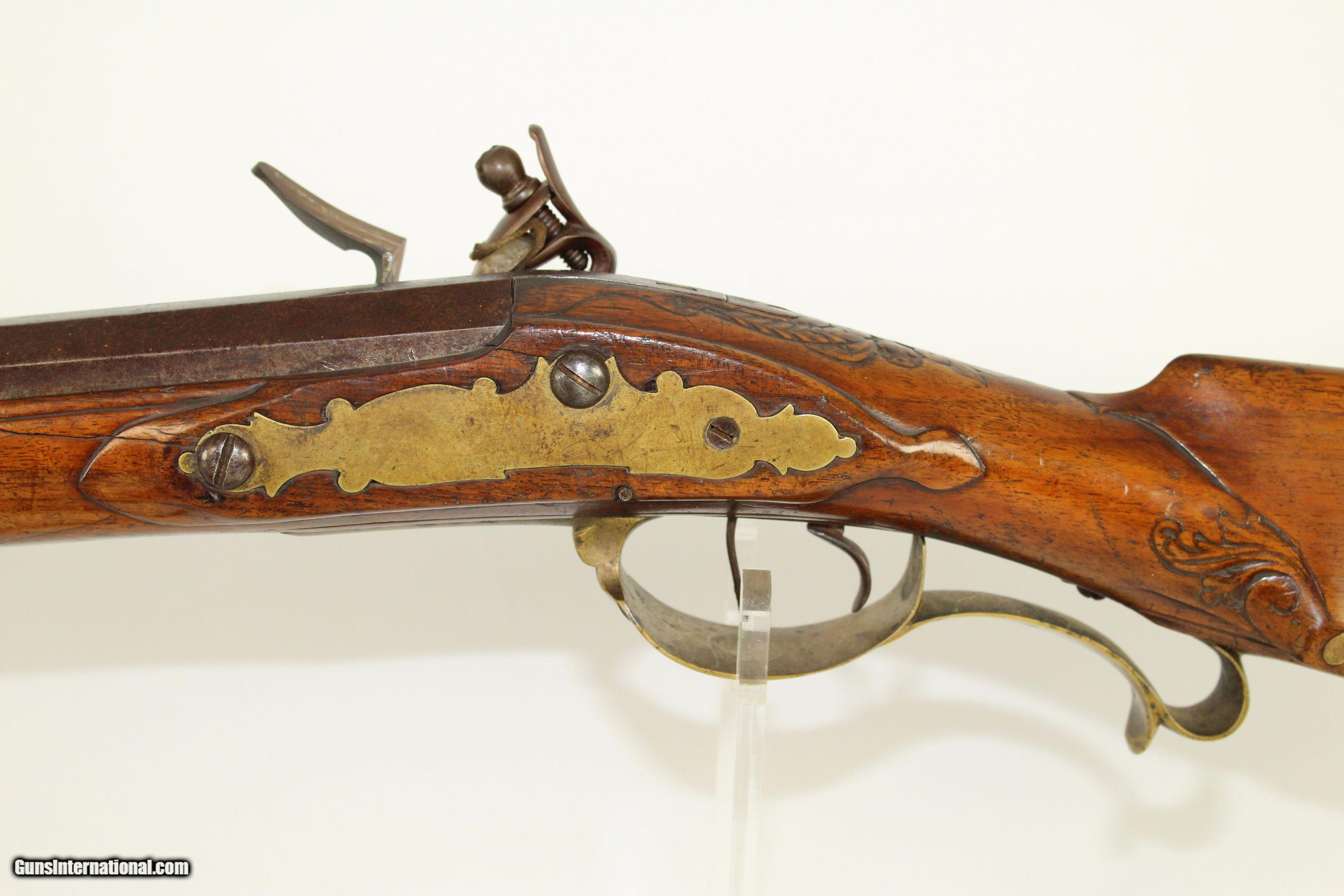 Description: 1700s Antique German Jaeger Flintlock Rifle With Carved and Inlaid Stock and Double Set Trigger Here we present an antique Germanic Jaeger Flintlock Rifle, made circa the 18th century. What is now recognized as the Jaeger type of rifle, goes back to at least the early 17th century. It is characterized by its short overall length, robust octagonal barrel and usually a substantial butt stock with raised cheek pieces and a patch box. This made it very handy to carry and load for the forester or hunter where it originated in the Hesse and Bavaria regions of Germany. In fact, the jaeger was very influential in the design of what is now considered the American (Kentucky/Pennsylvania) Long Rifle. This was due to the jaeger’s use by some of the Hessian mercenaries during the American Revolutionary War, as well as the number of German immigrants that congregated in Pennsylvania in the 18th century. In addition, several countries liked the concept of the short jaeger rifle so much that they designed their military long arms after it. This example was likely made in the 18th century, whether in Prussia or colonial America is unknown. It utilizes a flintlock firing mechanism. It has a short, stout, 30 inch octagonal barrel with a large bore of .60 caliber. The wood stock is nicely carved, with two hunter’s stars or compass roses, one on each side of the butt stock. The patch box on this one is located at the toe of the butt, and is a brass door that slides out. There is decorative brass throughout, including the pistol grip style trigger guard. The firing mechanism features a very nice double set trigger. The stock shows some handling, and aside from a couple minor cracks, is very solid and in good condition. Here is a very nice example of a Germanic hunting arm. Own the original! This is a legitimate antique and not a reproduction. Barrel is 30 inches in length. Caliber: .60 percussion Overall condition as seen in photos. Very Fast. Very Safe. FREE SHIPPING WORLDWIDE. Delivered directly to your door by express mail! Guaranteed AUTHENTIC & Includes CERTIFICATE OF AUTHENTICITY. ancestryguns $3250 #10286 SOLD Antique: Yes |