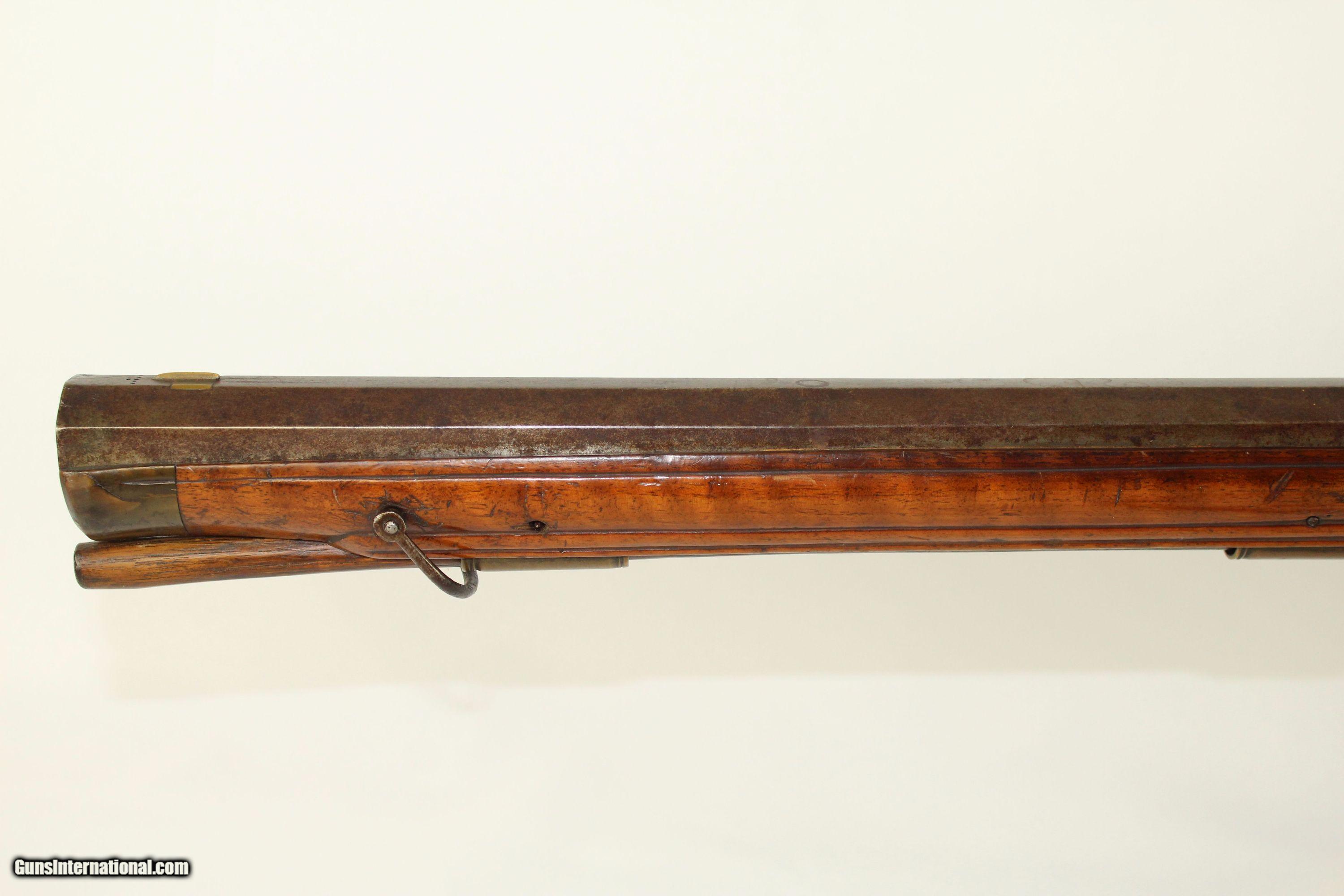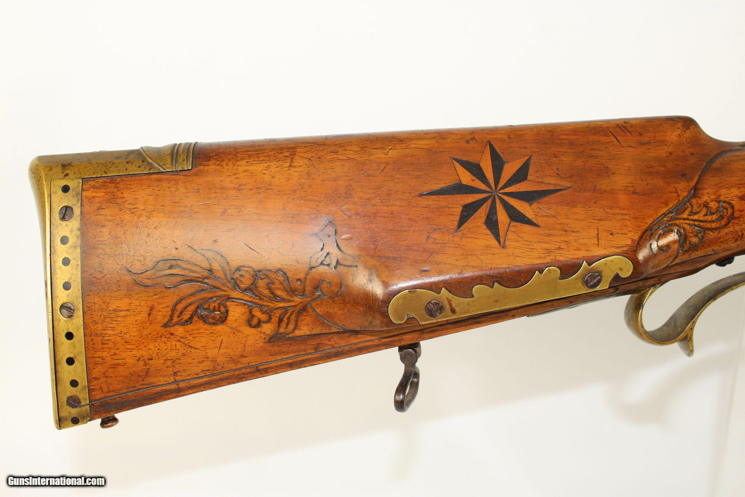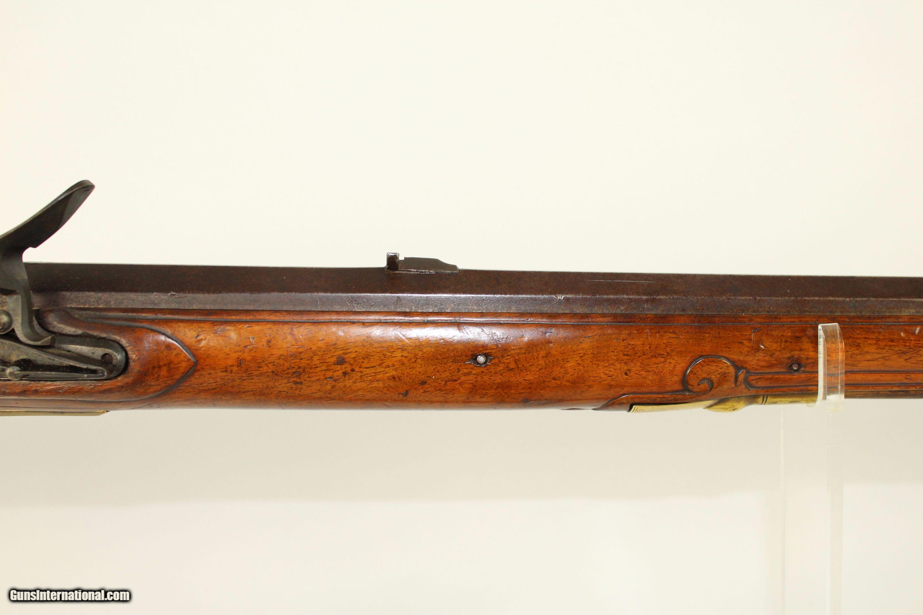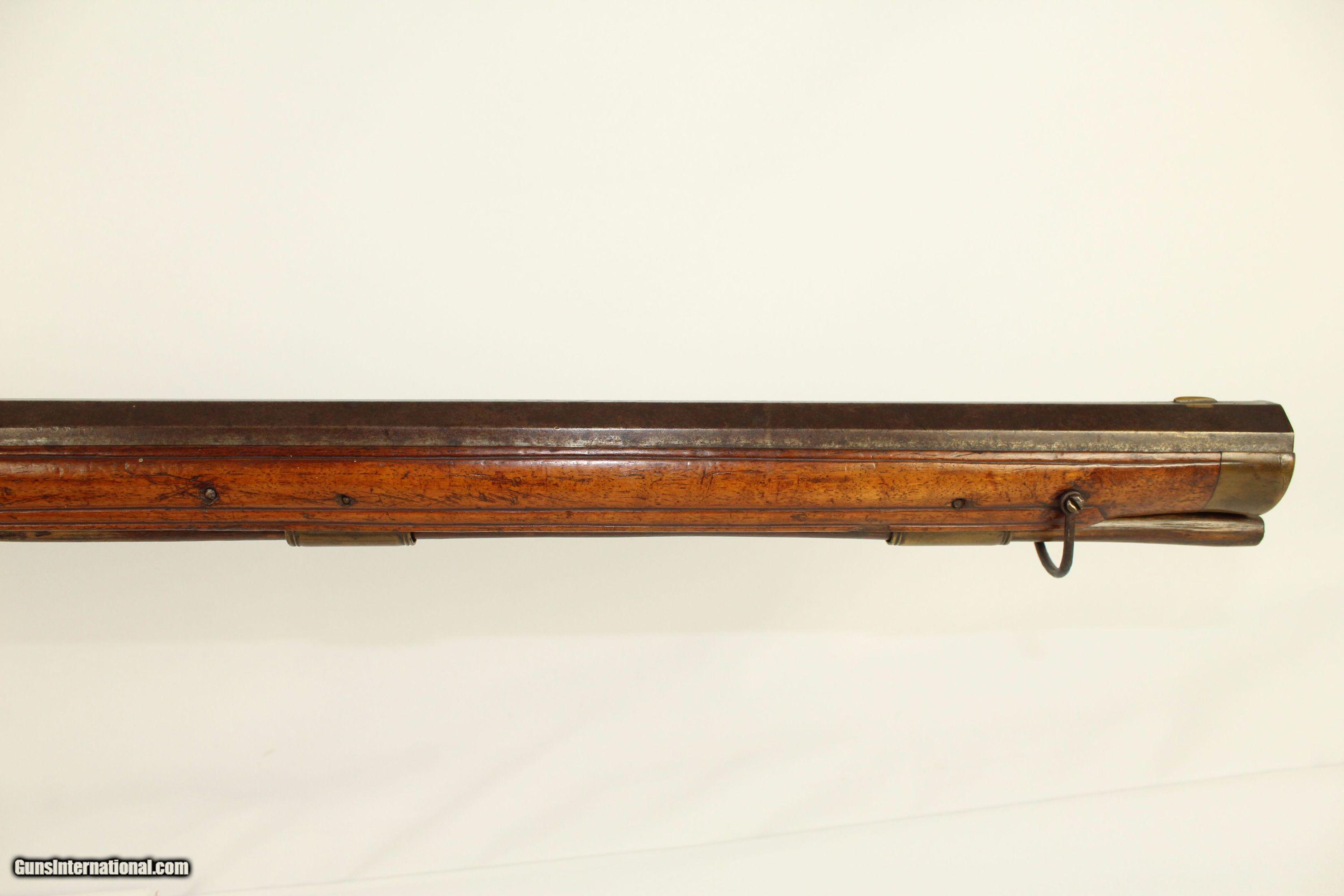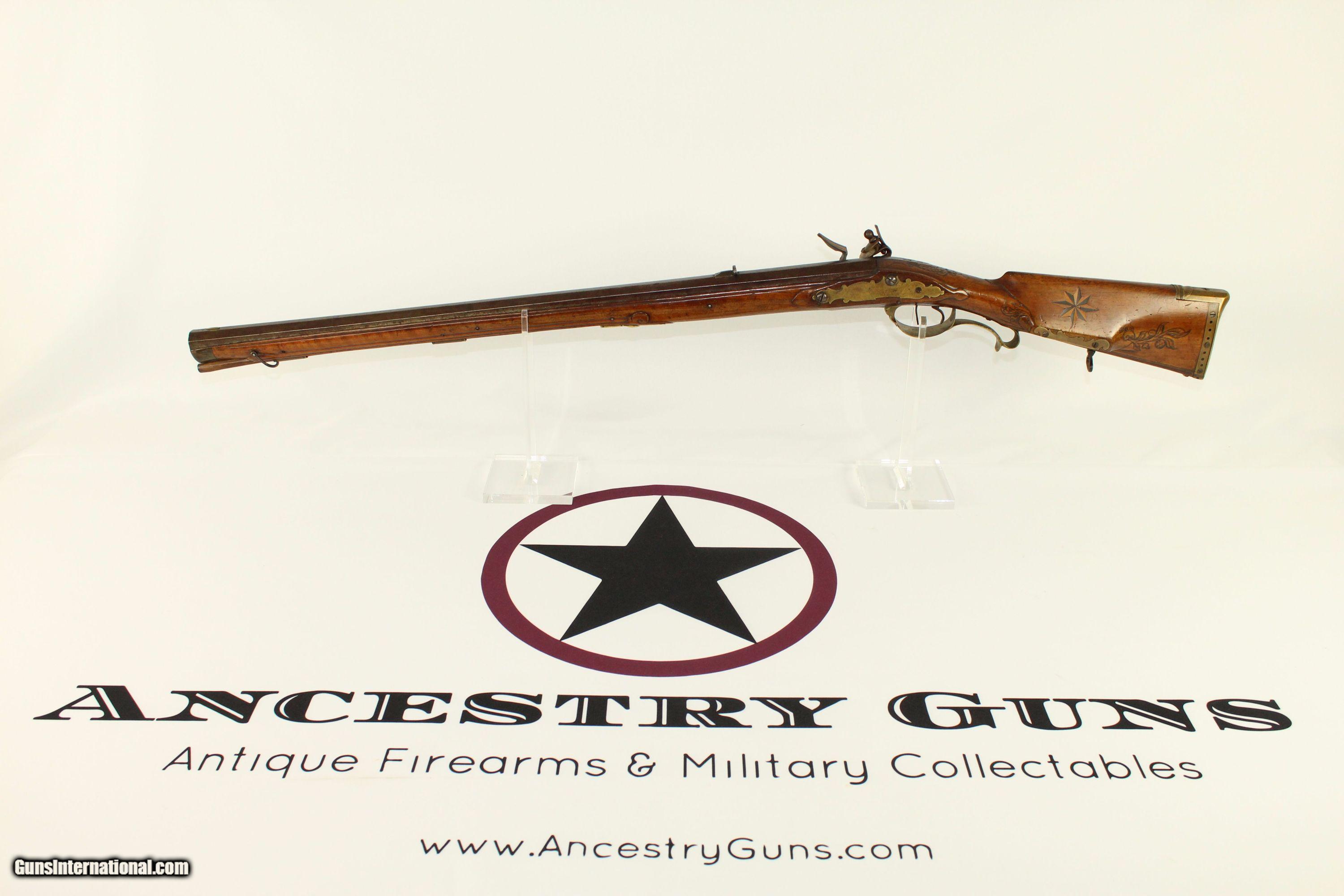 Description: 1700s Antique German Jaeger Flintlock Rifle With Carved and Inlaid Stock and Double Set Trigger Here we present an antique Germanic Jaeger Flintlock Rifle, made circa the 18th century. What is now recognized as the Jaeger type of rifle, goes back to at least the early 17th century. It is characterized by its short overall length, robust octagonal barrel and usually a substantial butt stock with raised cheek pieces and a patch box. This made it very handy to carry and load for the forester or hunter where it originated in the Hesse and Bavaria regions of Germany. In fact, the jaeger was very influential in the design of what is now considered the American (Kentucky/Pennsylvania) Long Rifle. This was due to the jaeger’s use by some of the Hessian mercenaries during the American Revolutionary War, as well as the number of German immigrants that congregated in Pennsylvania in the 18th century. In addition, several countries liked the concept of the short jaeger rifle so much that they designed their military long arms after it. This example was likely made in the 18th century, whether in Prussia or colonial America is unknown. It utilizes a flintlock firing mechanism. It has a short, stout, 30 inch octagonal barrel with a large bore of .60 caliber. The wood stock is nicely carved, with two hunter’s stars or compass roses, one on each side of the butt stock. The patch box on this one is located at the toe of the butt, and is a brass door that slides out. There is decorative brass throughout, including the pistol grip style trigger guard. The firing mechanism features a very nice double set trigger. The stock shows some handling, and aside from a couple minor cracks, is very solid and in good condition. Here is a very nice example of a Germanic hunting arm. Own the original! This is a legitimate antique and not a reproduction. Barrel is 30 inches in length. Caliber: .60 percussion Overall condition as seen in photos. Very Fast. Very Safe. FREE SHIPPING WORLDWIDE. Delivered directly to your door by express mail! Guaranteed AUTHENTIC & Includes CERTIFICATE OF AUTHENTICITY. ancestryguns $3250 #10286 SOLD Antique: Yes |