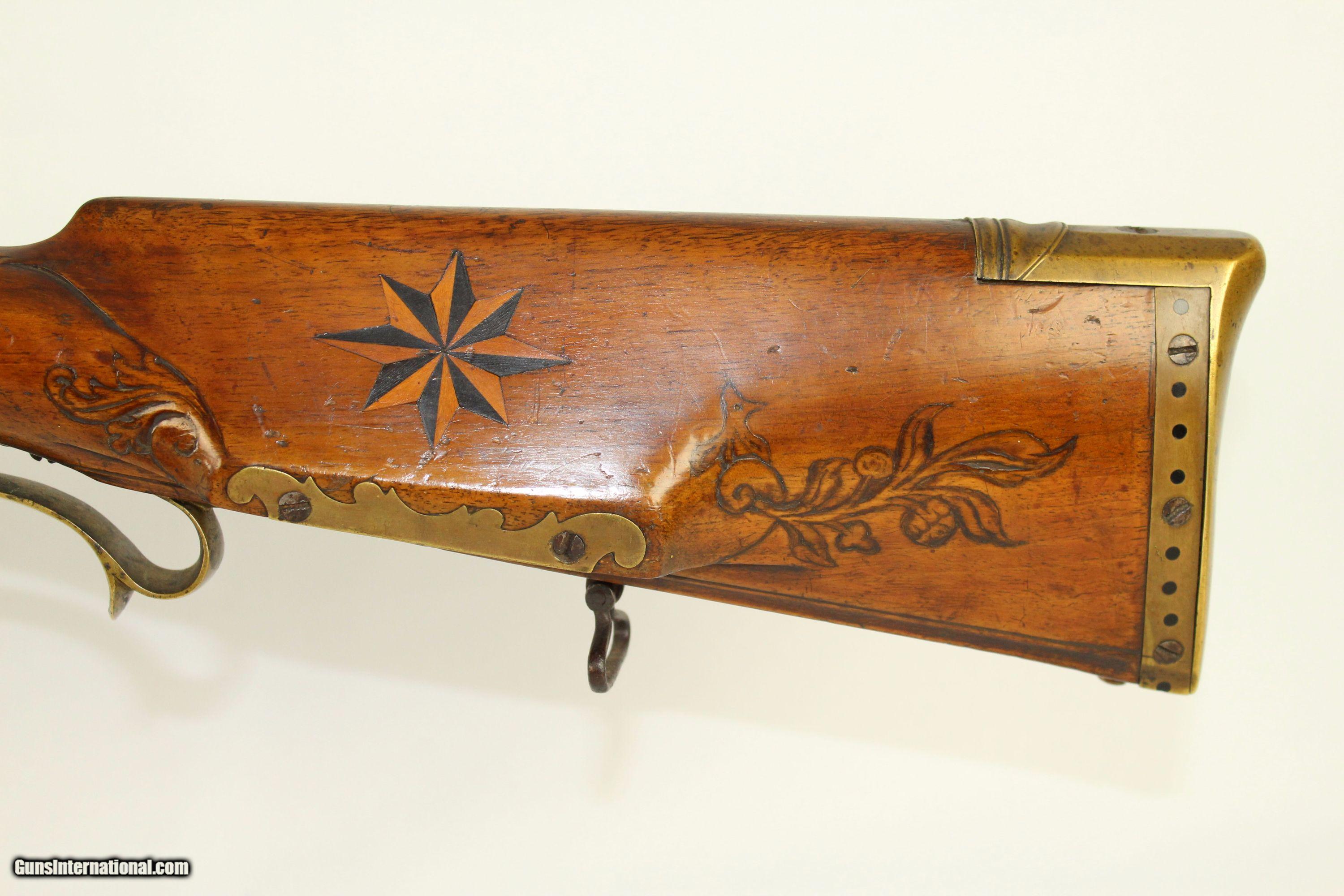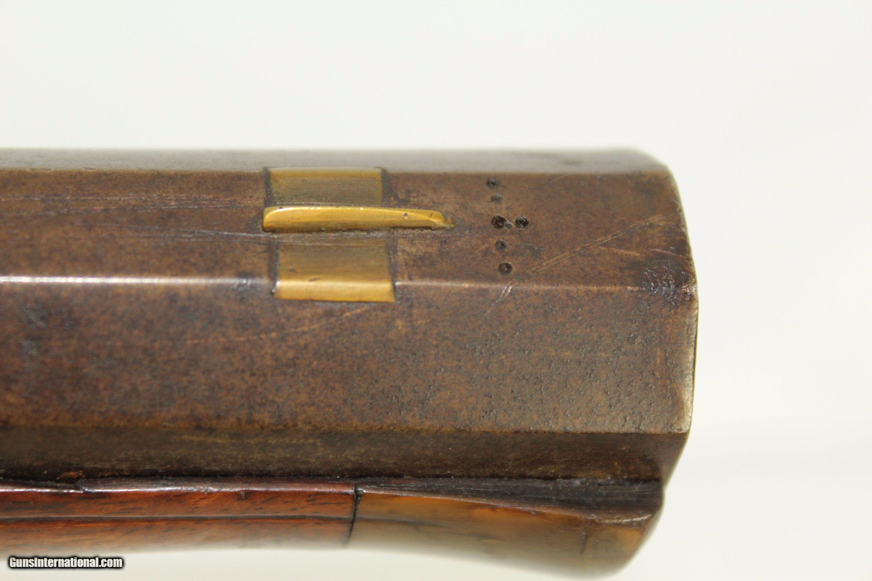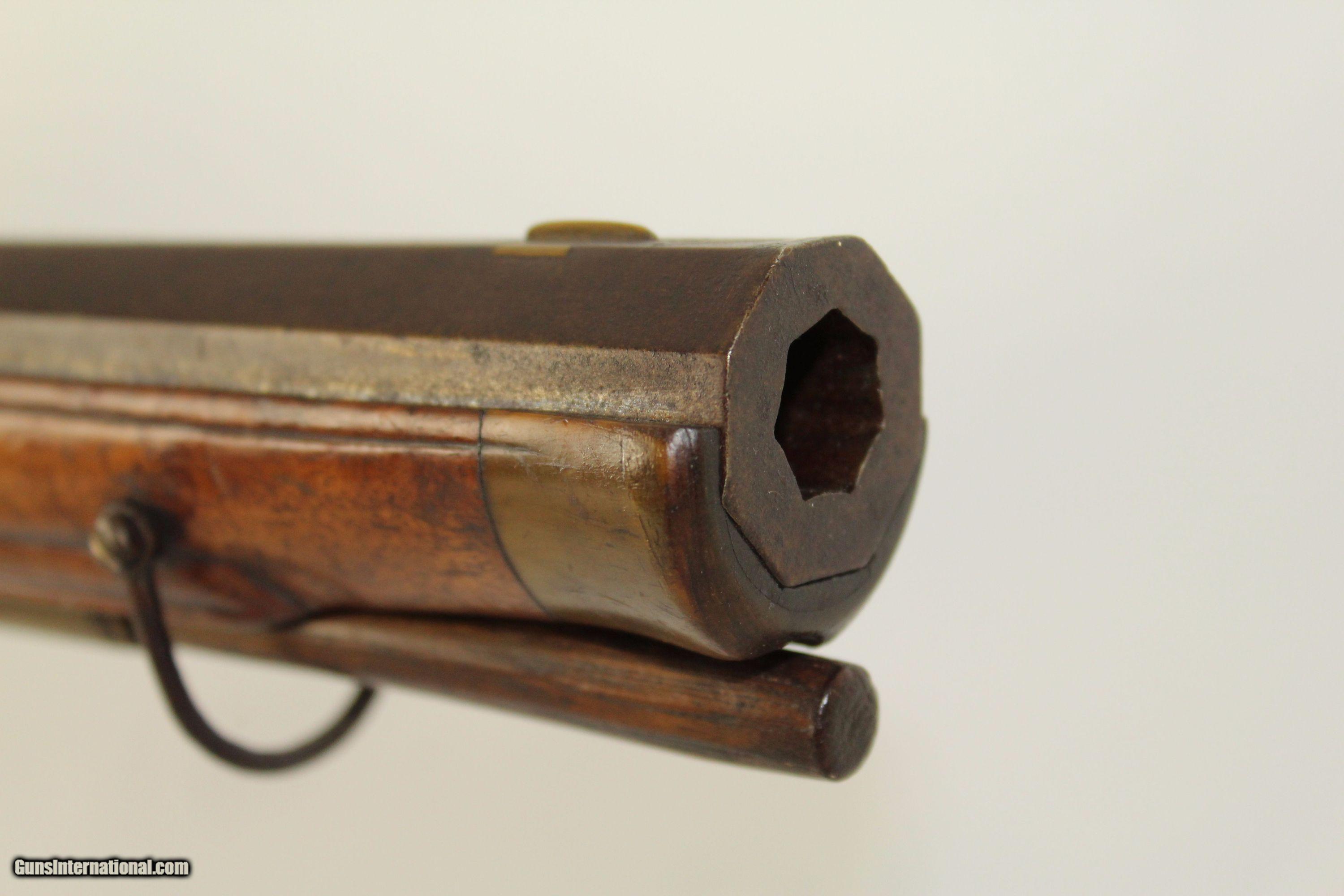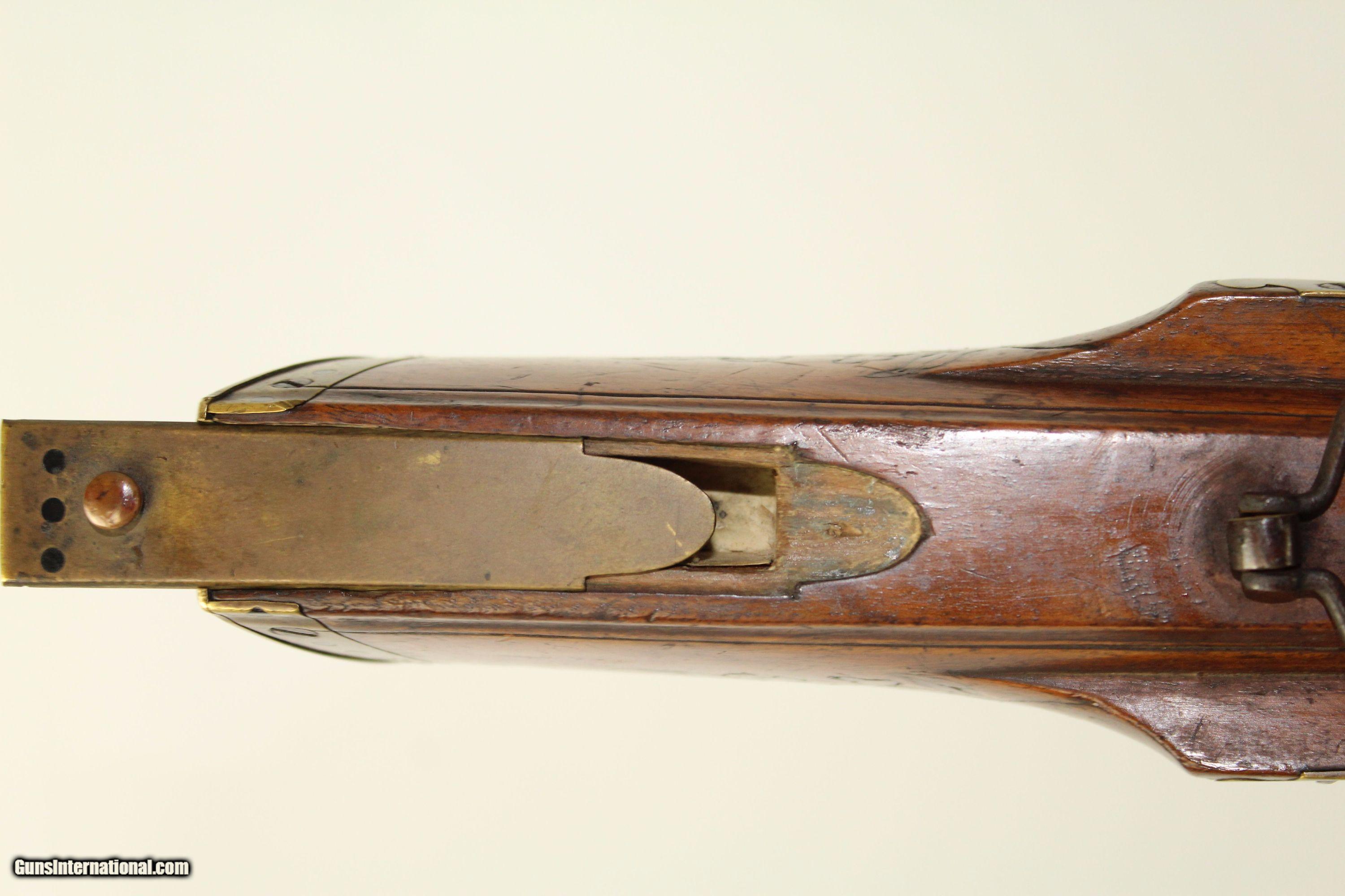 Description: 1700s Antique German Jaeger Flintlock Rifle With Carved and Inlaid Stock and Double Set Trigger Here we present an antique Germanic Jaeger Flintlock Rifle, made circa the 18th century. What is now recognized as the Jaeger type of rifle, goes back to at least the early 17th century. It is characterized by its short overall length, robust octagonal barrel and usually a substantial butt stock with raised cheek pieces and a patch box. This made it very handy to carry and load for the forester or hunter where it originated in the Hesse and Bavaria regions of Germany. In fact, the jaeger was very influential in the design of what is now considered the American (Kentucky/Pennsylvania) Long Rifle. This was due to the jaeger’s use by some of the Hessian mercenaries during the American Revolutionary War, as well as the number of German immigrants that congregated in Pennsylvania in the 18th century. In addition, several countries liked the concept of the short jaeger rifle so much that they designed their military long arms after it. This example was likely made in the 18th century, whether in Prussia or colonial America is unknown. It utilizes a flintlock firing mechanism. It has a short, stout, 30 inch octagonal barrel with a large bore of .60 caliber. The wood stock is nicely carved, with two hunter’s stars or compass roses, one on each side of the butt stock. The patch box on this one is located at the toe of the butt, and is a brass door that slides out. There is decorative brass throughout, including the pistol grip style trigger guard. The firing mechanism features a very nice double set trigger. The stock shows some handling, and aside from a couple minor cracks, is very solid and in good condition. Here is a very nice example of a Germanic hunting arm. Own the original! This is a legitimate antique and not a reproduction. Barrel is 30 inches in length. Caliber: .60 percussion Overall condition as seen in photos. Very Fast. Very Safe. FREE SHIPPING WORLDWIDE. Delivered directly to your door by express mail! Guaranteed AUTHENTIC & Includes CERTIFICATE OF AUTHENTICITY. ancestryguns $3250 #10286 SOLD Antique: Yes |