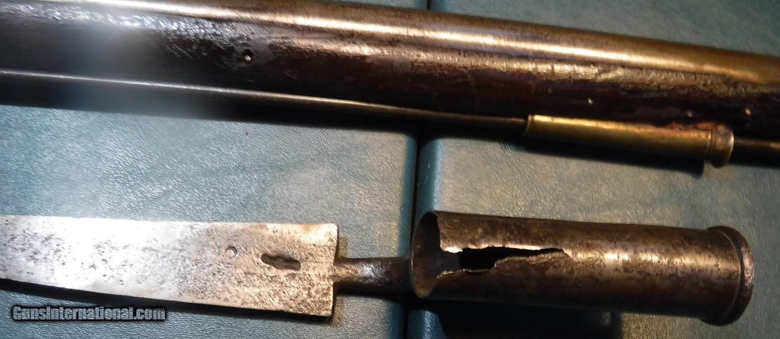 Description: U S FLINTLOCK MUSKET - 42" BARREL - BRASS FURNTURE - U S MARKING ON REAR OF LOCK - NO OTHER VISIBLE OR READABLE MARKINGS - LOCK IN WORKING ORDER - HEAVY PITTING ON OUTSIDE OF BARREL AND LOCK - WOOD HAS SOME CRACKS AND MARS - RAM ROD WITH GUN AS WELL AS A SOCKET BAYONET SOLD |