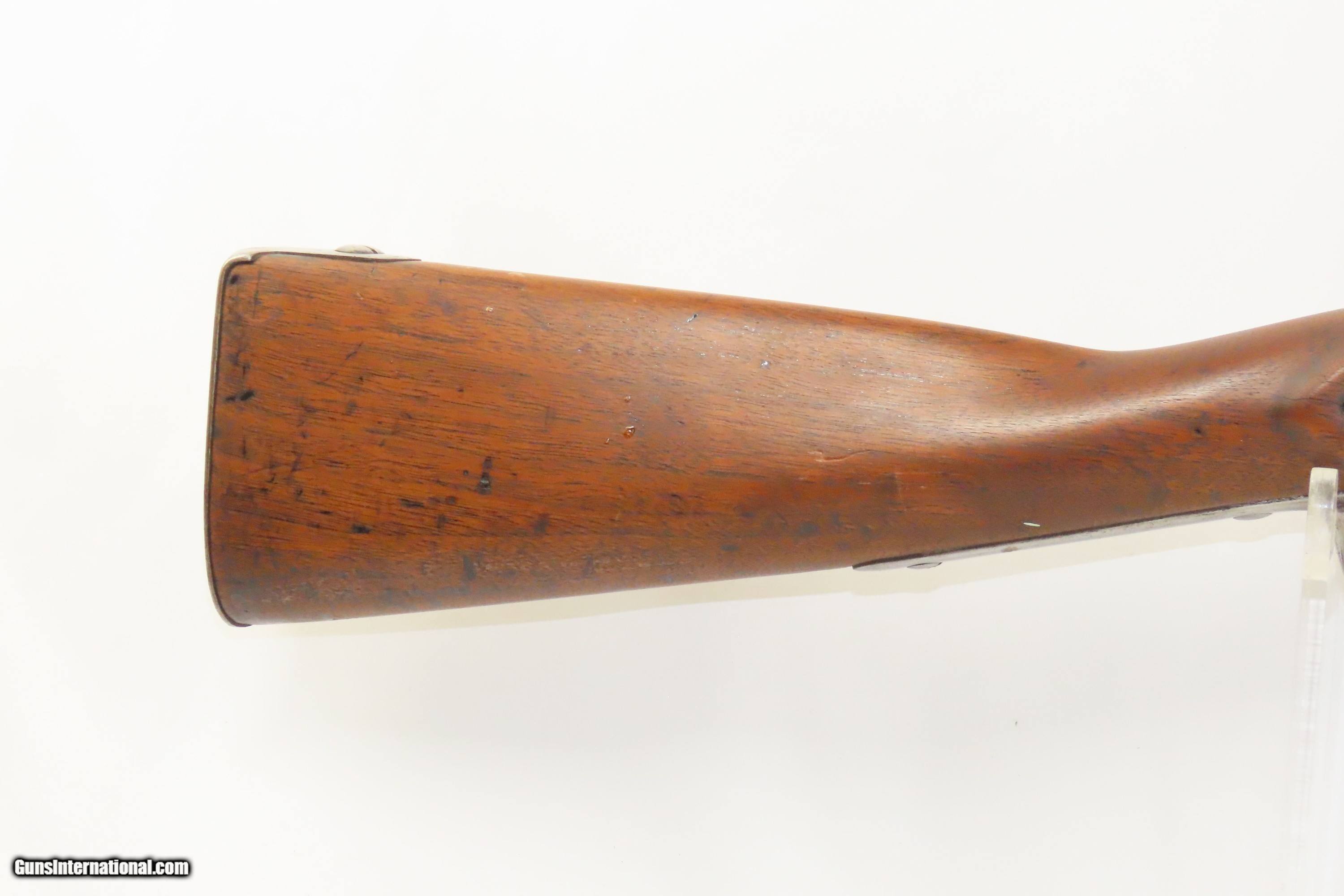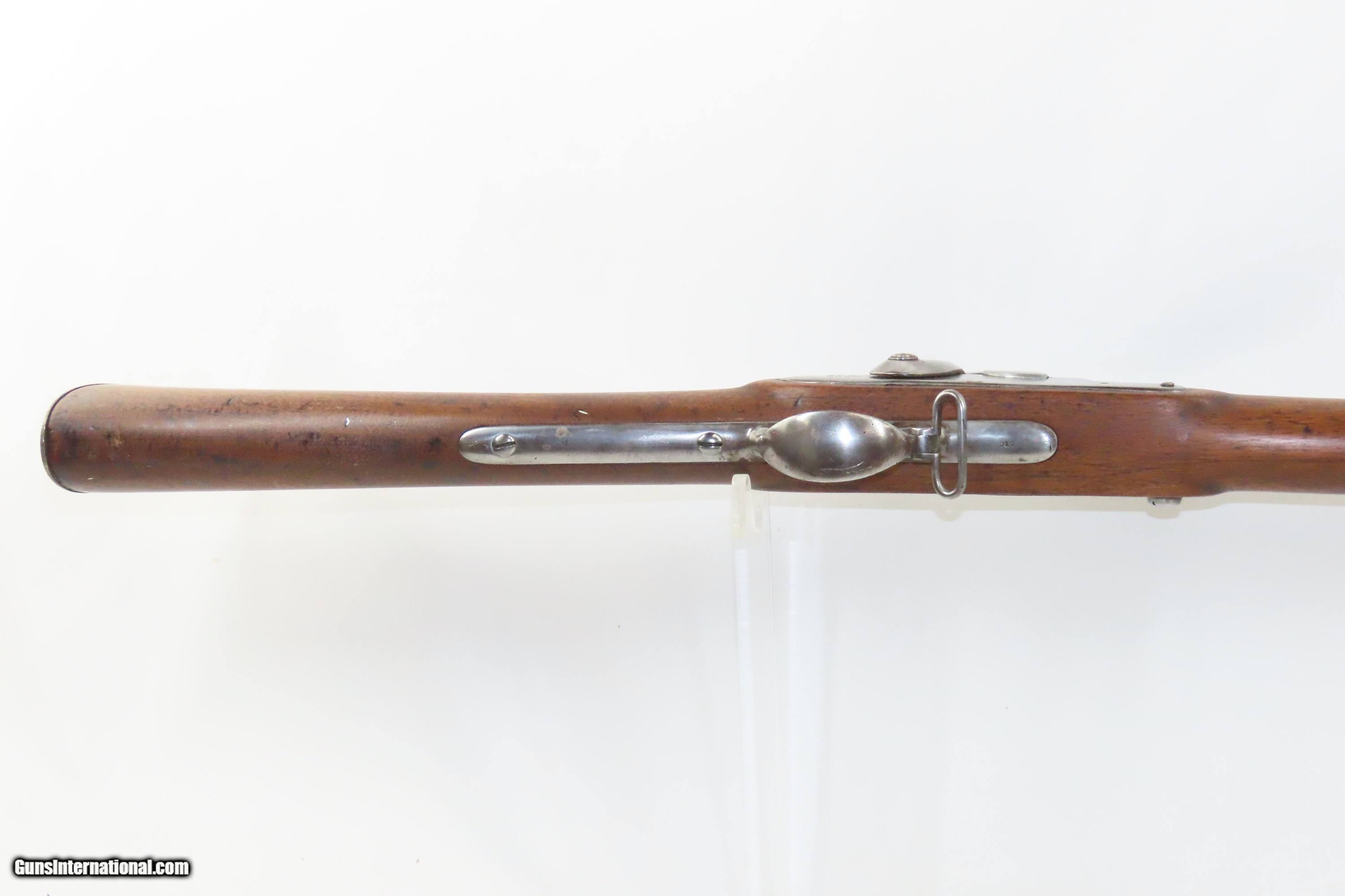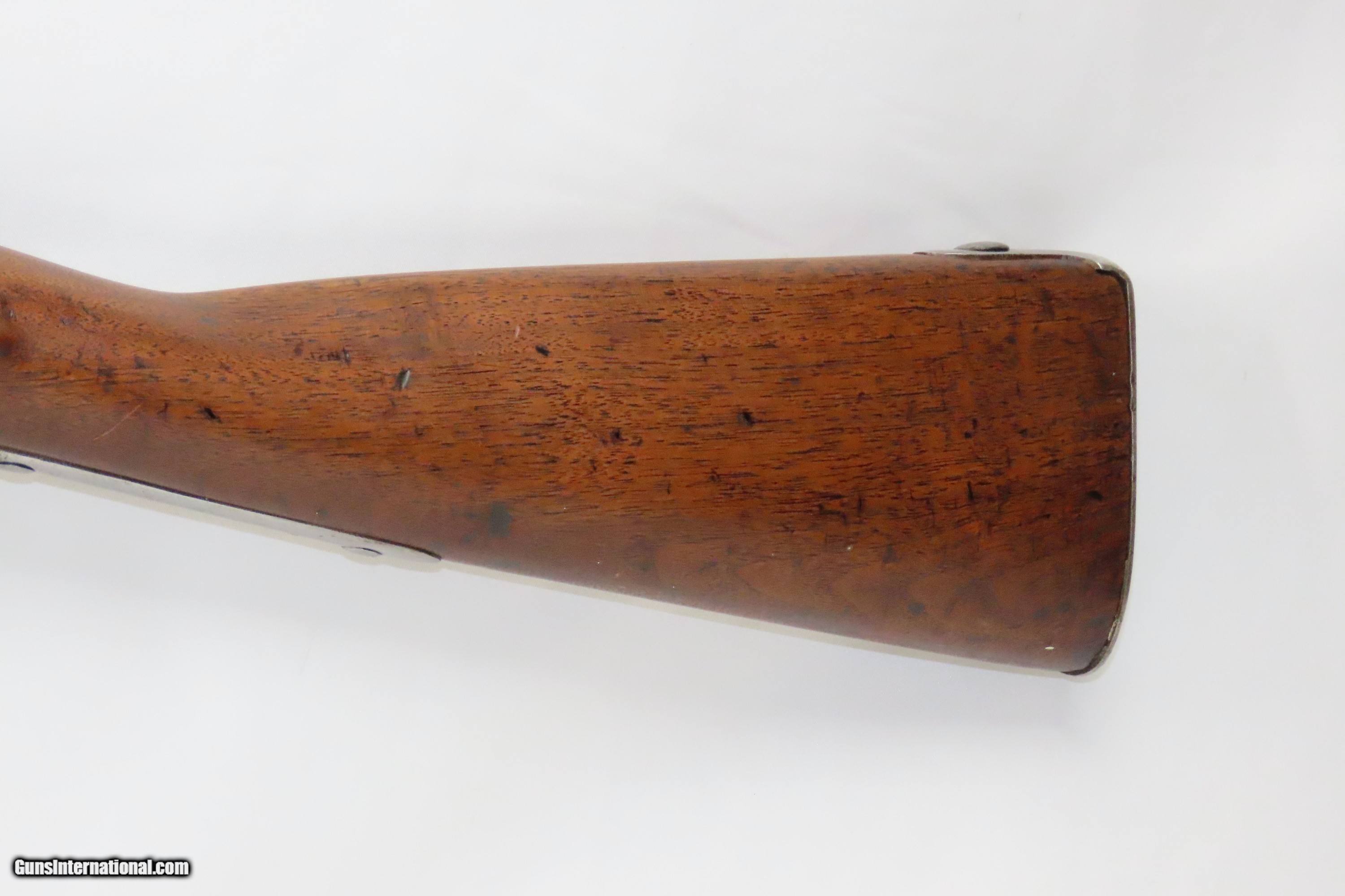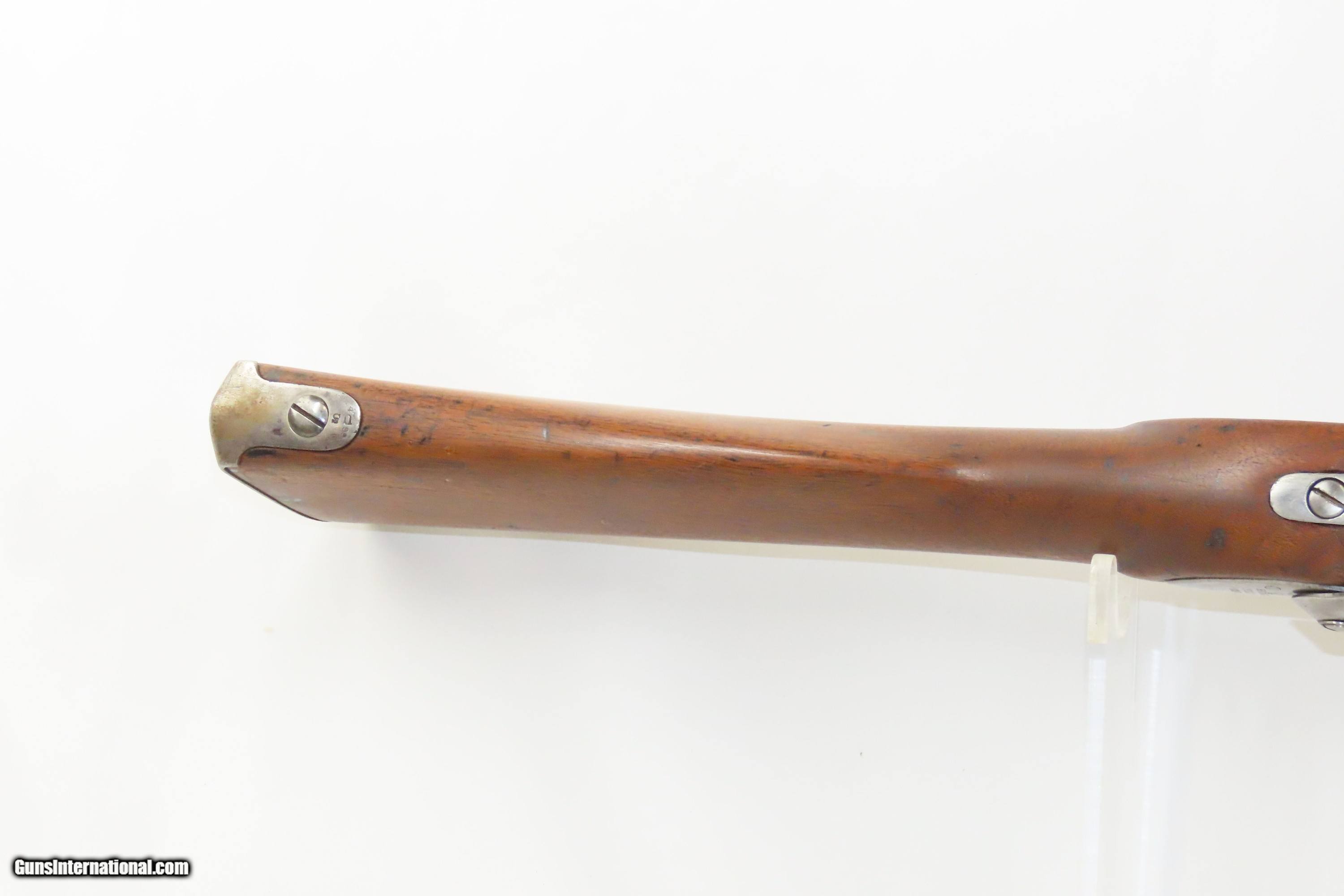 Description: 1827 Dated Antique U.S. SPRINGFIELD M1816 “Bolster” Conversion Perc. MUSKET Flintlock to Percussion Conversion PRE-CIVIL WAR Here we present an antique Springfield U.S. Model 1816 Percussion Conversion Musket, manufactured in Springfield, Massachusetts in 1827. This example would have started out life as a flintlock and later converted to percussion likely in the years prior to the American Civil War. The M1816 was in production at Springfield (325,000) and Harpers Ferry (350,000) between 1816 to 1844 with around 675,000 muskets produced during this run. Additionally, more than a dozen contractors also made Model 1816 Muskets during its production years, adding more than 146,000 muskets for a grand total of 821,421 Model 1816 Muskets produced. It saw service during the Mexican-American War and was even pressed into service during the Civil War in both the updated percussion and the old flintlock format. The advent of the Model 1842 Musket made the M1816 obsolete, but not unserviceable. Eventually, most made their way to storehouses and armories. Beginning in 1848, when more than 700,000 of all types of flintlock muskets were reported in storage, the most serviceable were converted to percussion ignition. Three types of alteration were performed. All alterations involved grinding the flash pan down and replacing the hammer. The "French Style" conversion added a drum and nipple to the flashhole. The "Belgian Style", or “Cone Conversion”, involved plugging the vent hole with a weld and tapping a nipple directly into the barrel. This is the type of conversion that was only done at Harper's Ferry and Springfield and is sometimes referred to as an "armory conversion." The last type of conversion was used late in the renovation process, beginning about 1852, and involved adding a bolster to the breech of the barrel, so it is termed the "Bolster Style" of conversion. The overall condition is good. Polished bright. The action is excellent. The bore is smooth and patinated. The walnut stock has been repaired around the barrel tang on both side, has a stable split on the left side forward of the left stock flat, and along the bottom right ahead of the lock. Own the original! This is a legitimate antique and not a reproduction. Barrel is 41-1/8 inches. Caliber: .69 Percussion Overall condition as seen in photos. Very Fast. Very Safe. FREE SHIPPING WORLDWIDE. Delivered directly to your door by express mail! Guaranteed AUTHENTIC & Includes CERTIFICATE OF AUTHENTICITY. ancestryguns $1600 #233054 SOLD Antique: Yes |