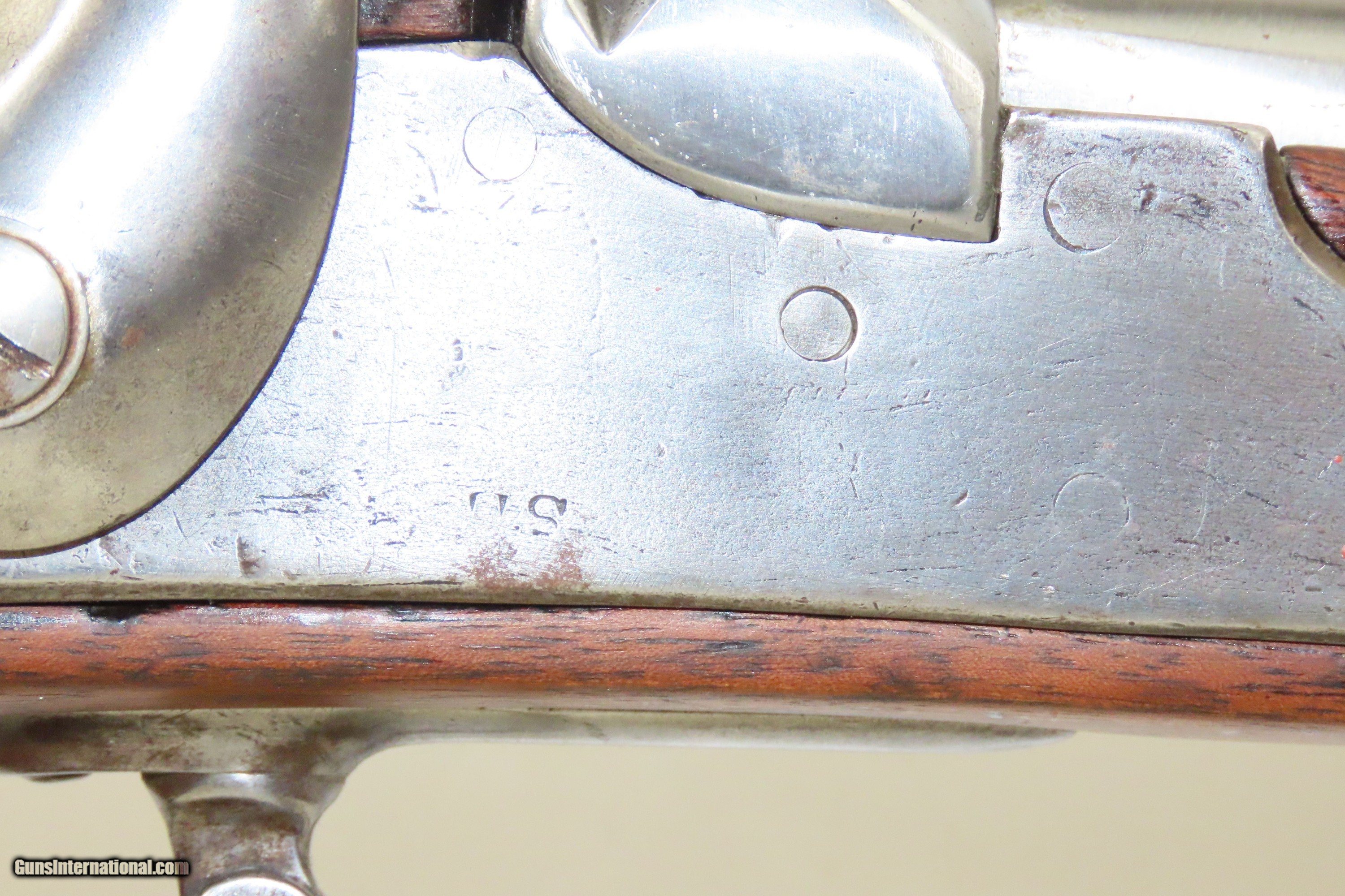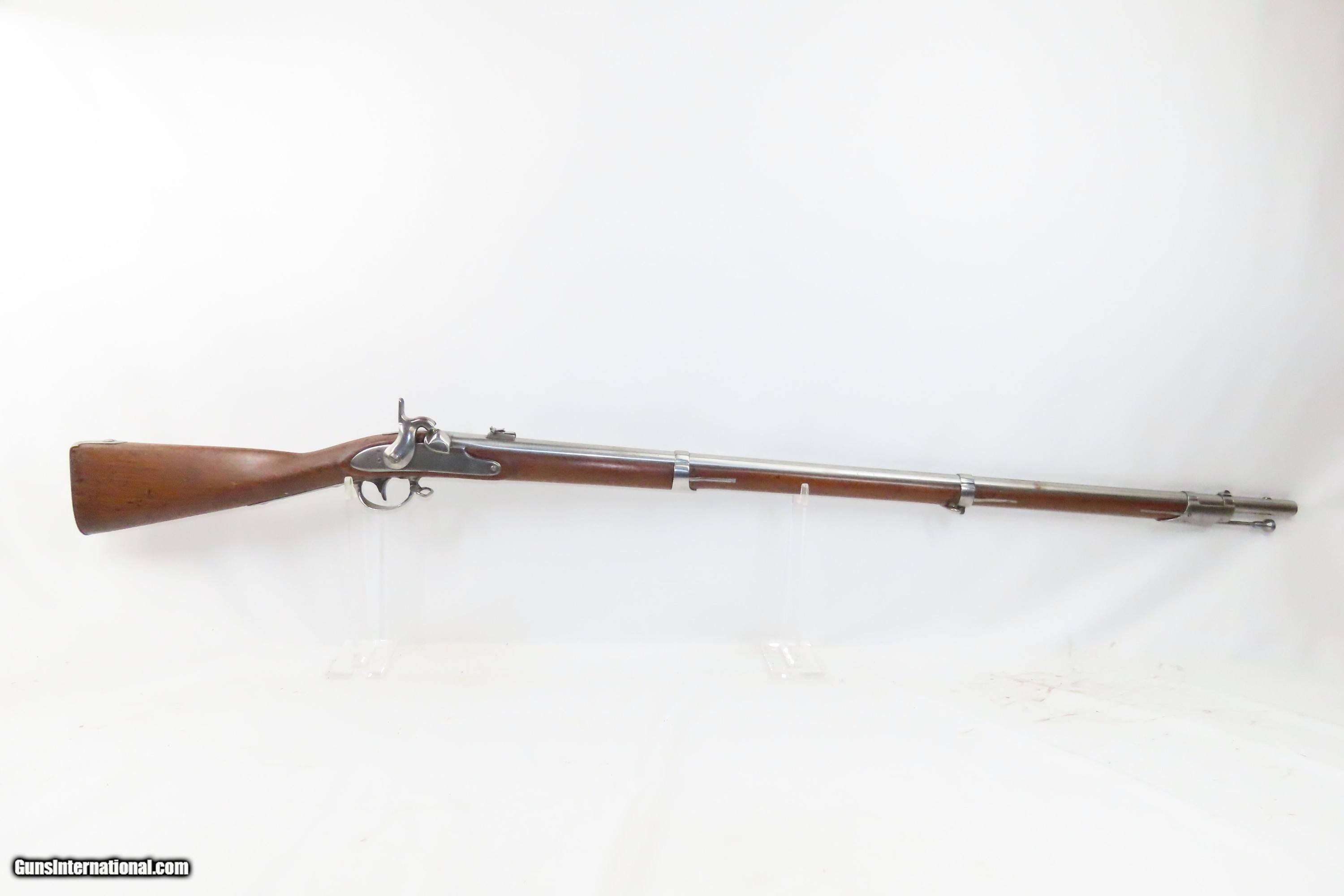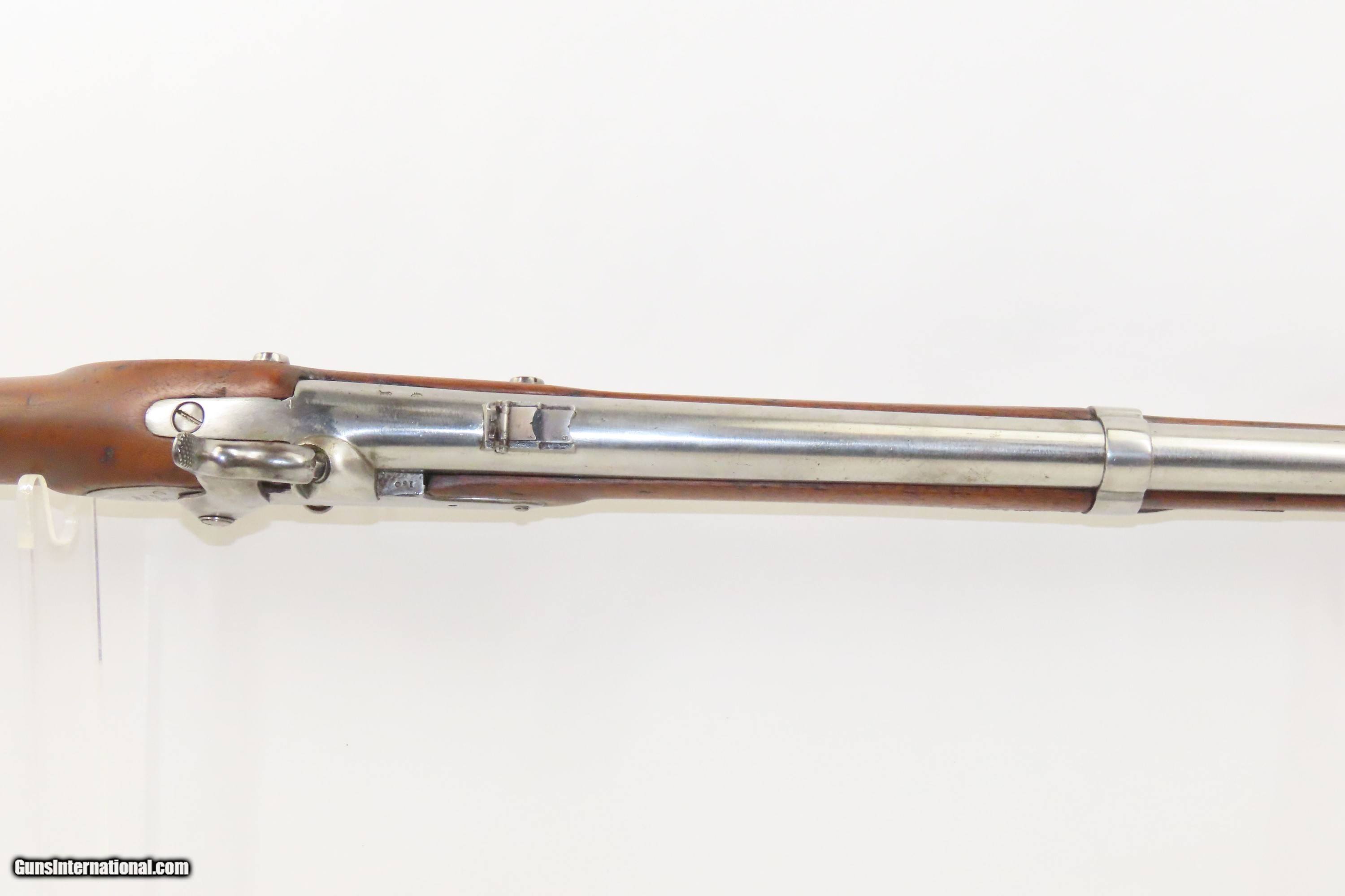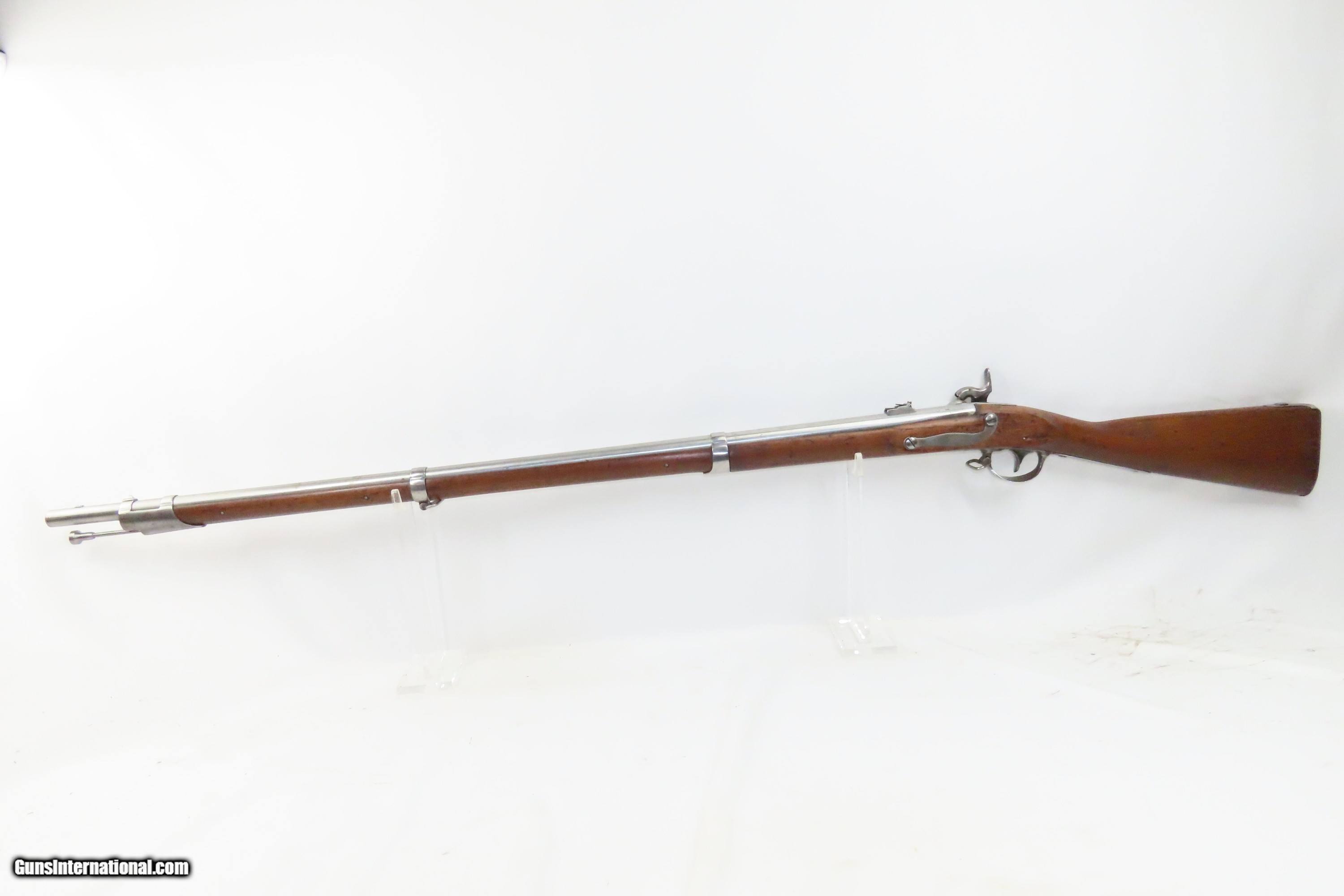Description: 1827 Dated Antique U.S. SPRINGFIELD M1816 “Bolster” Conversion Perc. MUSKET Flintlock to Percussion Conversion PRE-CIVIL WAR Here we present an antique Springfield U.S. Model 1816 Percussion Conversion Musket, manufactured in Springfield, Massachusetts in 1827. This example would have started out life as a flintlock and later converted to percussion likely in the years prior to the American Civil War. The M1816 was in production at Springfield (325,000) and Harpers Ferry (350,000) between 1816 to 1844 with around 675,000 muskets produced during this run. Additionally, more than a dozen contractors also made Model 1816 Muskets during its production years, adding more than 146,000 muskets for a grand total of 821,421 Model 1816 Muskets produced. It saw service during the Mexican-American War and was even pressed into service during the Civil War in both the updated percussion and the old flintlock format. The advent of the Model 1842 Musket made the M1816 obsolete, but not unserviceable. Eventually, most made their way to storehouses and armories. Beginning in 1848, when more than 700,000 of all types of flintlock muskets were reported in storage, the most serviceable were converted to percussion ignition. Three types of alteration were performed. All alterations involved grinding the flash pan down and replacing the hammer. The "French Style" conversion added a drum and nipple to the flashhole. The "Belgian Style", or “Cone Conversion”, involved plugging the vent hole with a weld and tapping a nipple directly into the barrel. This is the type of conversion that was only done at Harper's Ferry and Springfield and is sometimes referred to as an "armory conversion." The last type of conversion was used late in the renovation process, beginning about 1852, and involved adding a bolster to the breech of the barrel, so it is termed the "Bolster Style" of conversion. The overall condition is good. Polished bright. The action is excellent. The bore is smooth and patinated. The walnut stock has been repaired around the barrel tang on both side, has a stable split on the left side forward of the left stock flat, and along the bottom right ahead of the lock. Own the original! This is a legitimate antique and not a reproduction. Barrel is 41-1/8 inches. Caliber: .69 Percussion Overall condition as seen in photos. Very Fast. Very Safe. FREE SHIPPING WORLDWIDE. Delivered directly to your door by express mail! Guaranteed AUTHENTIC & Includes CERTIFICATE OF AUTHENTICITY. ancestryguns $1600 #233054 SOLD Antique: Yes |