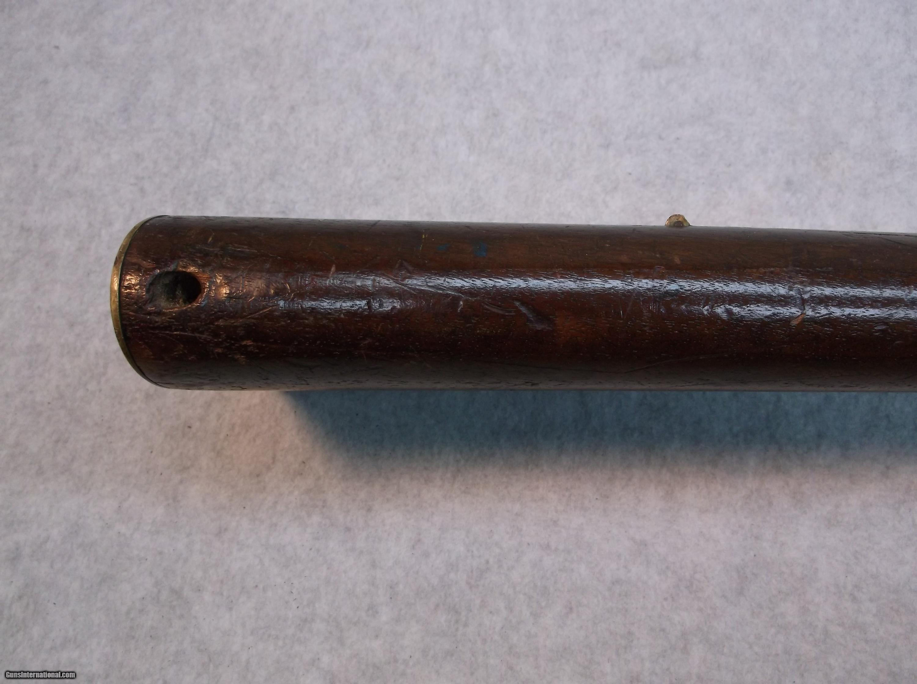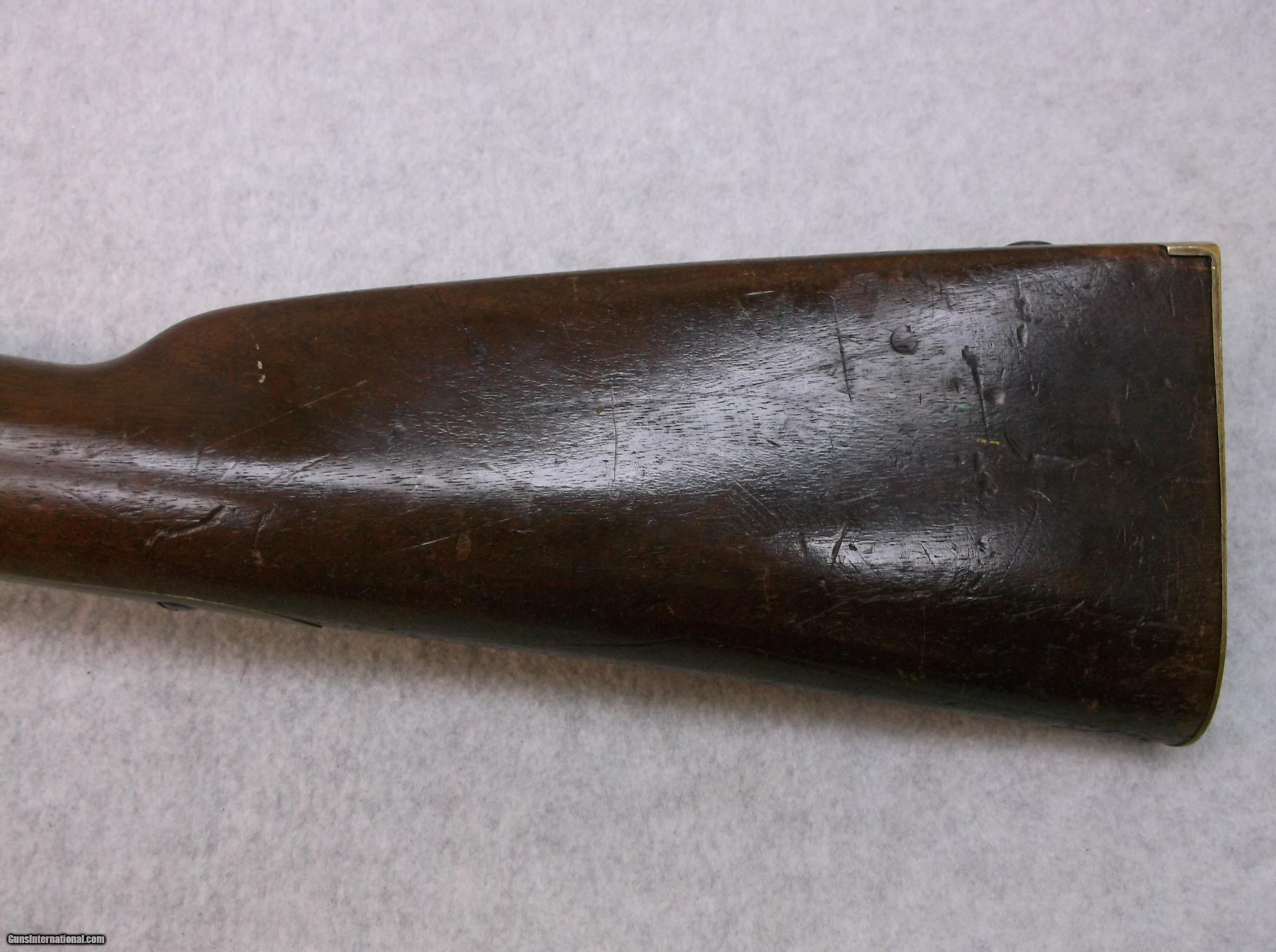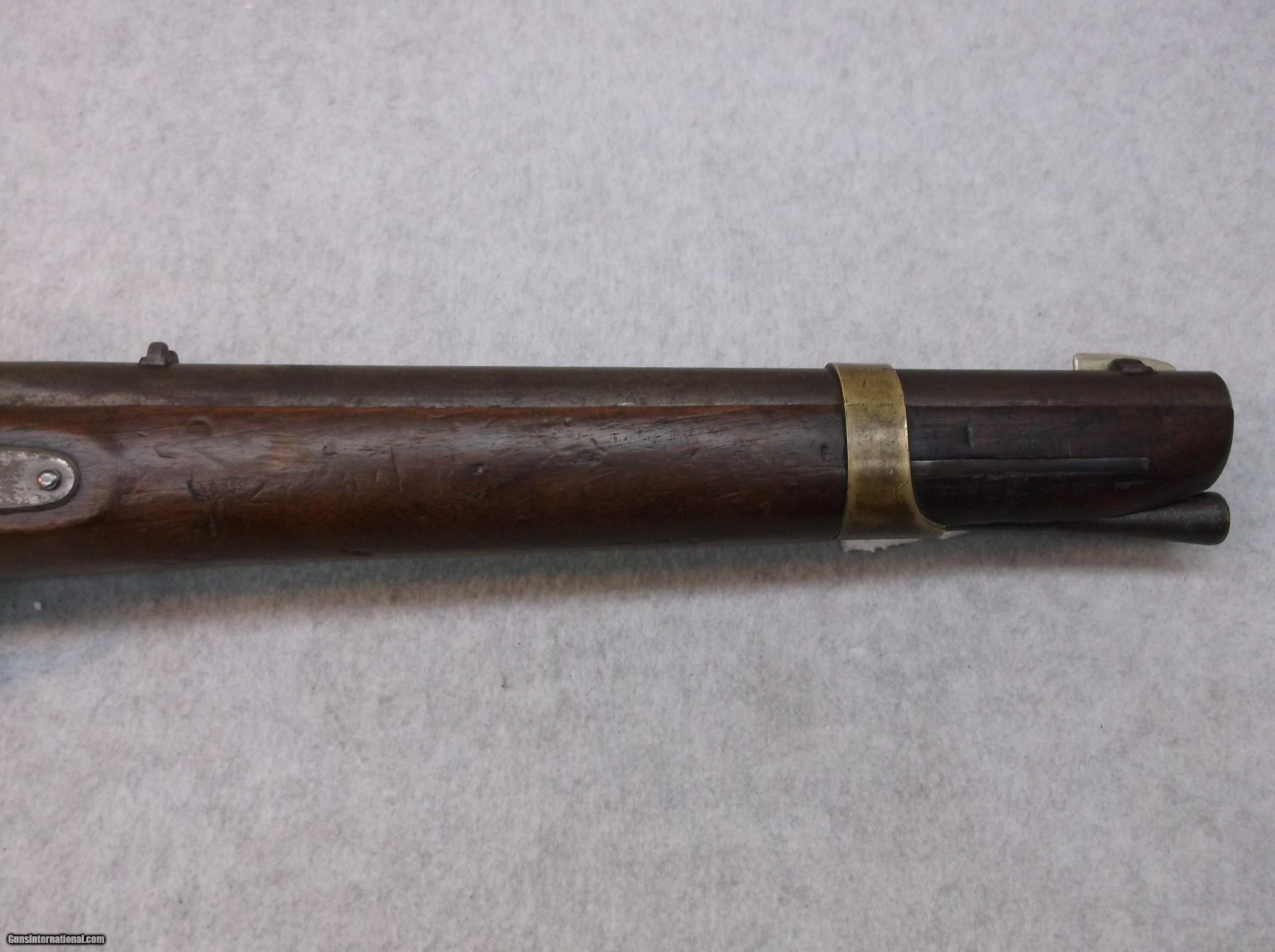 Description: Rare Eli Whitney M1841 54 caliber percussion rifle manufactured in 1850. This has had the barrel cut down at some point in it's 165 year life, it is currently 13 1/2" long. As one would expect with a firearm of this age, there is some rust and minor pitting on the barrel, lock, and hammer. The stock looks to be original and not refinished, cartouche marks are still present. It has dents, dings, scratches and gouges consistent with a 160+ year lifespan. Patchbox on side of buttstock has a spring loaded lid and contains an extra nipple. Lock and trigger are still fully functional. "Steel" proofmark on barrel flat, "U.S." inspection stamp also with inspector's initials and a "P". "E. Whitney" "US" and "New Haven 1850" on the lock. Our stock number P-81-90-A008, please use this number when referencing this firearm. This rifle is also for sale in our brick and mortar store so availability may change without notice. Will ship anywhere in the USA, buyer pays freight and insurance. This is plenty old enough to not require FFL transfer. SOLD Antique: Yes Manufacturer: Eli Whitney Model: M1841 Caliber Info: 54 Condition: Fair Manufacture Date: 1850 |