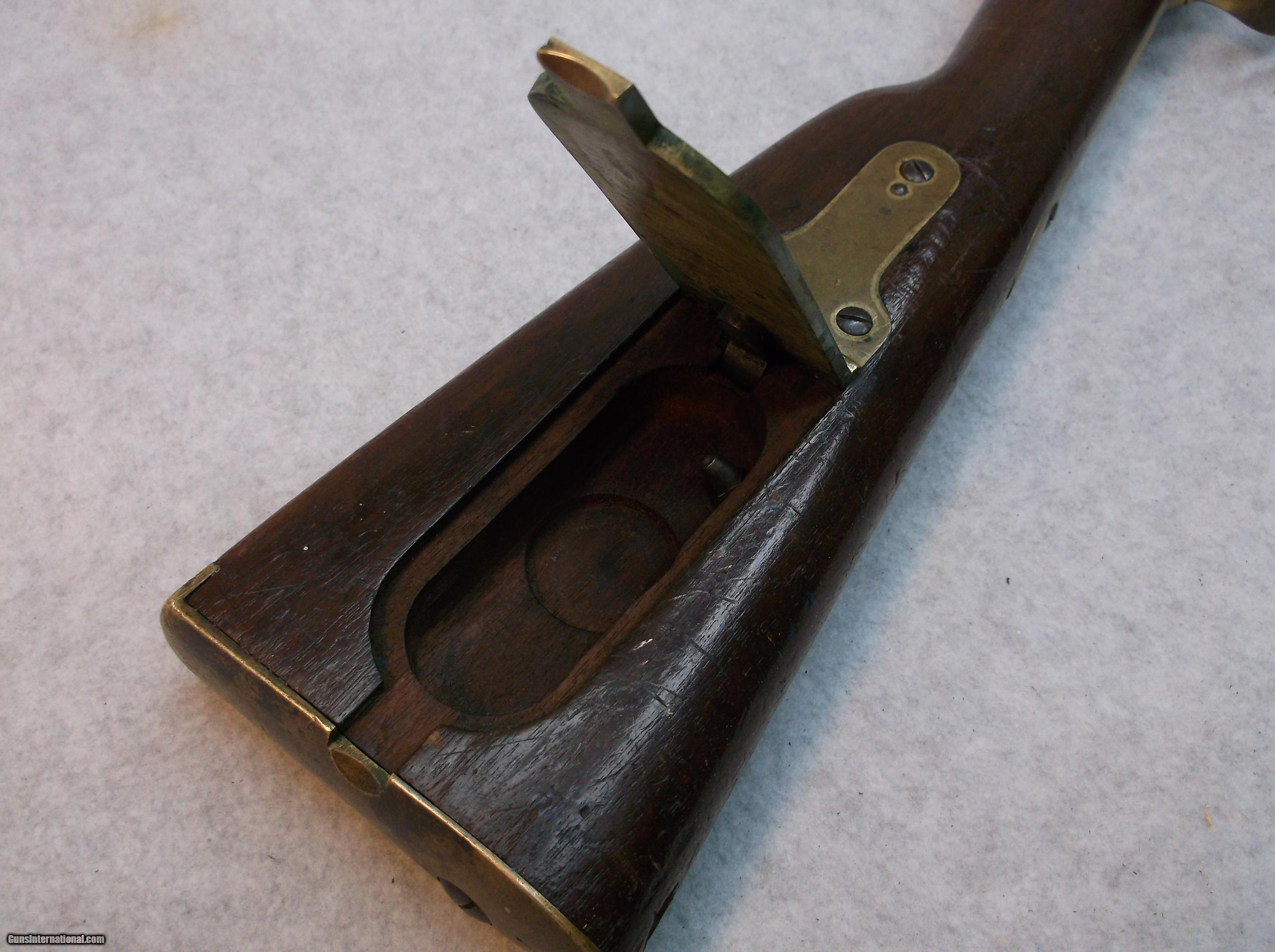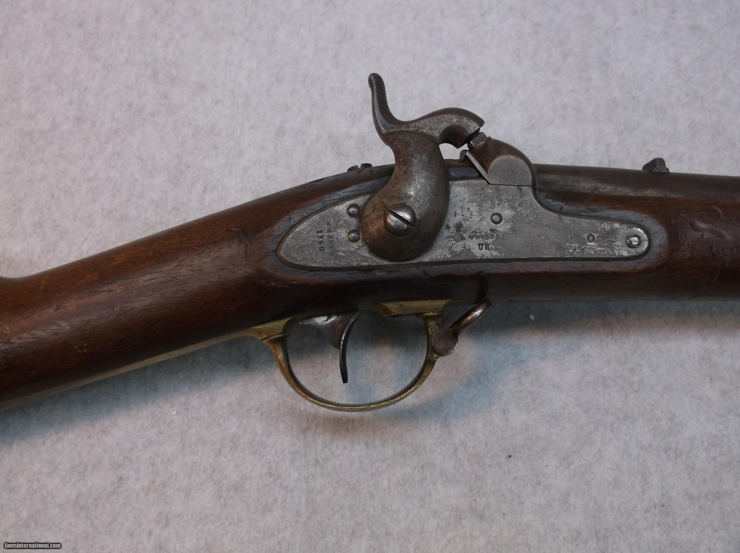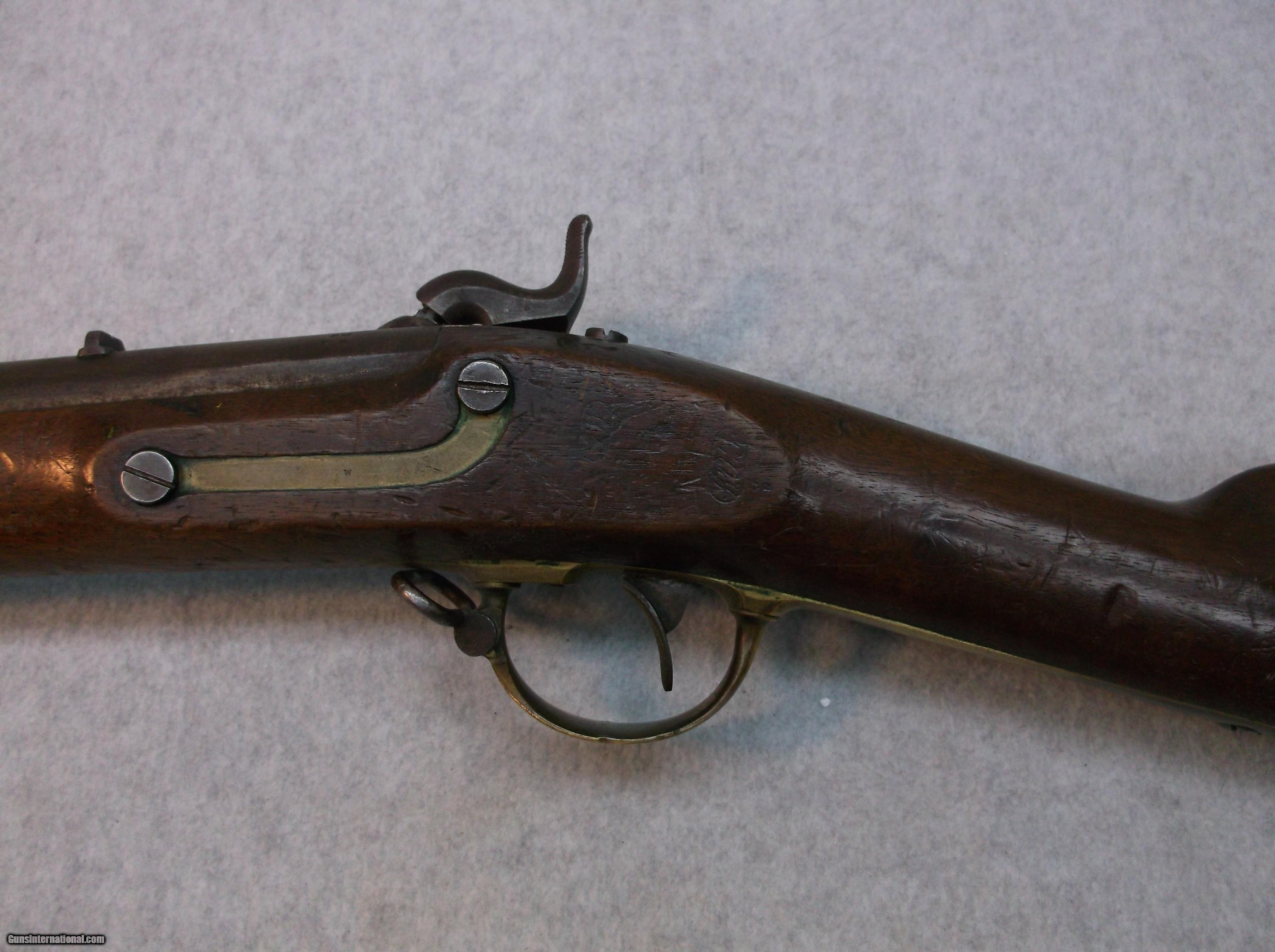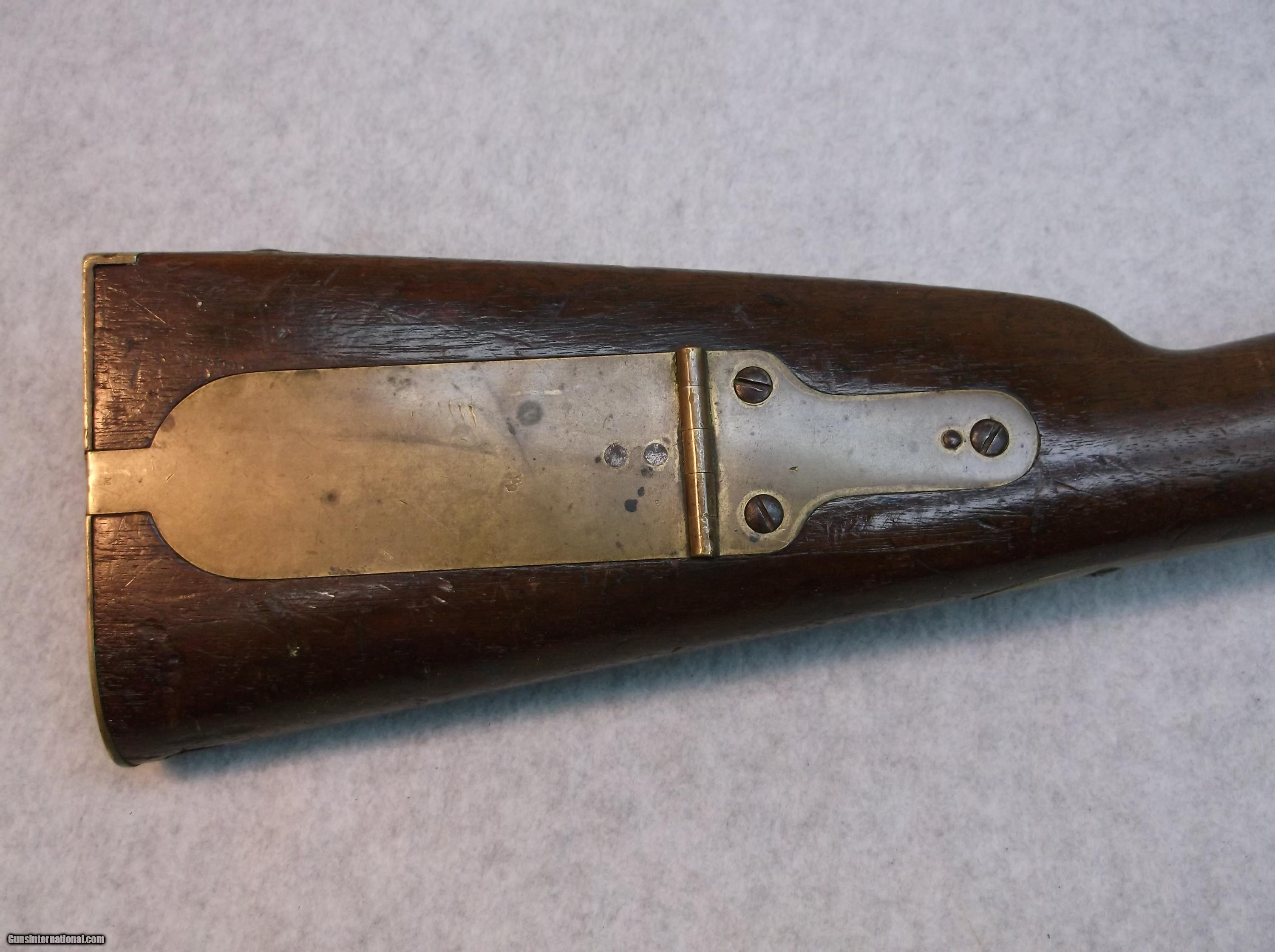 Description: Rare Eli Whitney M1841 54 caliber percussion rifle manufactured in 1850. This has had the barrel cut down at some point in it's 165 year life, it is currently 13 1/2" long. As one would expect with a firearm of this age, there is some rust and minor pitting on the barrel, lock, and hammer. The stock looks to be original and not refinished, cartouche marks are still present. It has dents, dings, scratches and gouges consistent with a 160+ year lifespan. Patchbox on side of buttstock has a spring loaded lid and contains an extra nipple. Lock and trigger are still fully functional. "Steel" proofmark on barrel flat, "U.S." inspection stamp also with inspector's initials and a "P". "E. Whitney" "US" and "New Haven 1850" on the lock. Our stock number P-81-90-A008, please use this number when referencing this firearm. This rifle is also for sale in our brick and mortar store so availability may change without notice. Will ship anywhere in the USA, buyer pays freight and insurance. This is plenty old enough to not require FFL transfer. SOLD Antique: Yes Manufacturer: Eli Whitney Model: M1841 Caliber Info: 54 Condition: Fair Manufacture Date: 1850 |