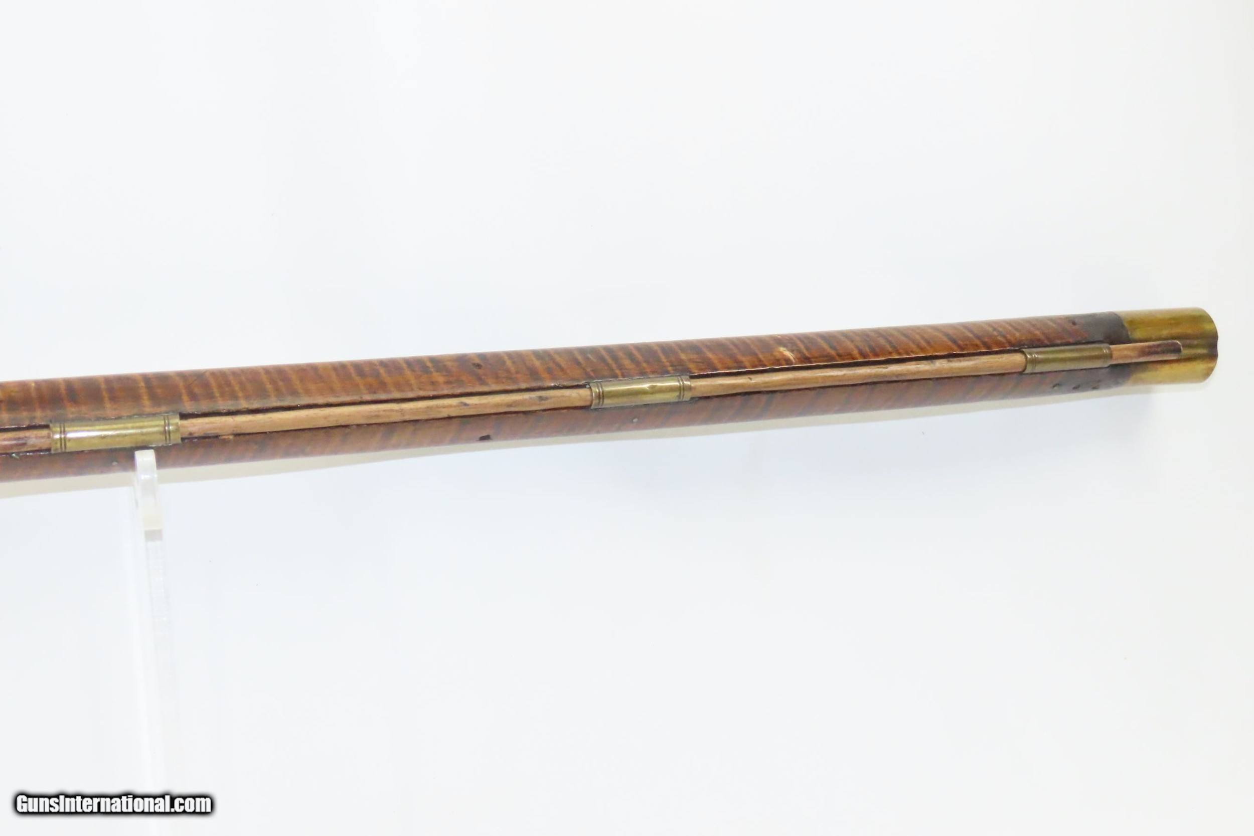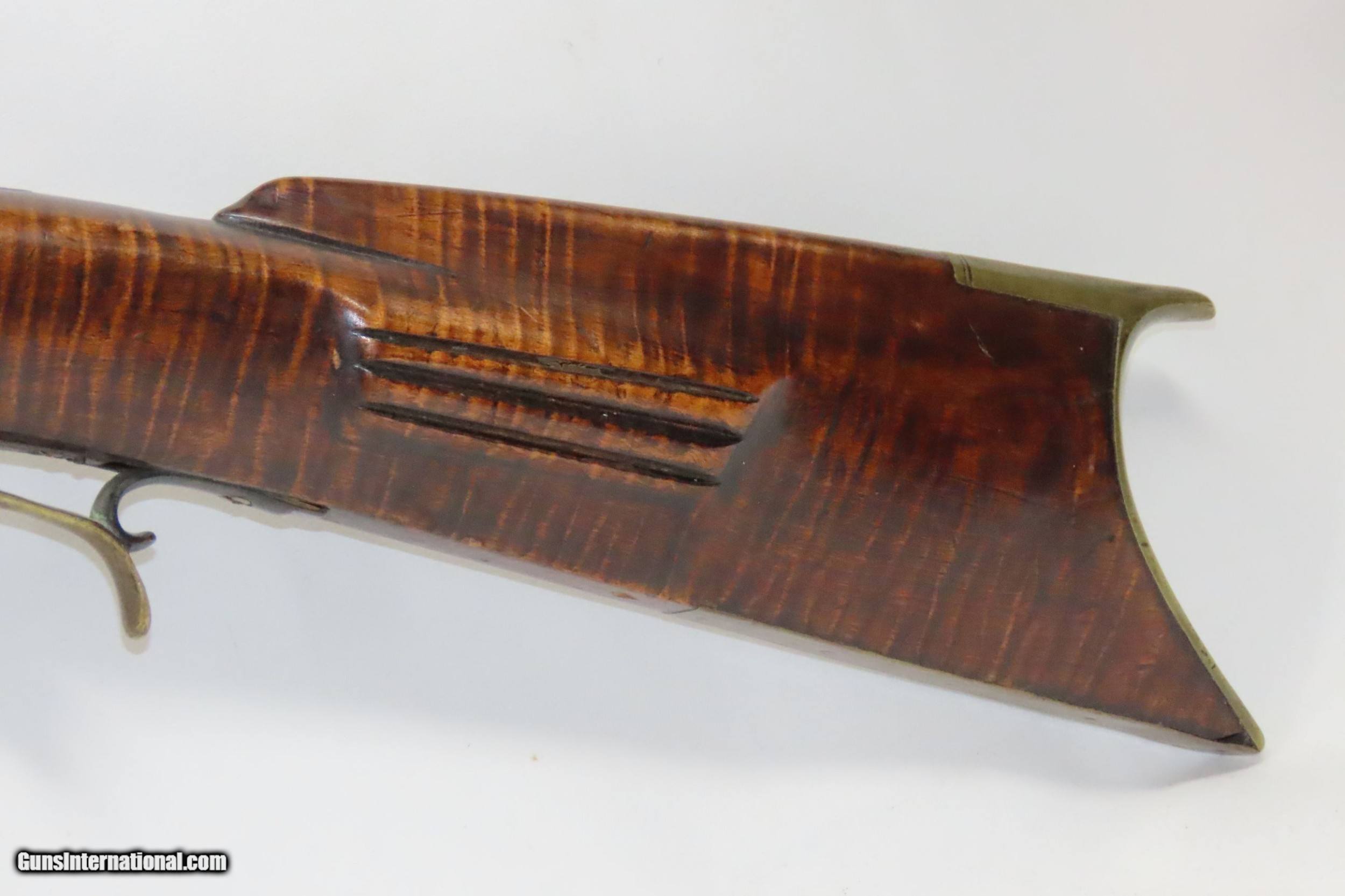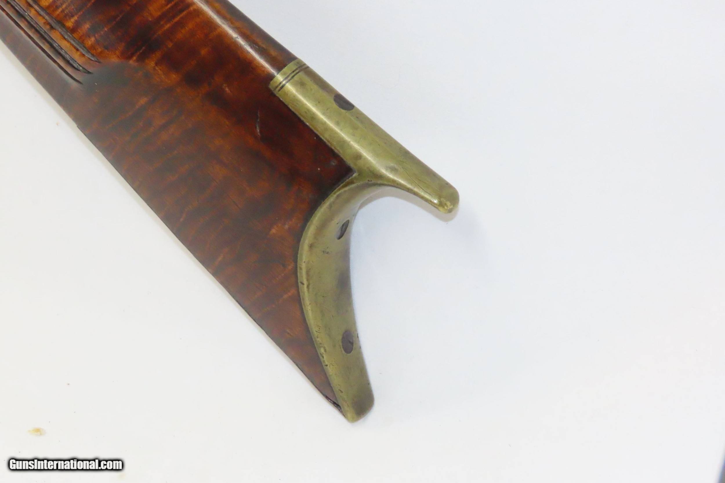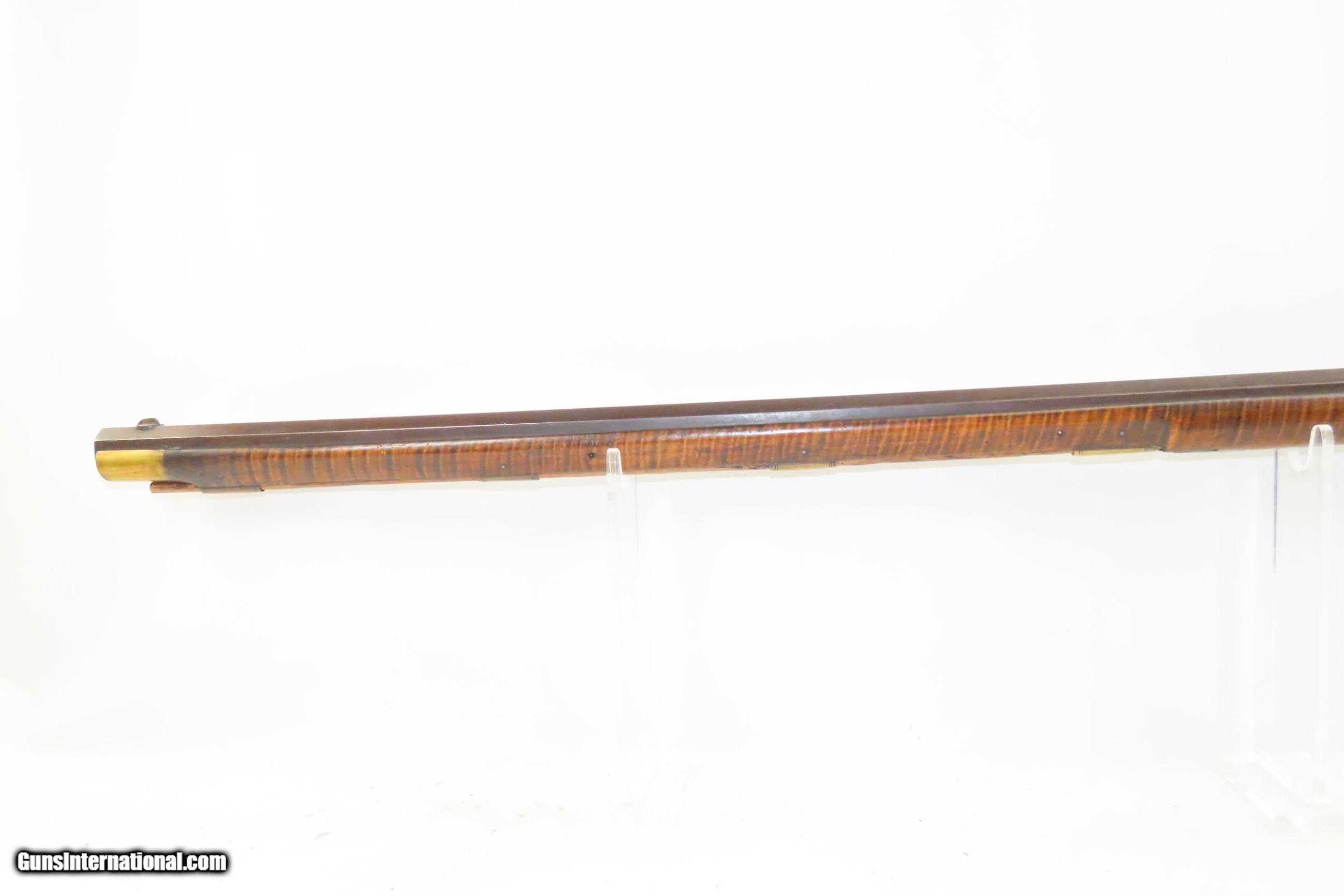 Description: Antique HEAVY BARREL Full Stock Percussion AMERICAN Long Rifle .45 Caliber Circa 1840/50s Long Rifle with a “J. GOLCHER” Lock Here we present an antique Full-Stock, Heavy Barreled Long Rifle with a J. Golcher lock, made circa the 1840/50s. This rifle would have been used to hunt medium to large sized game or dispatching the enemy from greater distances than most other muskets could fire accurately at that time. This rifle features a heavy 39” octagonal barrel in .45 caliber, large enough to take big game. There is a blade front sight and a plain open sight mounted near the breach. This rifle also comes equipped with double set triggers for a light and crisp trigger break. Attractive maple was used in the making of this stock. The curvature (drop) of the stock at the wrist as well as the girth makes this one unique. The overall condition is good. Strong action (double set triggers). The bore is in good shape for its age. The maple striped stock is solid with a nice smooth finish. “J. GOLCHER” engraved lock. Three grooves are carved out of the cheekpiece. Own the original! This is a legitimate antique and not a reproduction. Barrel is 39 inches. Caliber: .45 Percussion Overall condition as seen in photos. Very Fast. Very Safe. FREE SHIPPING WORLDWIDE. Delivered directly to your door by express mail! Guaranteed AUTHENTIC & Includes CERTIFICATE OF AUTHENTICITY. ancestryguns $2485 #220086 SOLD Antique: Yes |