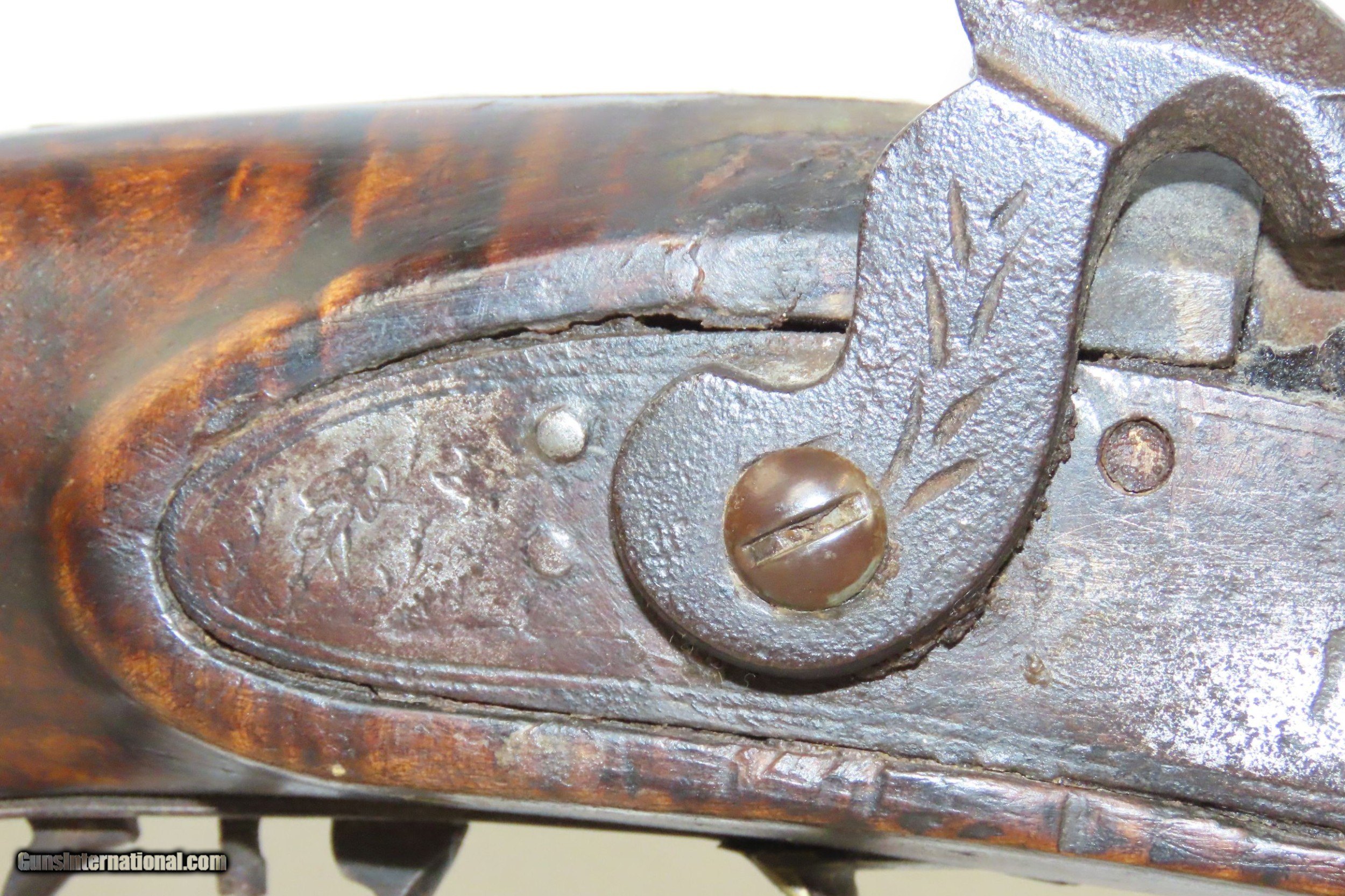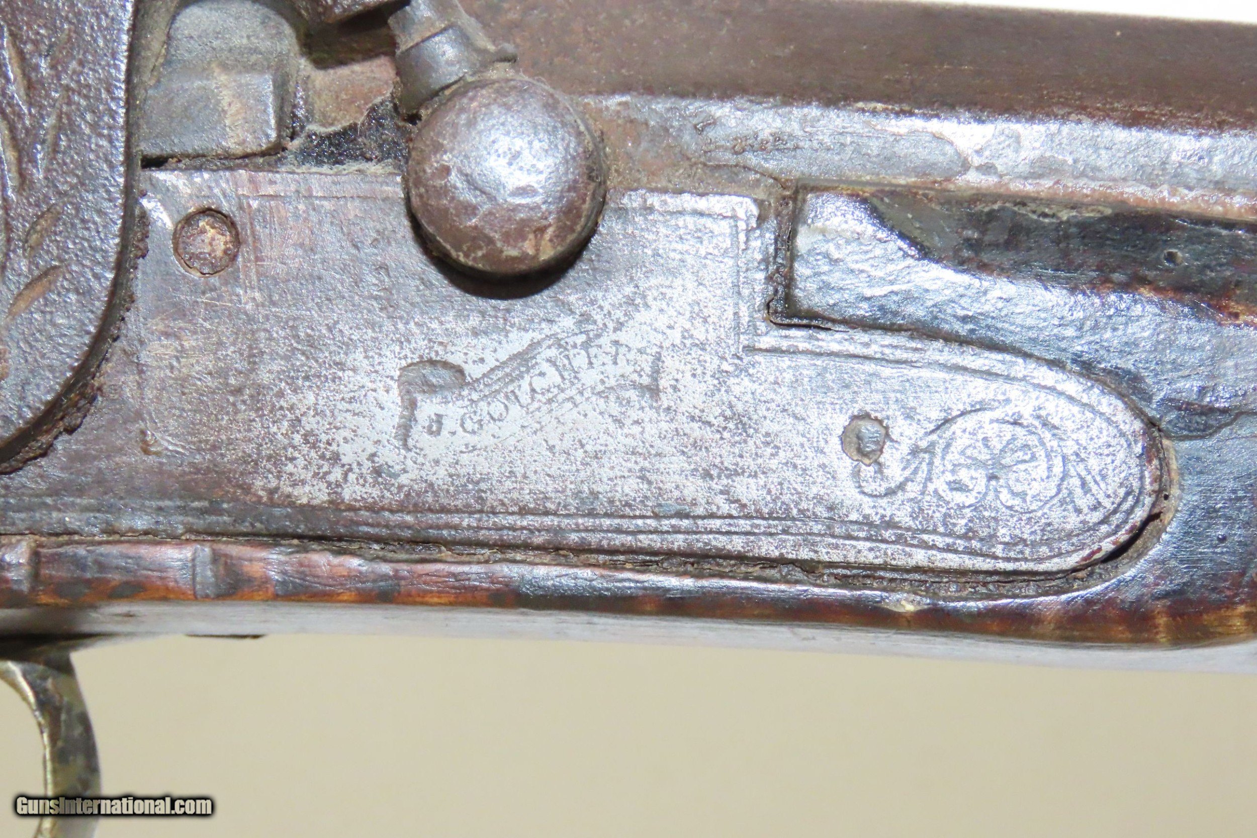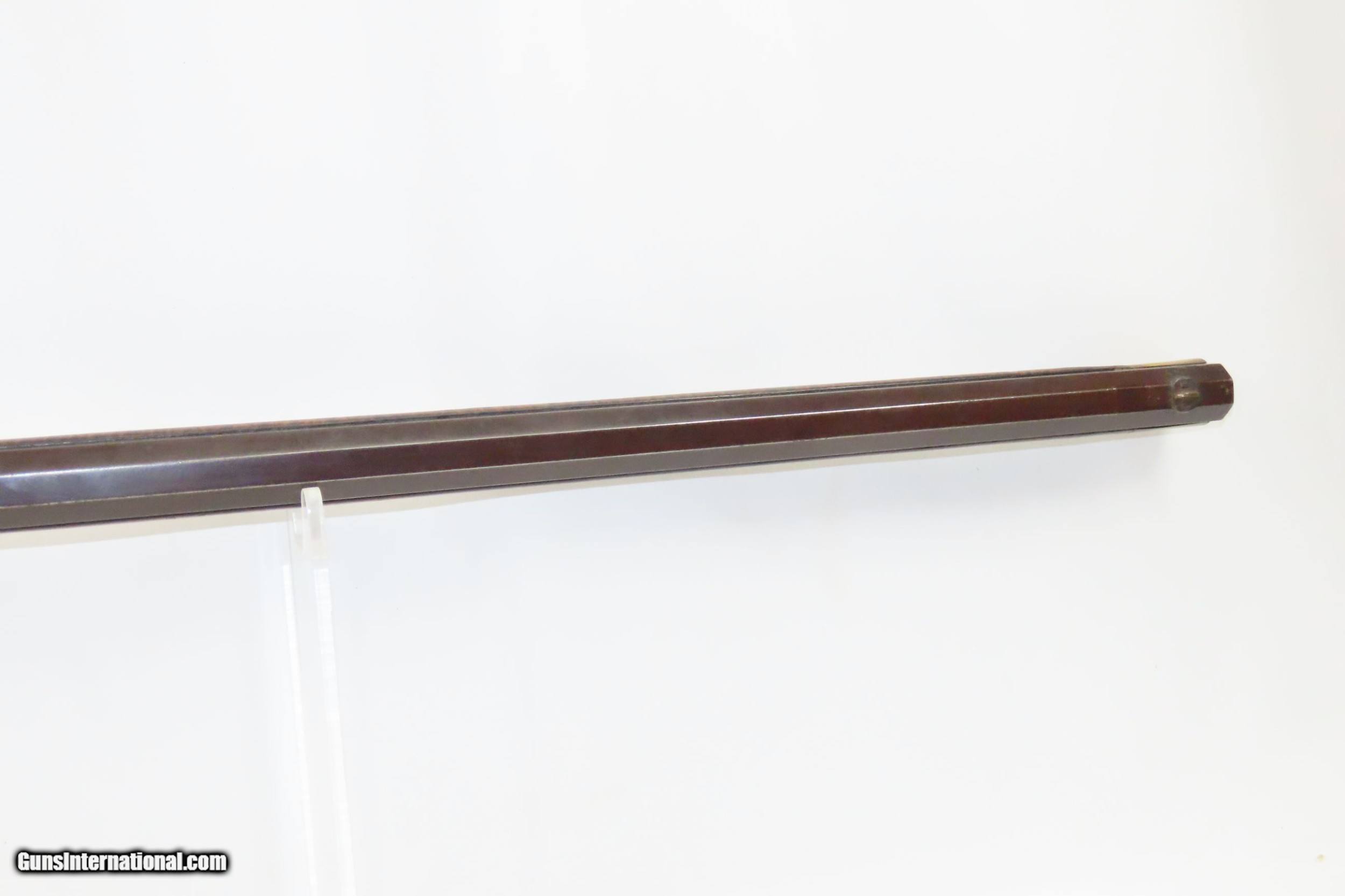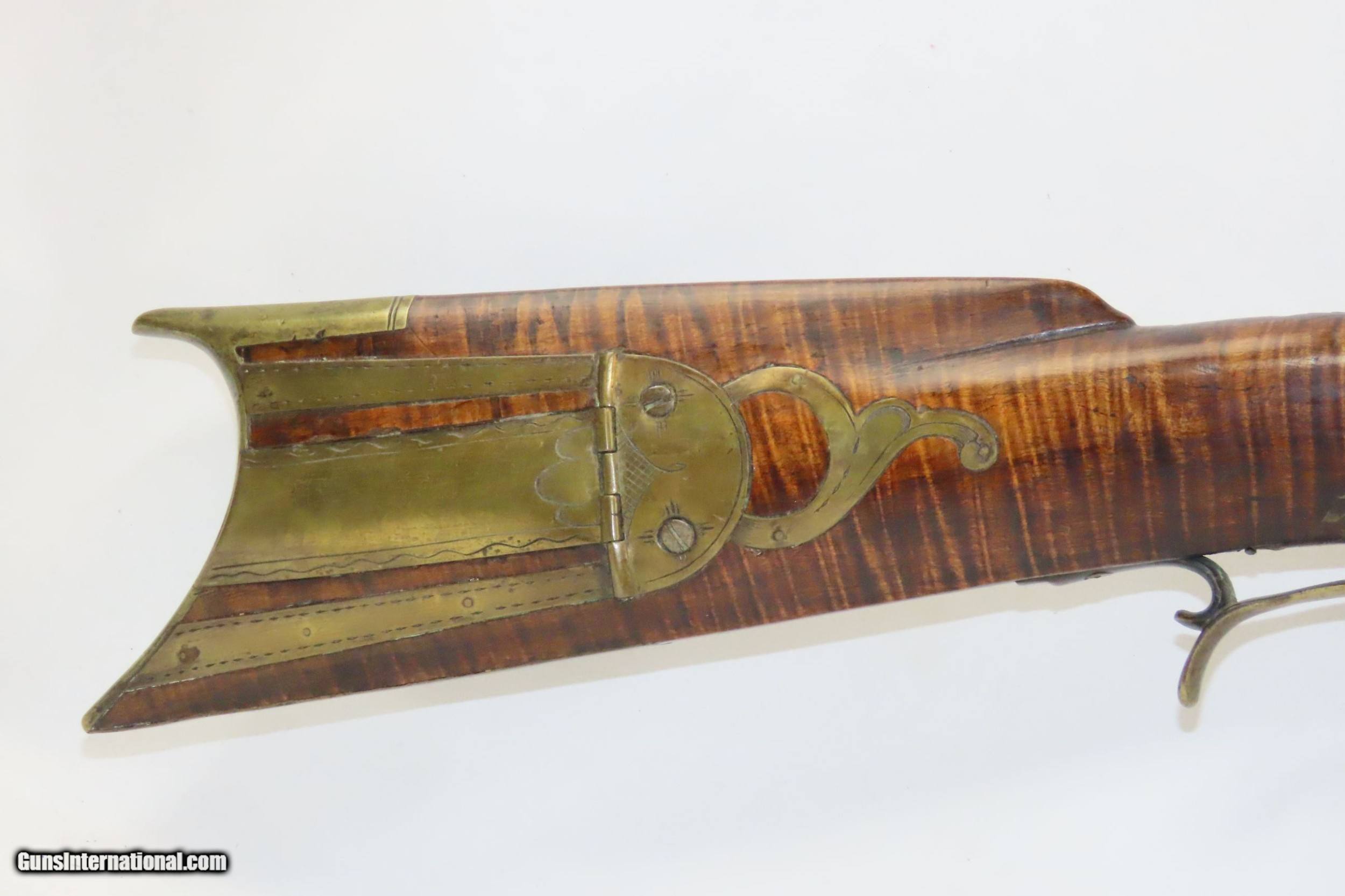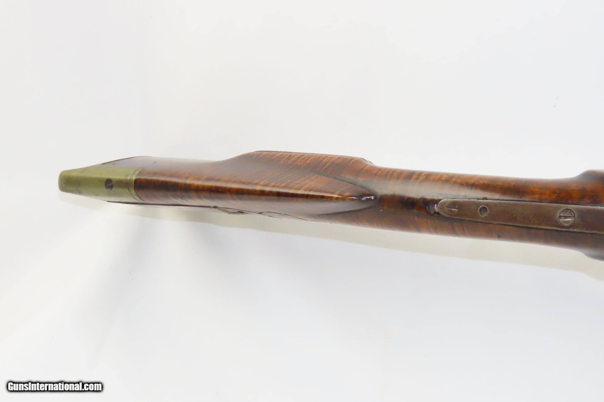 Description: Antique HEAVY BARREL Full Stock Percussion AMERICAN Long Rifle .45 Caliber Circa 1840/50s Long Rifle with a “J. GOLCHER” Lock Here we present an antique Full-Stock, Heavy Barreled Long Rifle with a J. Golcher lock, made circa the 1840/50s. This rifle would have been used to hunt medium to large sized game or dispatching the enemy from greater distances than most other muskets could fire accurately at that time. This rifle features a heavy 39” octagonal barrel in .45 caliber, large enough to take big game. There is a blade front sight and a plain open sight mounted near the breach. This rifle also comes equipped with double set triggers for a light and crisp trigger break. Attractive maple was used in the making of this stock. The curvature (drop) of the stock at the wrist as well as the girth makes this one unique. The overall condition is good. Strong action (double set triggers). The bore is in good shape for its age. The maple striped stock is solid with a nice smooth finish. “J. GOLCHER” engraved lock. Three grooves are carved out of the cheekpiece. Own the original! This is a legitimate antique and not a reproduction. Barrel is 39 inches. Caliber: .45 Percussion Overall condition as seen in photos. Very Fast. Very Safe. FREE SHIPPING WORLDWIDE. Delivered directly to your door by express mail! Guaranteed AUTHENTIC & Includes CERTIFICATE OF AUTHENTICITY. ancestryguns $2485 #220086 SOLD Antique: Yes |
