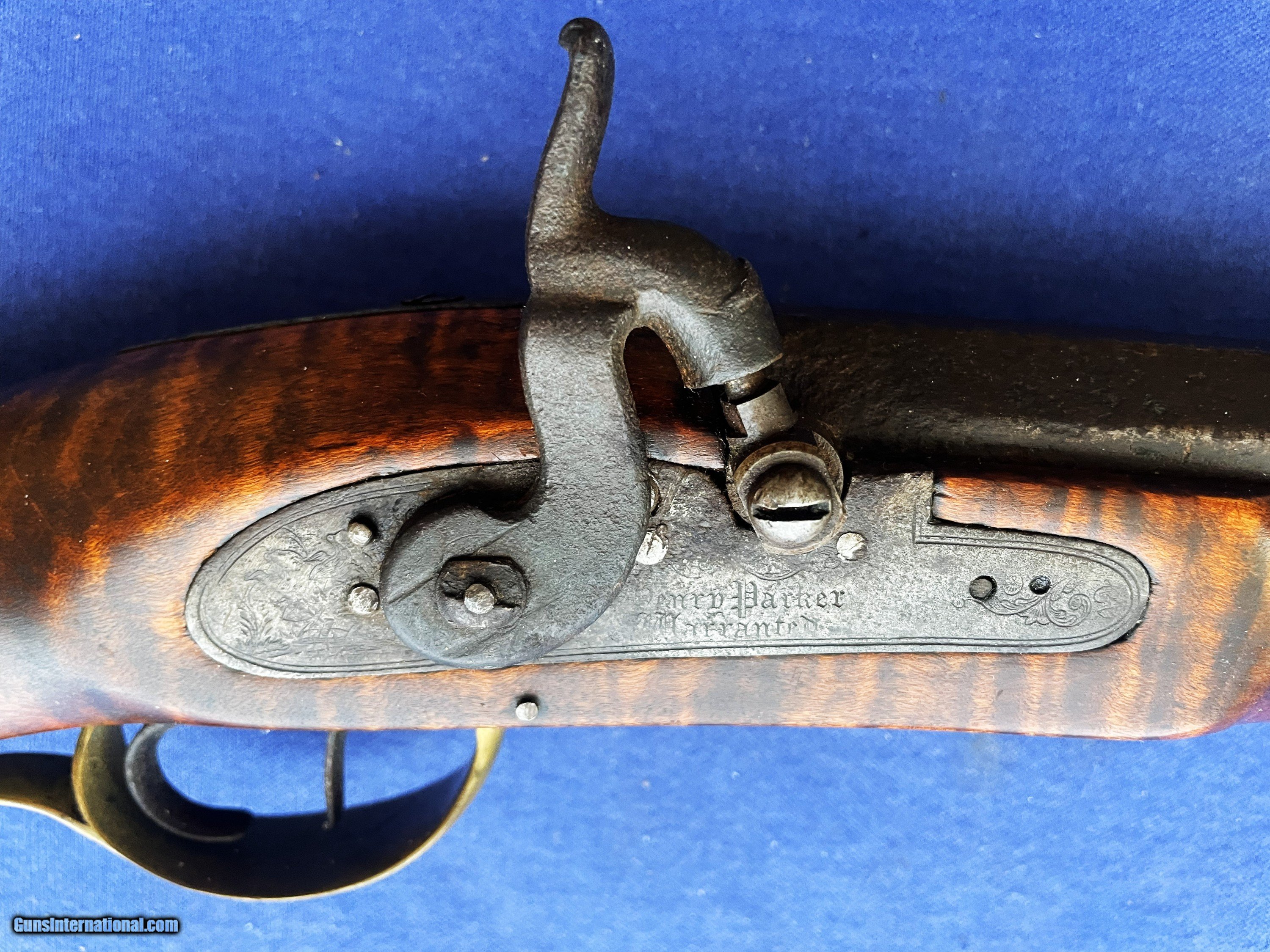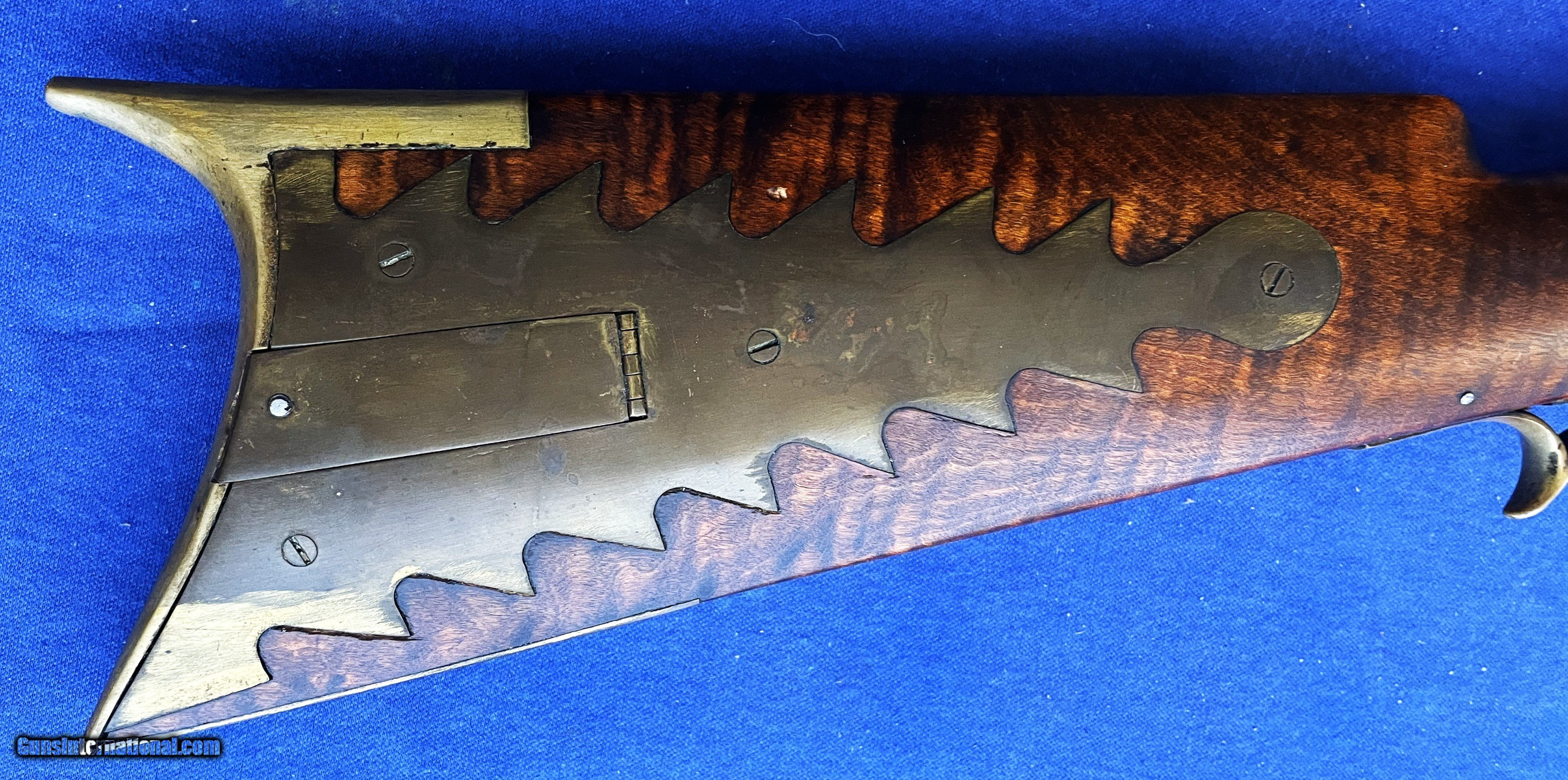 Description: FULL TIGER STRIPE MAPLE 1800 -1830s KENTUCKY RIFLE CONVERTED TO PERCUSSION, .44 CALIBER 55" OVERALL WITH 38" BARREL MARKED "J. MAGILL" LOCK MARKED "BERNARD PARKER" WARRANTED. OVERALL CONDITION IS VERY GOOD PLUS. METAL SHOWS AN EVEN ORIGINAL BROWN FINISH, SOME EROSION AROUND THE VENT FROM WHEN IT WAS IN FLINT. THE TIGER MAPLE STOCK IS IN GREAT SHAPE, NO CRACKS, CHIPS AND VIRTUALLY NO HANDLING MARKS or MARS. PROBABLY LIGHTLY CLEANED LONG AGO SHOWING NO EVIDENCE OF SANDING. THE BRASS FURNITURE HAS A NICE MELLOW PATINA. LOCK SEEM TO FUNCTION WELL WITH DOUBLE SET TRIGGERS. A VERY HANDSOME RIFLE, AS PICTURED AND RECENTLY FOUND IN AN ESTATE. QUESTIONS JUST ASK ! $65.00 S&H DIRECT TO YOU ANYWHERE IN U.S. THAT'S OK TO OWN. NO SALES TO NEW YORK STATE ! Antique: Yes Rifle Caliber: .44 Manufacturer: J. MAGILL Model: RIFLE Barrel Length: 38 Bore Info: SHOULD CLEAN VERY GOOD Condition: VERY GOOD to FINE Metal Condition: ORIGINAL Wood Condition: FINE to EXCELLENT Bore Condition: STRONG RIFLING Barrel Type: OCTAGON Action: WORKS Triggers: DOUBLE SET Stock: TIGER STRIPE MAPLE Butt Pad: BRASS LOP: 13 1/2 Finish: AGED Weight: 12 lb 6 oz Sights: ORIGINAL Manufacture Date: 1800-1830s Price: $1,250.00 Buy Now Contact Seller |