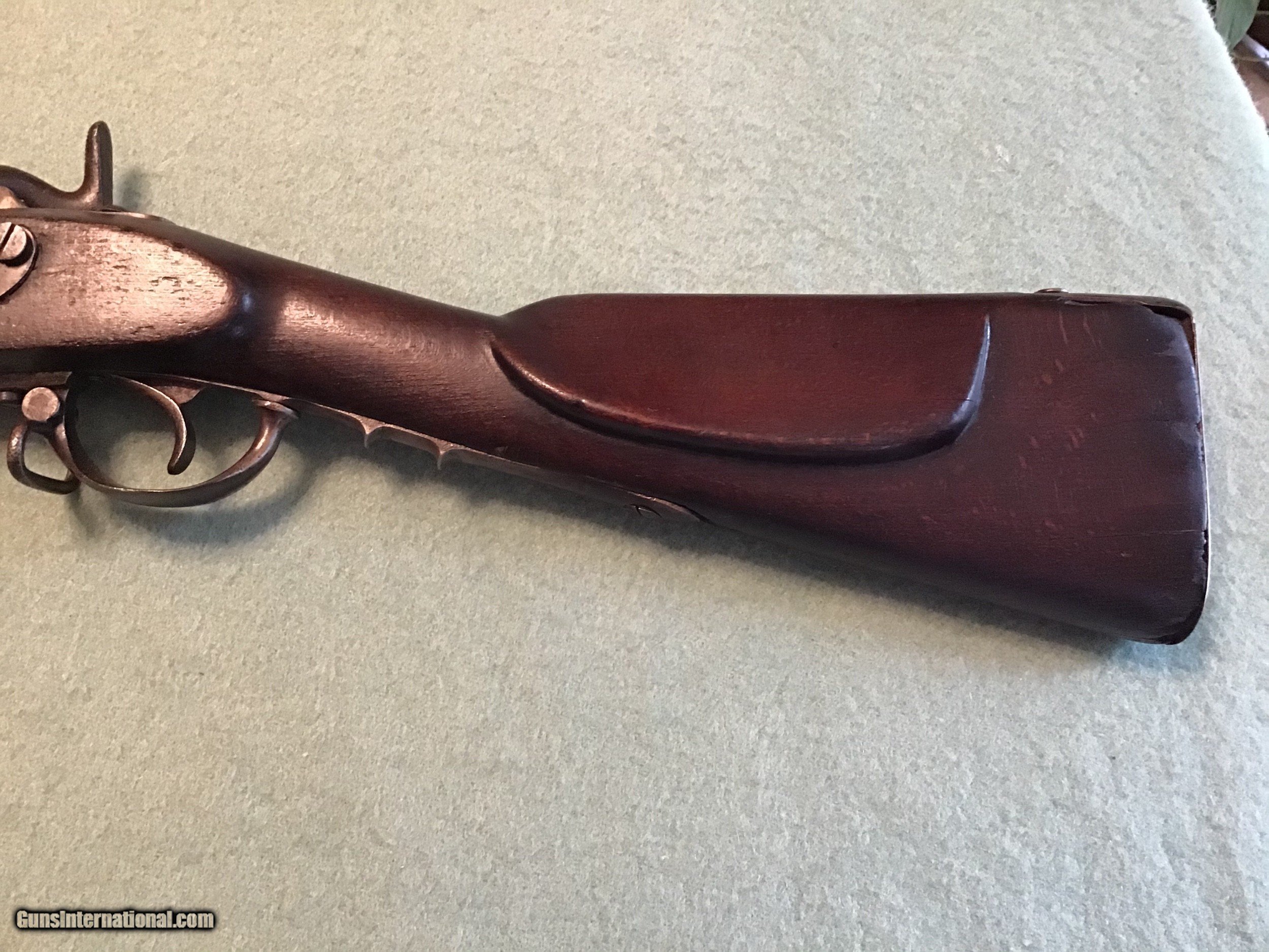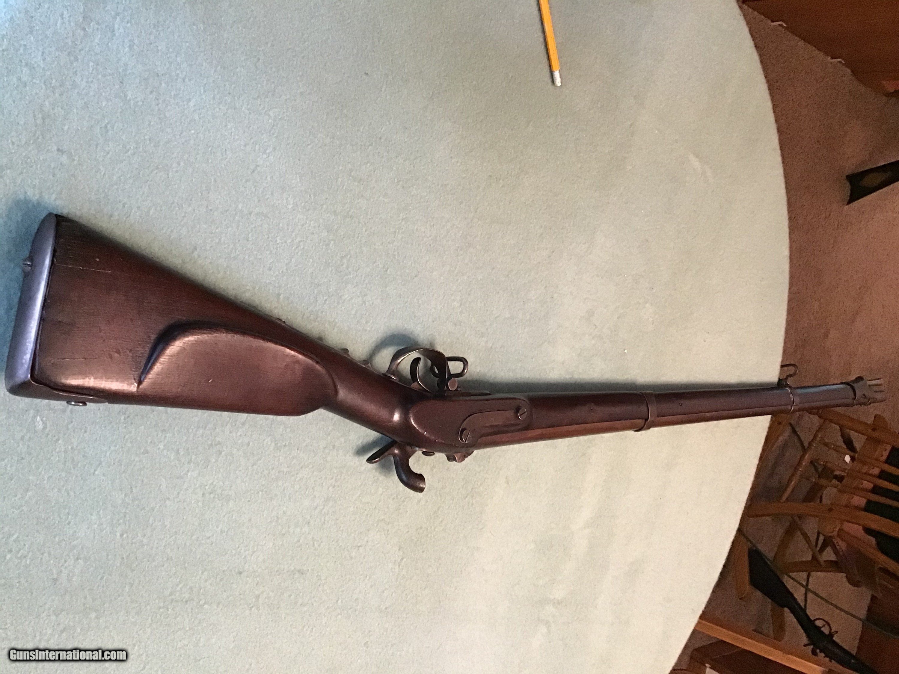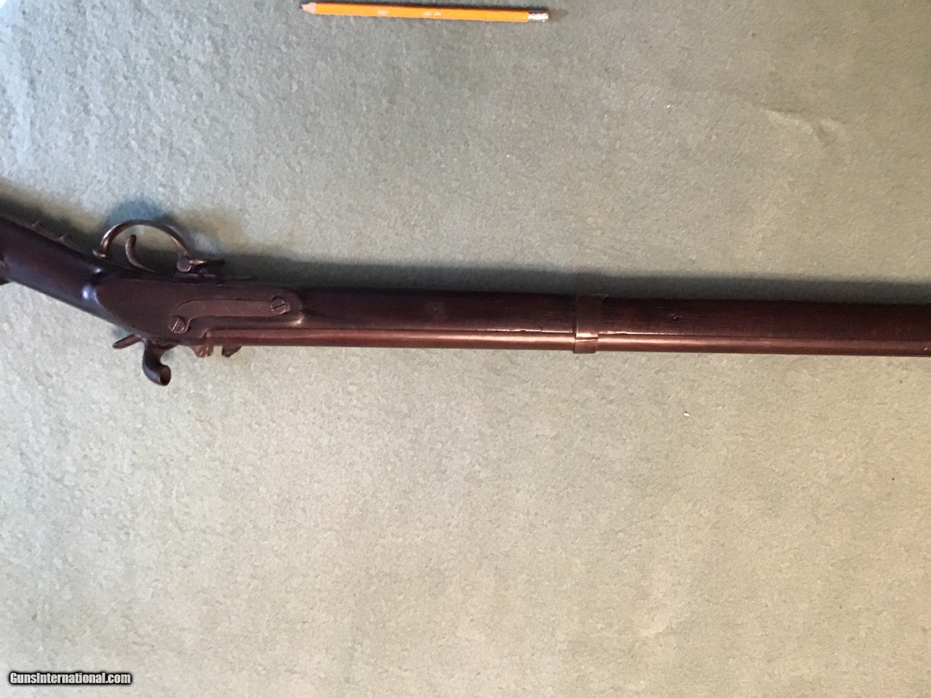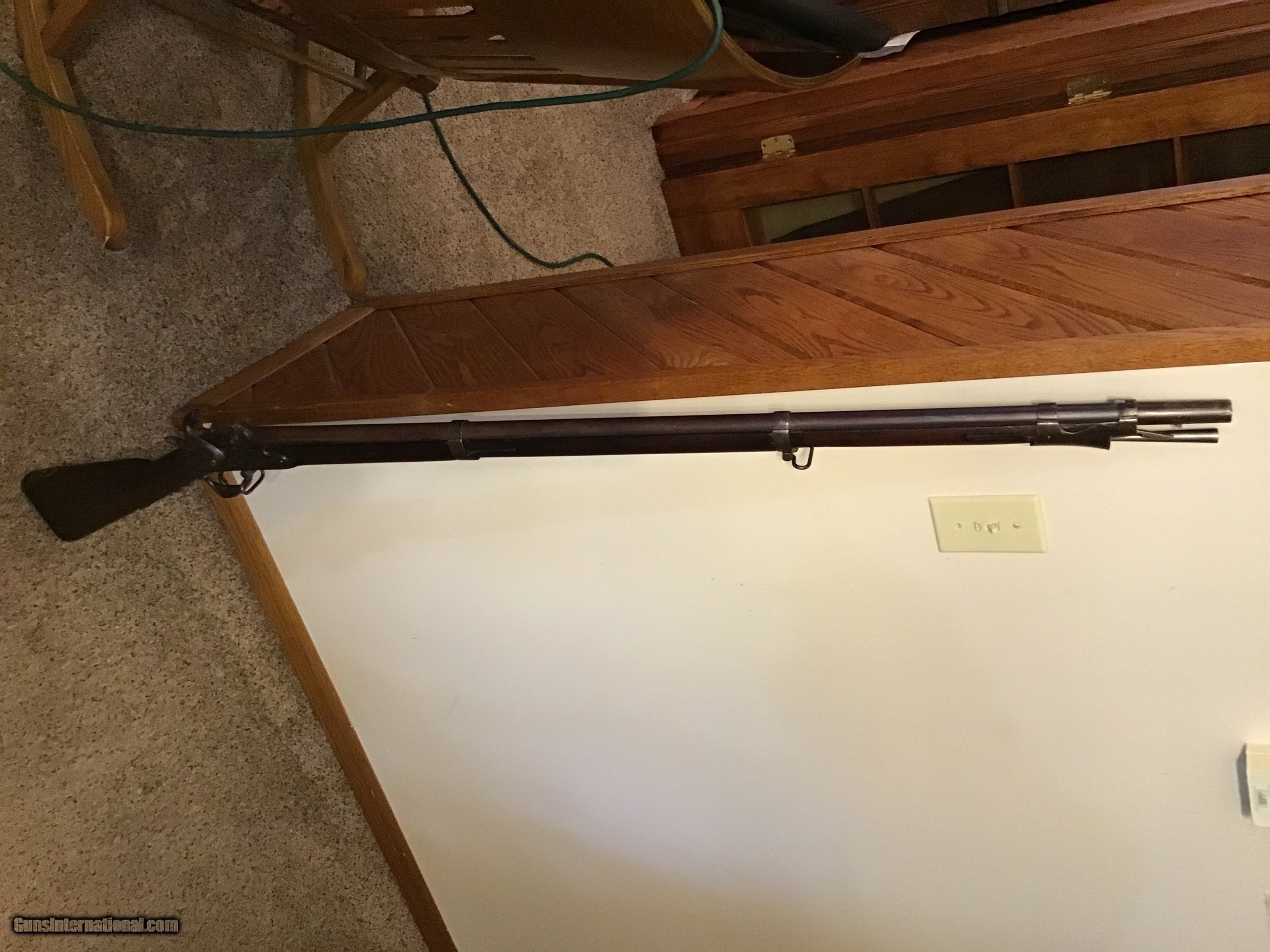 Description: On Hold Sale Pending Austrian M1842 Civil War import percussion approximately 70 caliber musket originally issued in tube lock and converted to percussion in the 1850s and most likely sold to the US or confederacy for use during the civil war. The lock is dated 1851 and functions fine. The full length barrel has the tang mounted rear sight and band front sight. The dark full 3 band wood stock is very good. All metal parts have smooth brown patina.. This musket appears complete with sling swivels and ramrod in very good original condition. Please feel free to contact me with any questions. Shipping will be actual cost approximately $50.00. On Hold Sale Pending SOLD Antique: Yes Manufacturer: Austrian Model: M1842 |