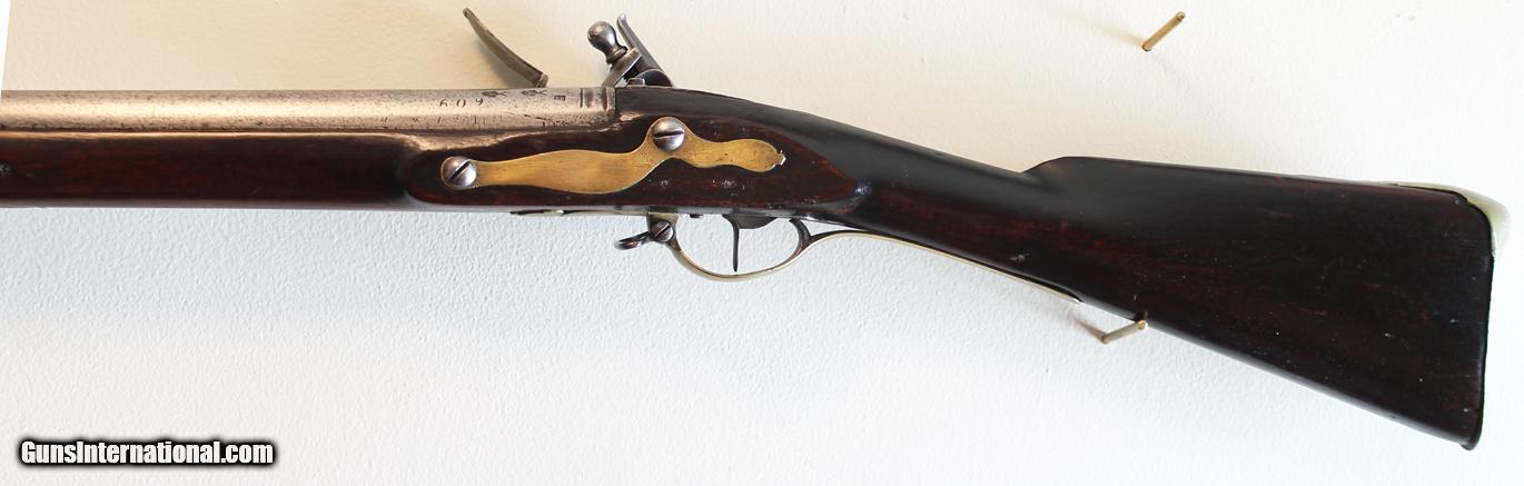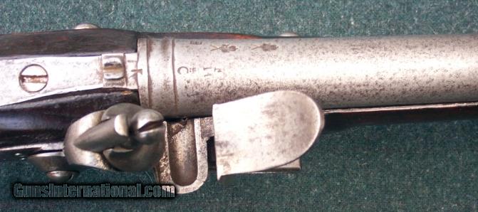 Description: Brown Bess in the Marine/Militia pattern, made under European contract. The British frequently ran low on muskets, especially after our Revolution, and on more than one occasion contracted with northern European countries for Brown Bess pattern muskets and pistols. This Brown Bess was made under the so-called "Belgian" contract. The proof marks might indicate it was actually made in Denmark. European contract Brown Bess muskets did not always well follow the pattern exactly. This one is in the Marine & militia pattern, developed during the 7 Years War (our French & Indian War). I personally believe it is Napoleonic periord. The flat side plate and the screw in the butt-plate tang conform to this Marine Militia pattern, ref The Brown Bess, Erik Goldsteim & Stuart Mobray. Differences from Tower made guns of this pattern are in the butt-stock shape, the barrel length of 36" and the addition of a rear sight. The standard British military practice was for the line to present arms at the enemy and fire on command. They generally did not actually aim, and Tower muskets had no rear sight. The stock of this musket has slight cast-off, and the sights line up well. It may have been made for use by skirmishers. "G" over "19" is stamped on the ramrod. The .80 caliber barrel is marked with the Birmingham proofs used for foreign made barrels, with "609" followed by "SS", and a set of European proof marks which I cannot read. It is these proofs that might be Danish. Stock appears to be walnut. Mechanically excellent, complete with sling swivels, what looks like the original ramrod, and a very strong main spring. The Englishman from whom I bought it said he got it in Sweden. The story he gave me was in 1808 the Russians let a large contract for arms with Sweden. In order to meet delivery the Swedes had to strip their own arsenals of guns. Then the Russians not only did not pay for the guns, they attacked Sweden. Sweden asked the U.K. for weapons, got 10,000 Brown Bess muskets and 5,000 1796 Heavy Cavalry swords. Condition: Very Good to Fine, save for one chip out of the butt, shown. Please add $35 shipping, continental USA Payment certified check or money order. SOLD Antique: Yes Caliber Info: .80 Bore: smooth |